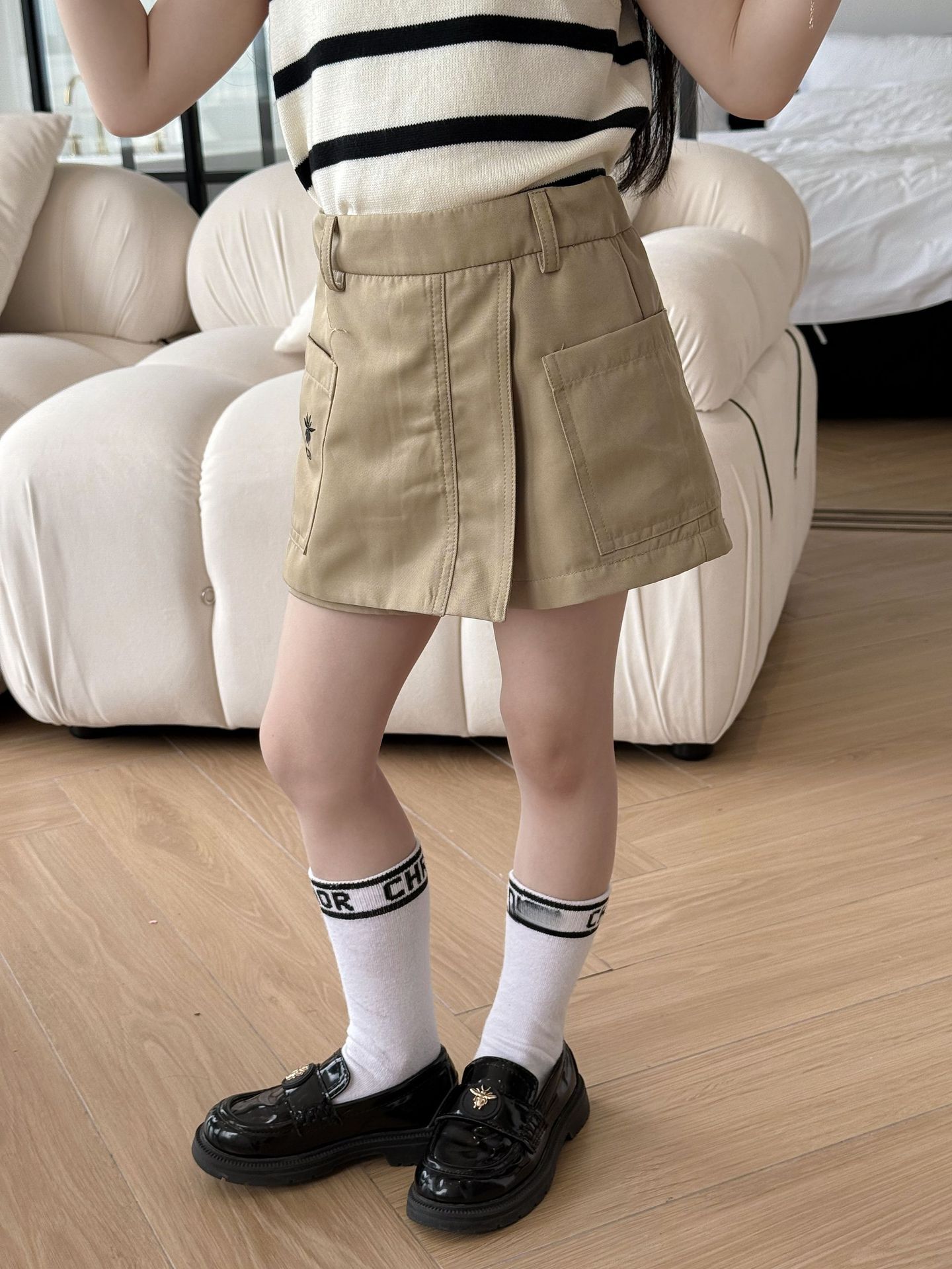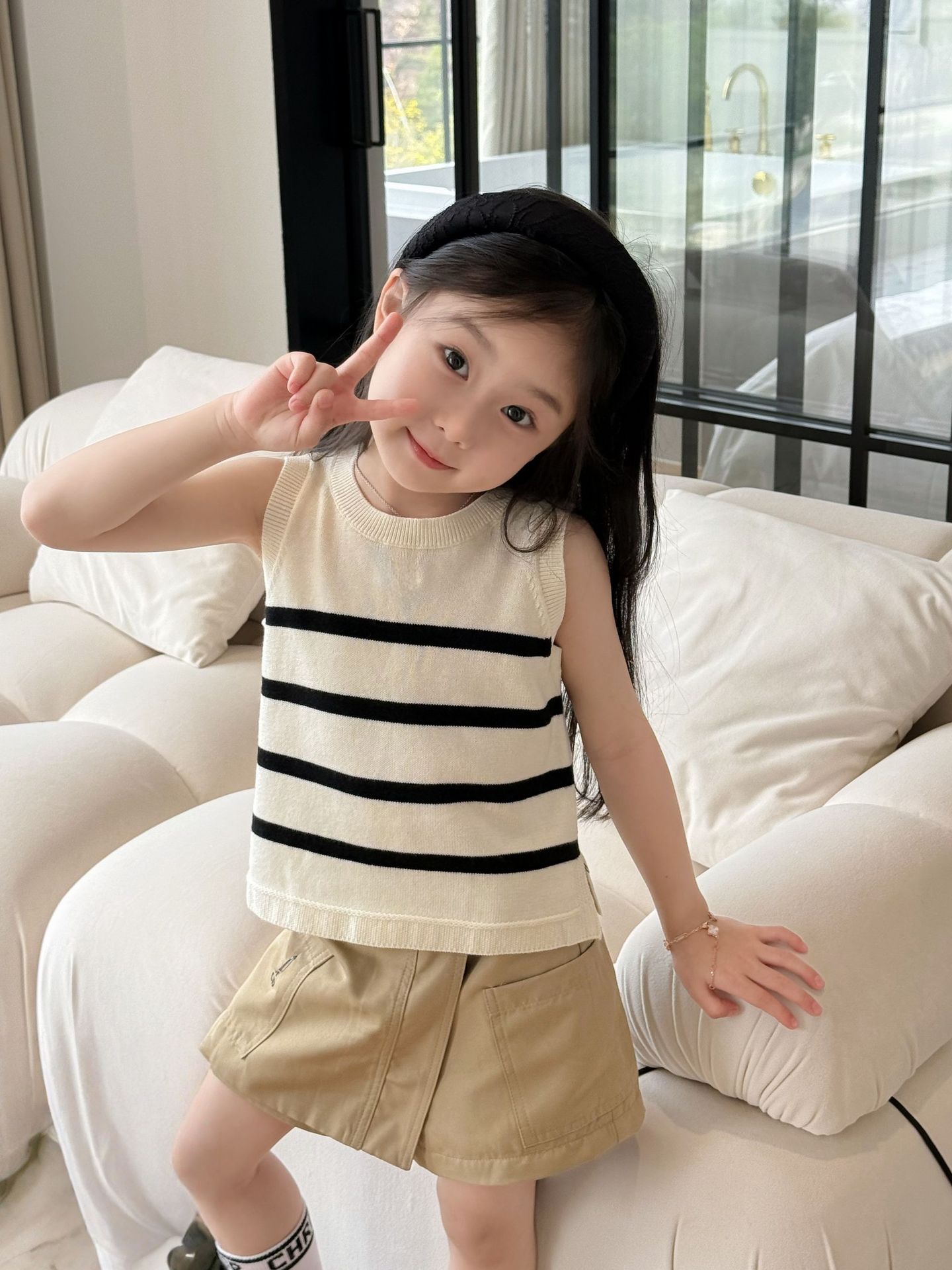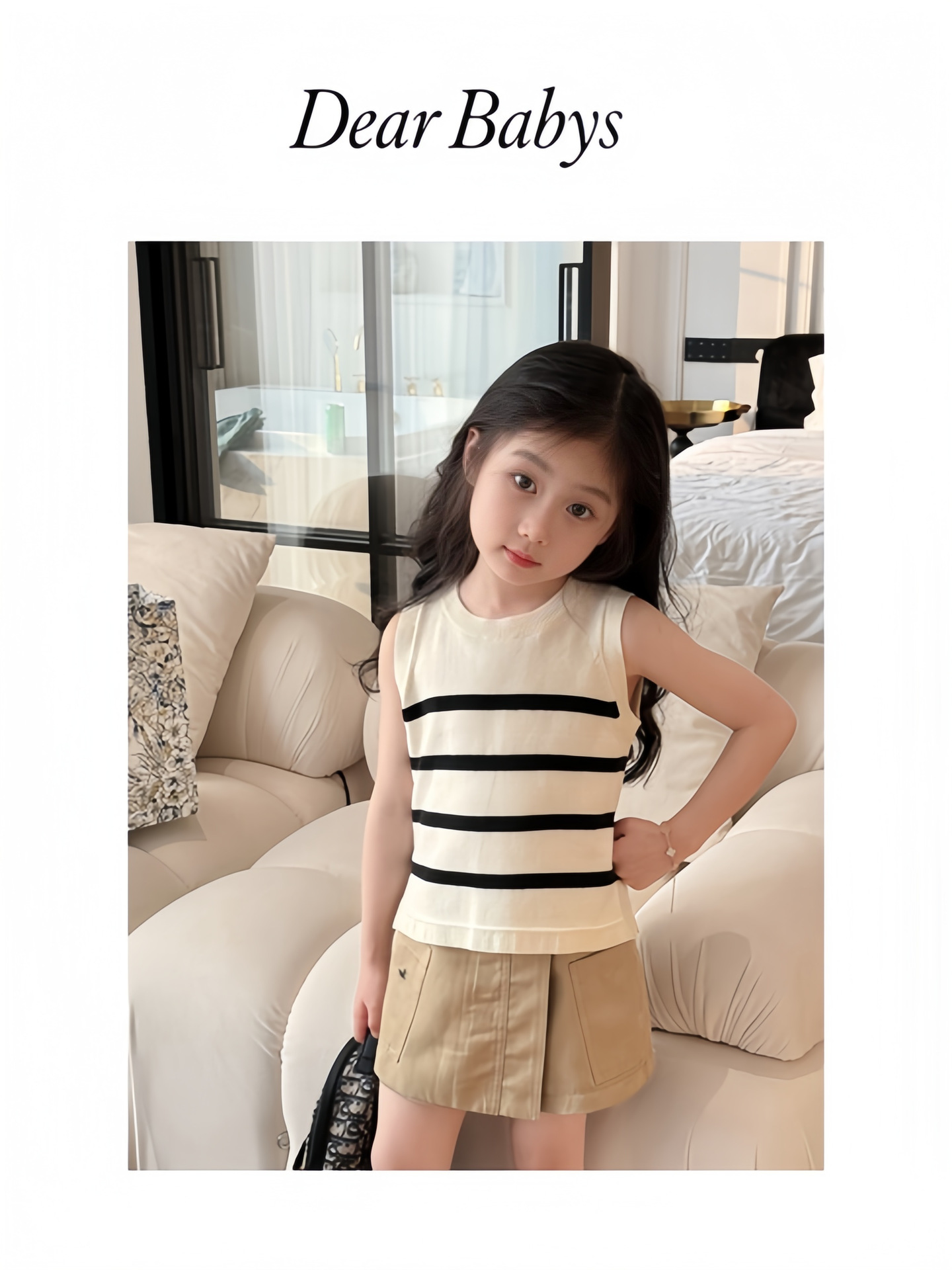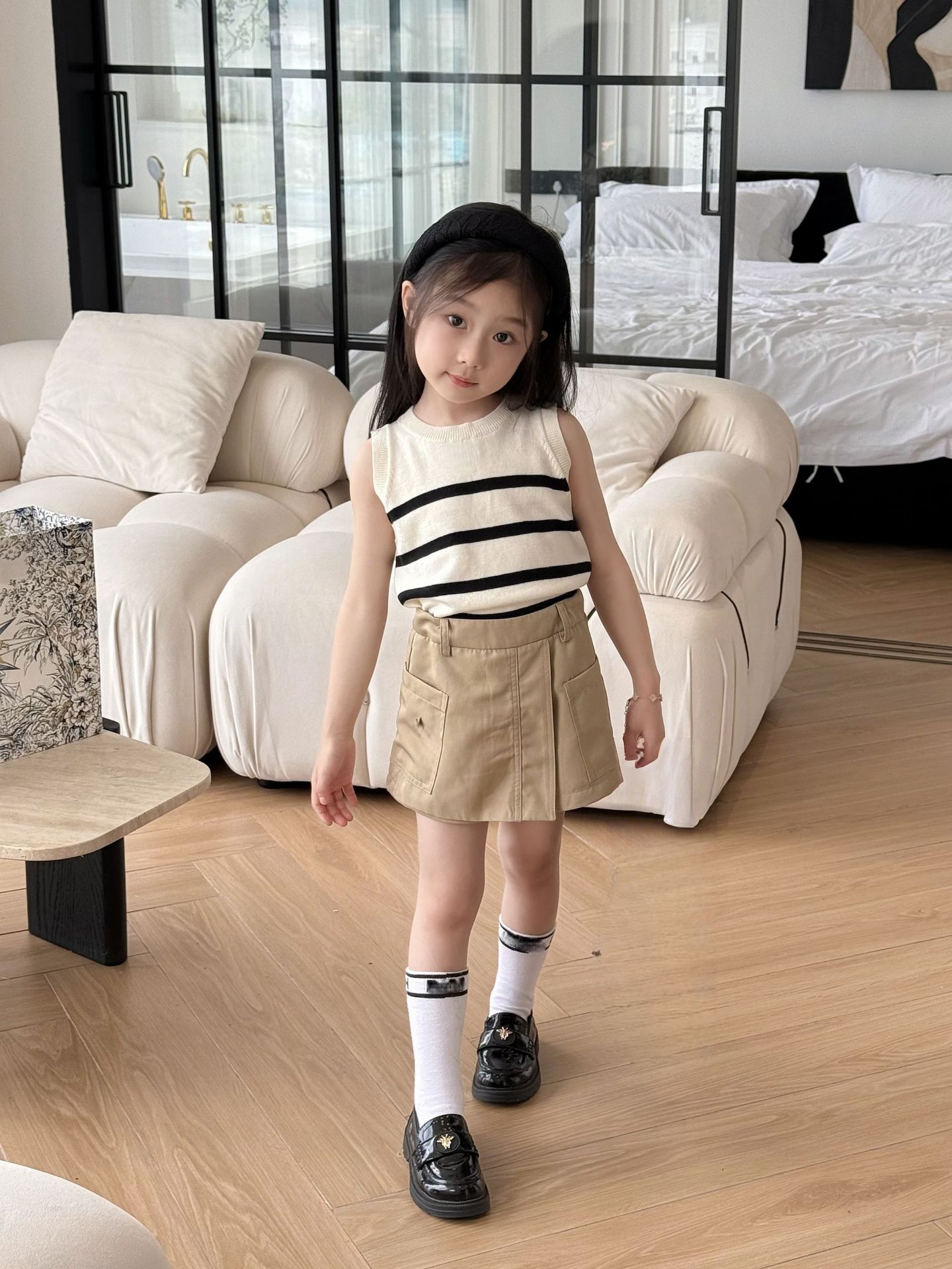25 봄과 여름 소녀 쌀 검은 줄무늬 니트 꿀벌 자수 분할 조끼➕꿀벌 수 놓은 불규칙한 컬로 트