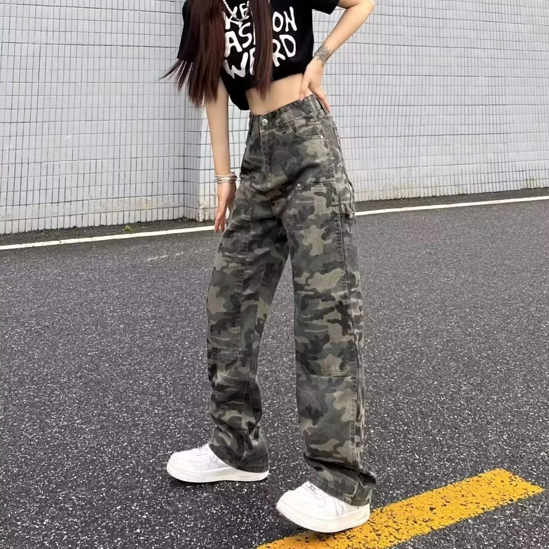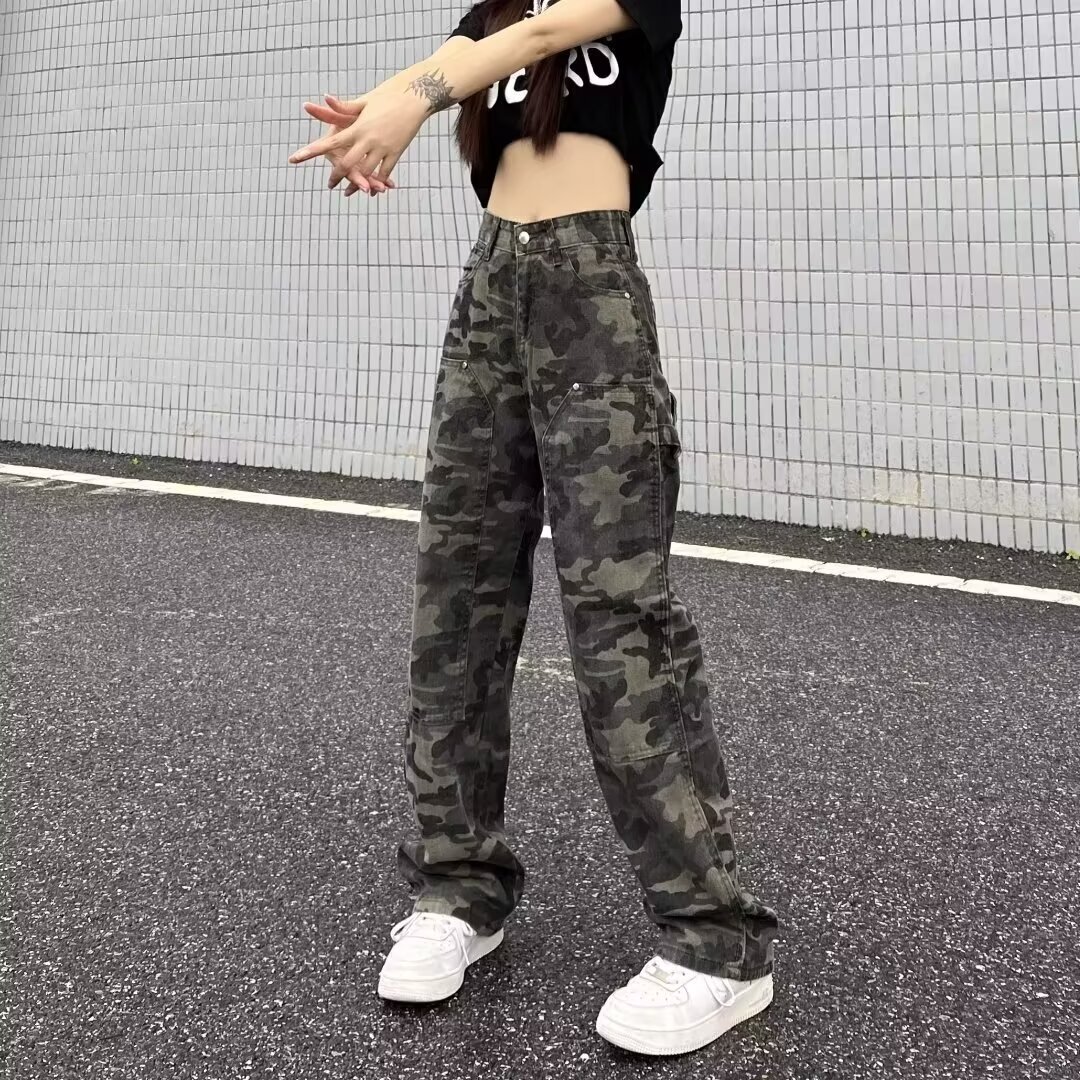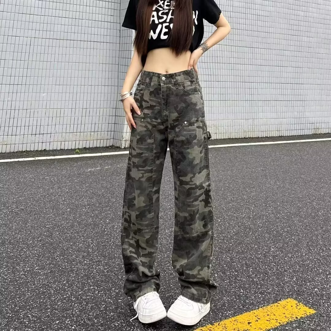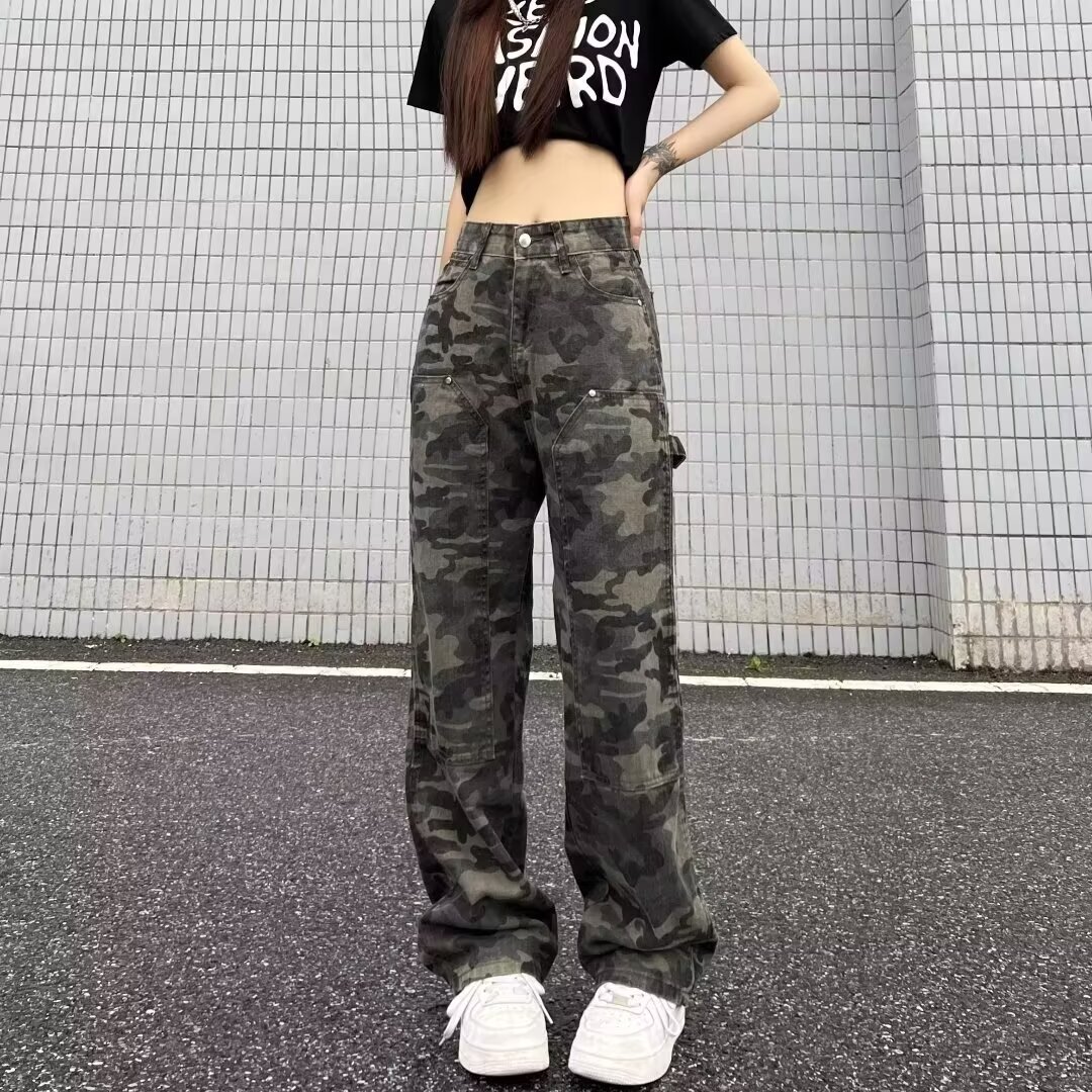 미국 스타일, 빈티지 위장 오버롤 트렌디 스트리트 느슨한 스트레이트 데님 바지 남녀