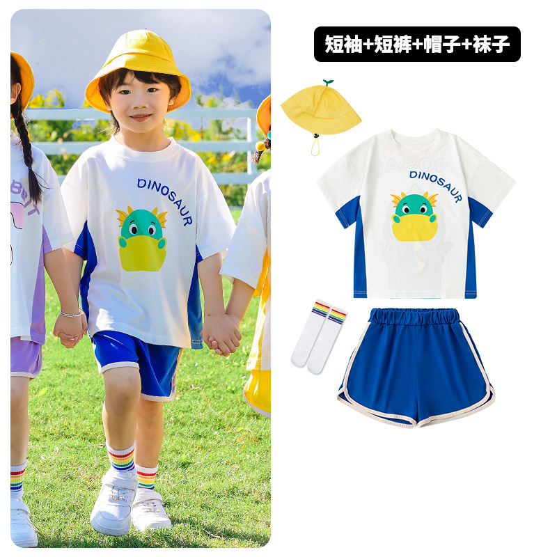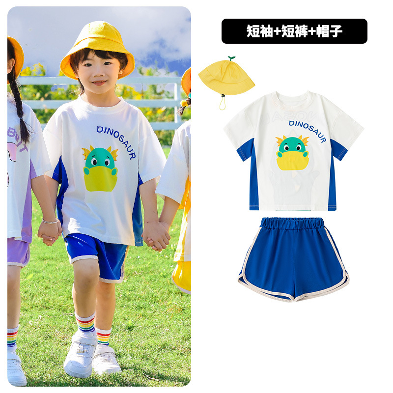 • 정장 [753D 공룡 반팔 + 611D 파란색과 흰색 반바지] + 노란색 어부 모자