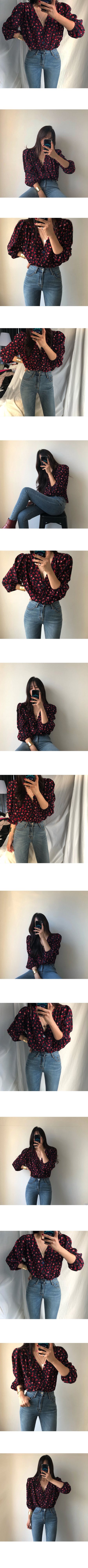 한국 인 프랑스 빈티지 프린트 셔츠 낮은 V-넥 버튼 퍼프 슬리브 쉬폰 탑스토어 가기