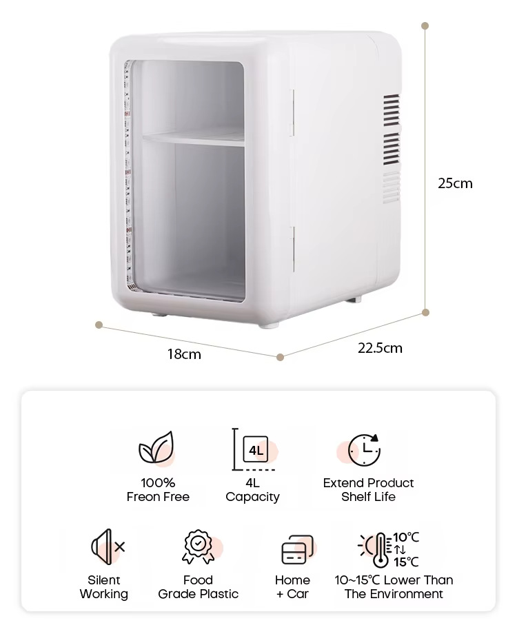 小巧精致的经典基础机型,4L 紧凑容量搭配通透透明门体,内部存放物品一目了然,收纳展示兼顾一体。机身轻薄不占空间,可灵活摆放桌面、车内、宿舍角落,内部隔层可自由调节,能有序收纳饮品、护肤小样、零食小件,制冷运行稳定,日常基础冷藏需求均可满足,百搭适配多种使用环境。