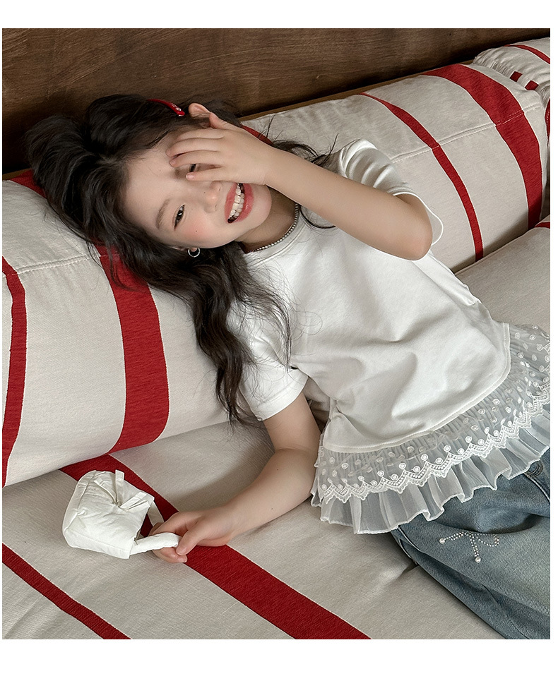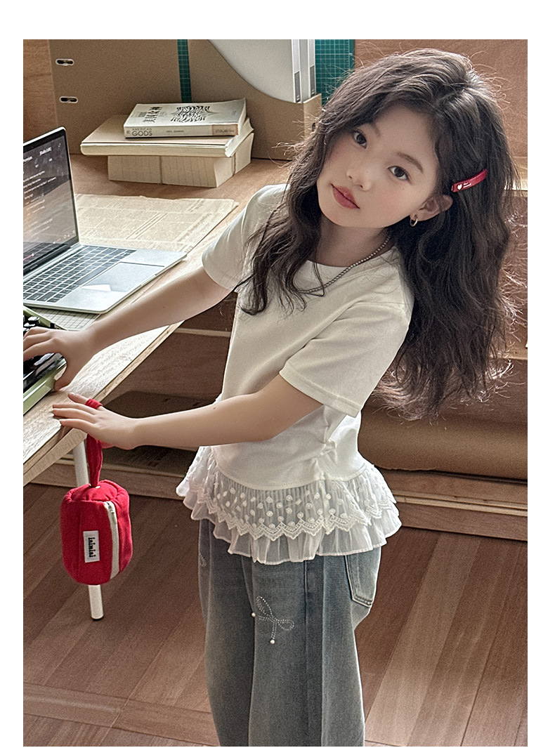 여자 반팔 세트 스위트 스파이스 레이스 반팔 티셔츠 다이아몬드 보우 청바지 투피스 2025스토어 가기