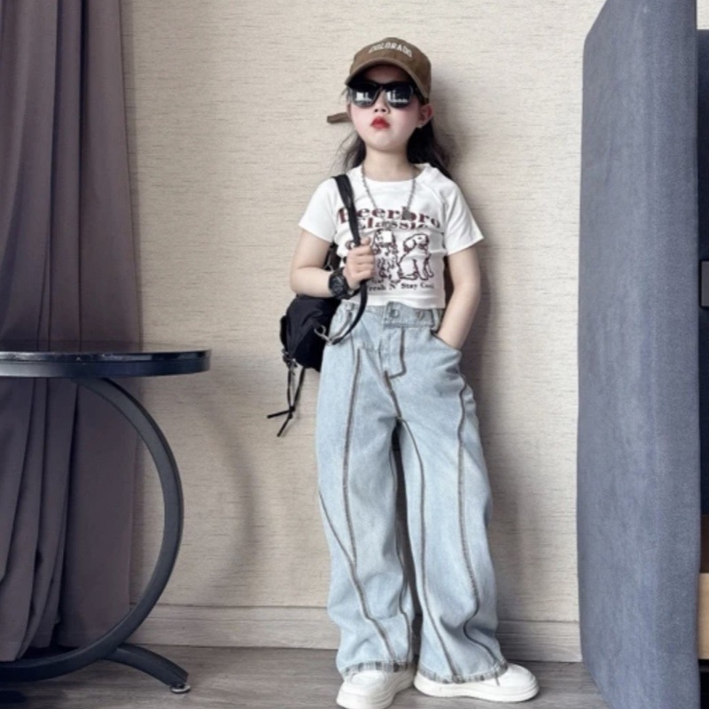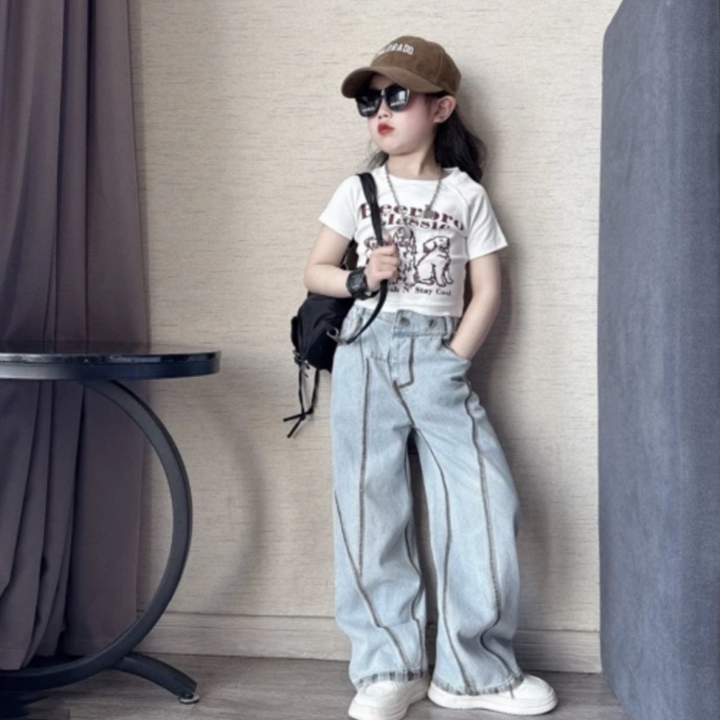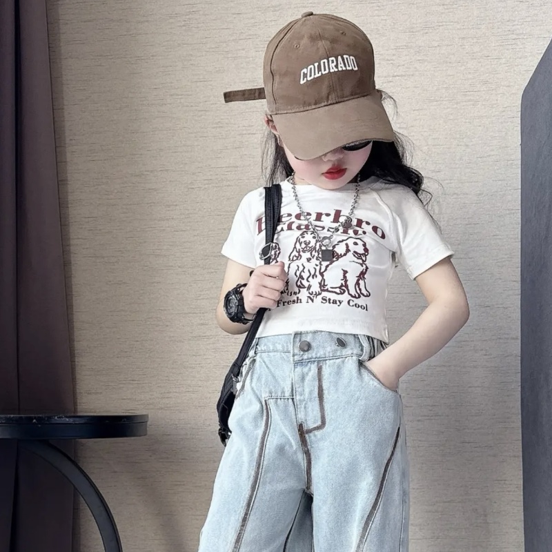 소녀 한국식 만화 짧은 티셔츠 세트 여름 신식 어린이 올매치 데님 와이드 레그 바지 투피스 세트스토어 가기