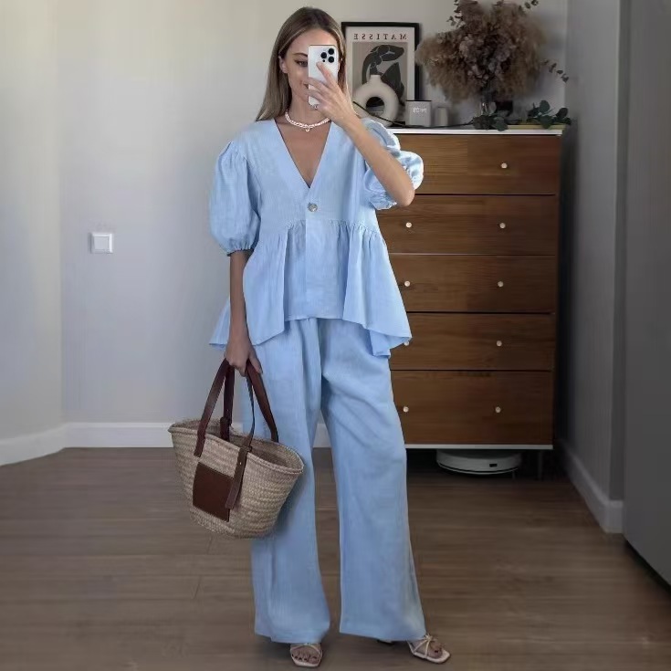2025 프랑스 달콤한 분위기 단색 V 넥 버블 짧은 소매 레이스 업 바지 세트 대외 무역 국경 여성 의류 배치스토어 가기