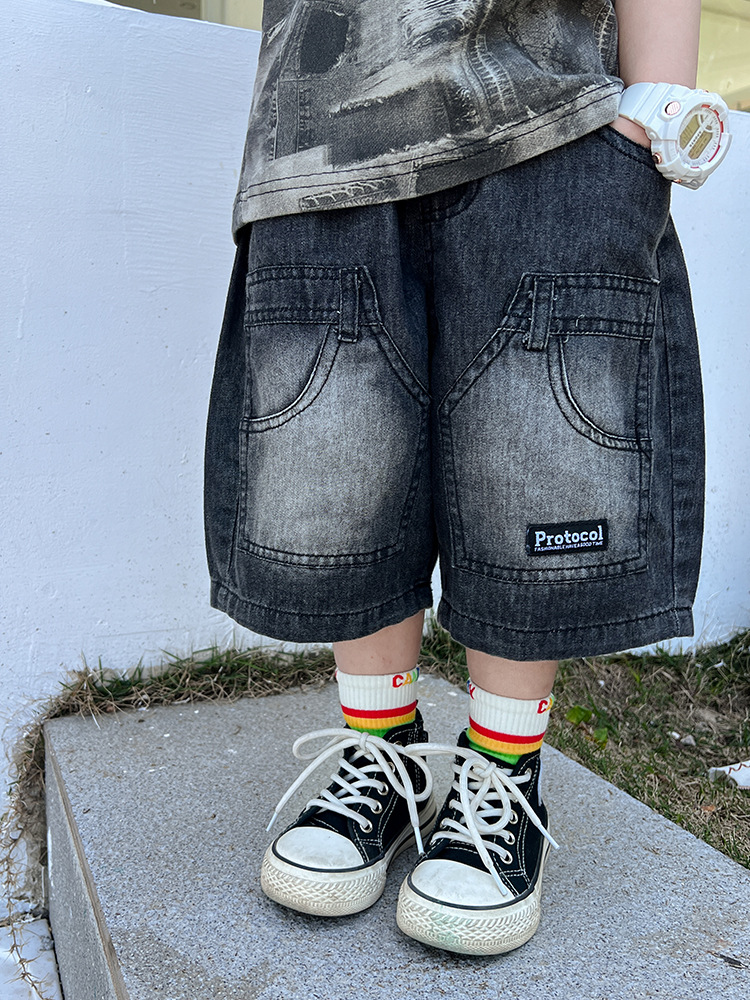 두꺼운 어린이 데님 반바지 미국 빈티지 씻은 아기의 소년 소녀를위한 5 점 바지 여름 트렌디 쿨 캐주얼 바지