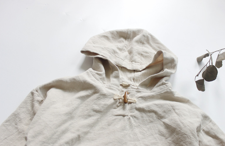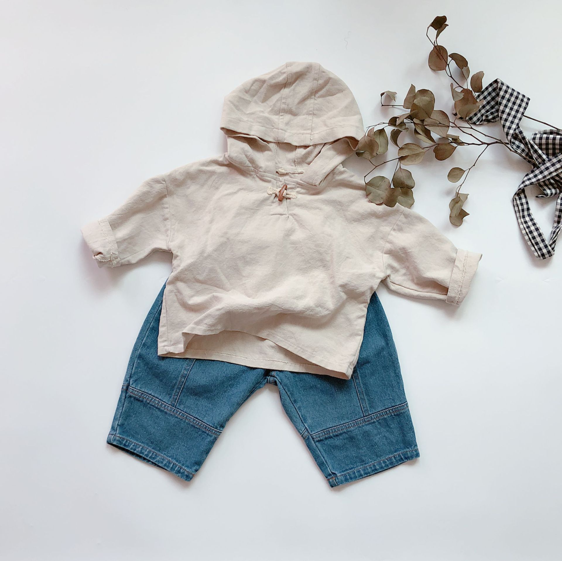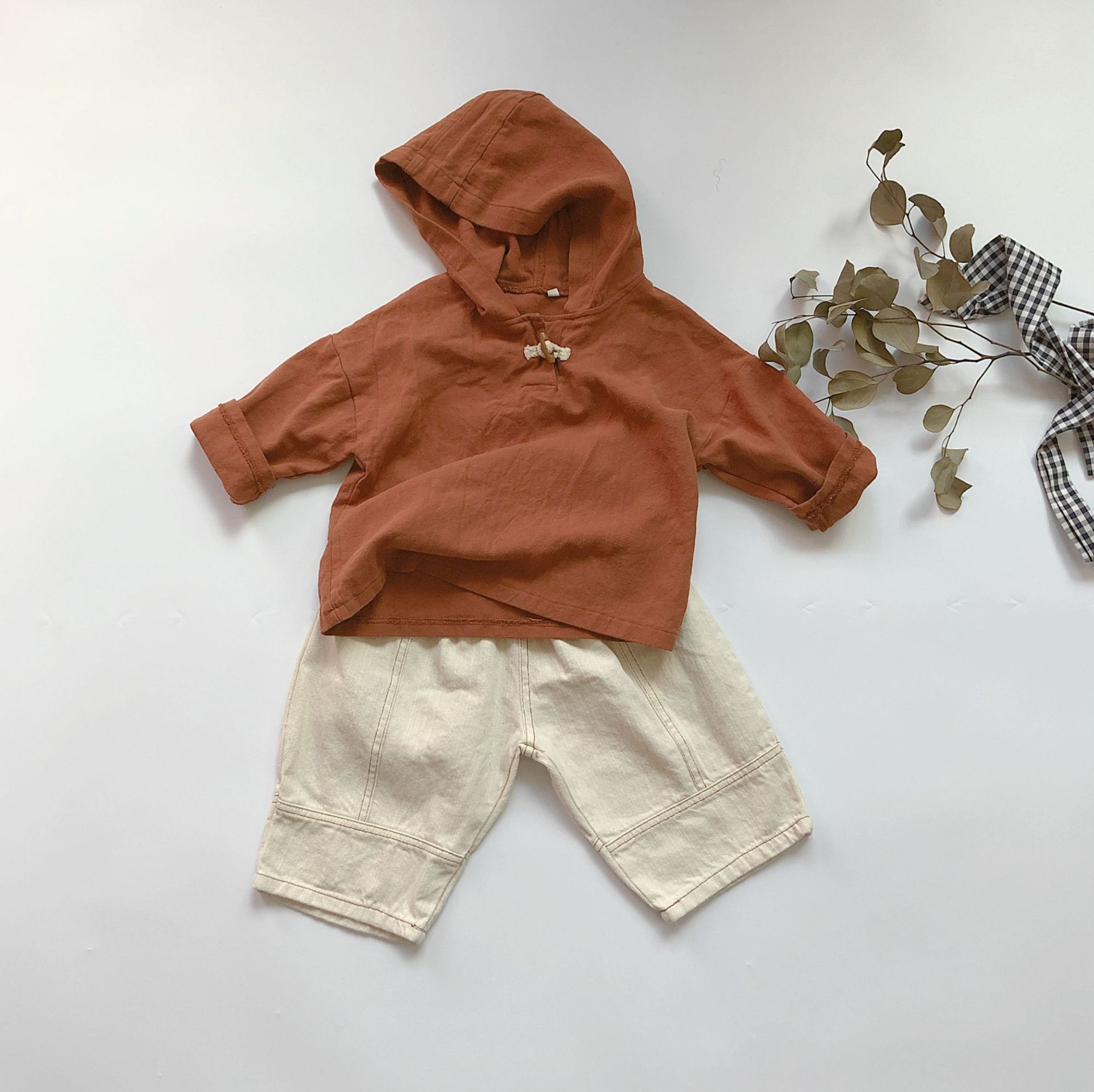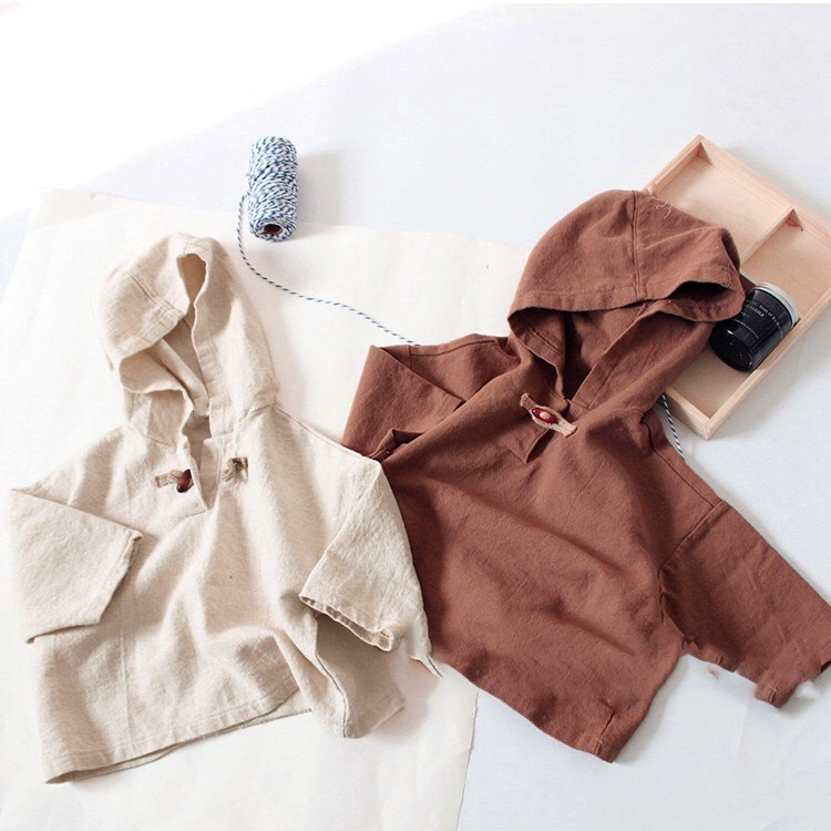 신제품 아동 코트 긴팔 봄 풀오버 소년 면 및 린넨 루즈한 한국식 여아 상의 후드 솔리드 컬러