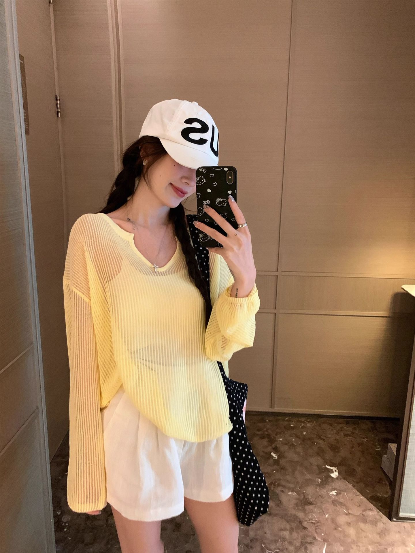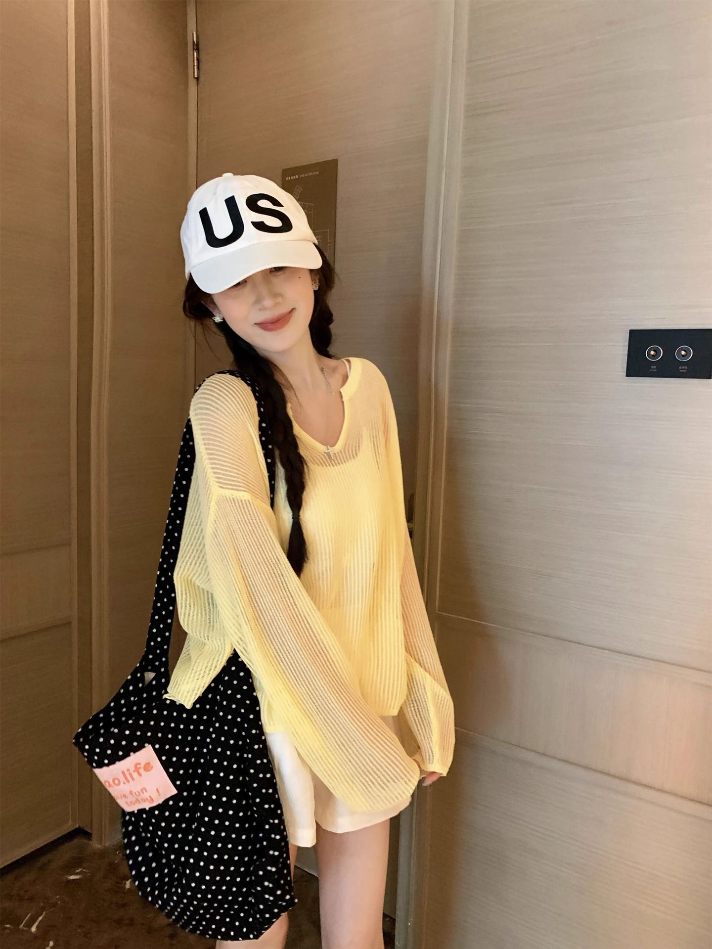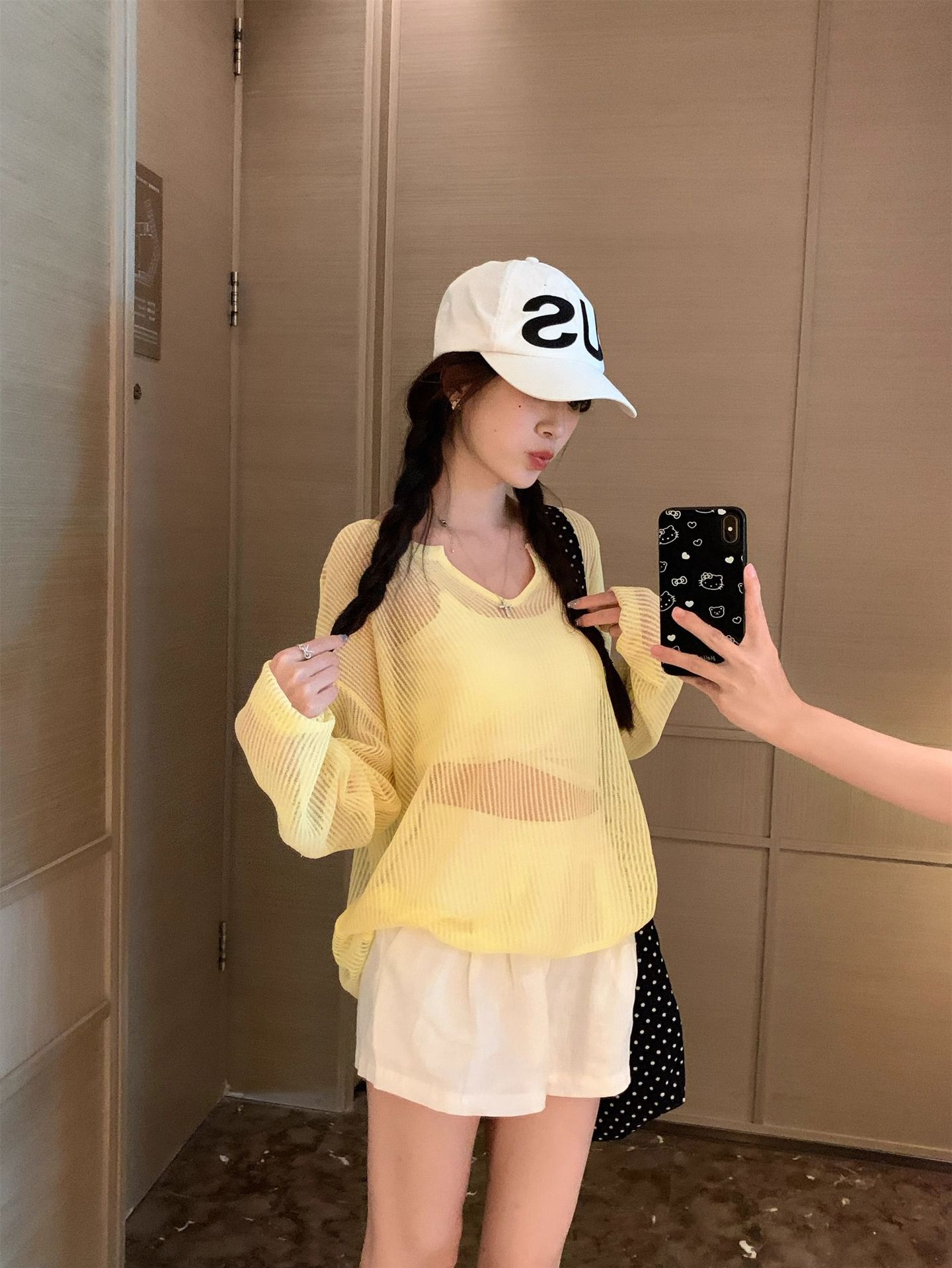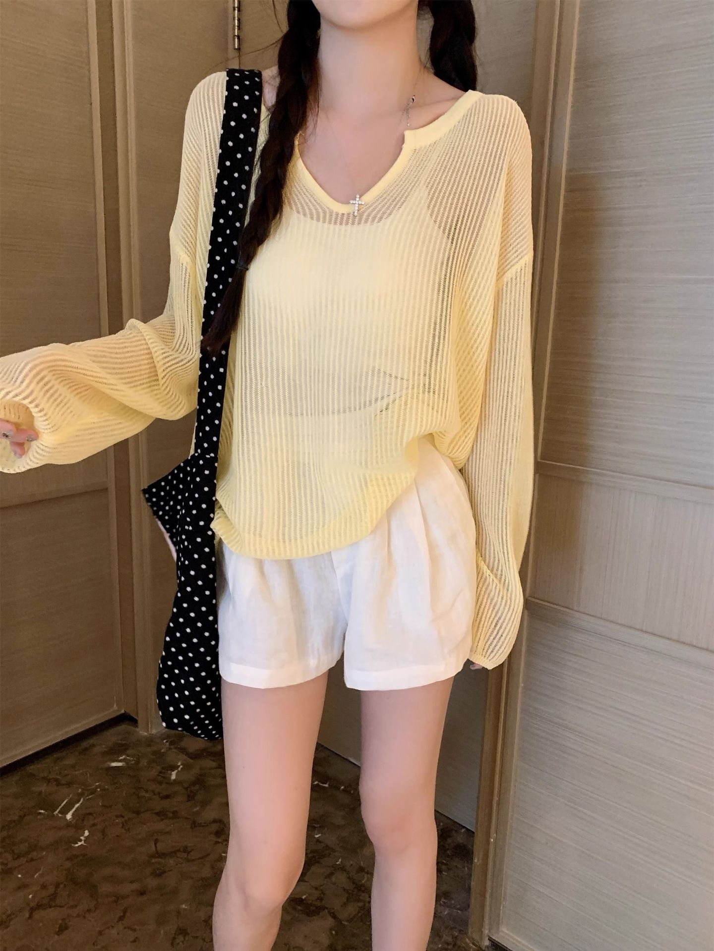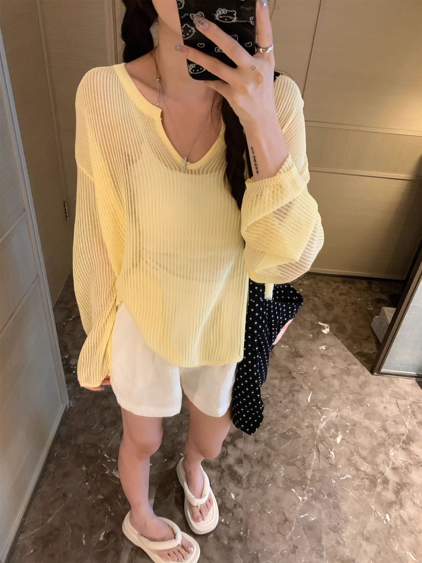 게으른 스타일 노란색 V 넥 할로우 아웃 선 스크린 블라우스 여성의 여름 얇은 관점 이완 틈새 탑 긴팔 티셔츠
