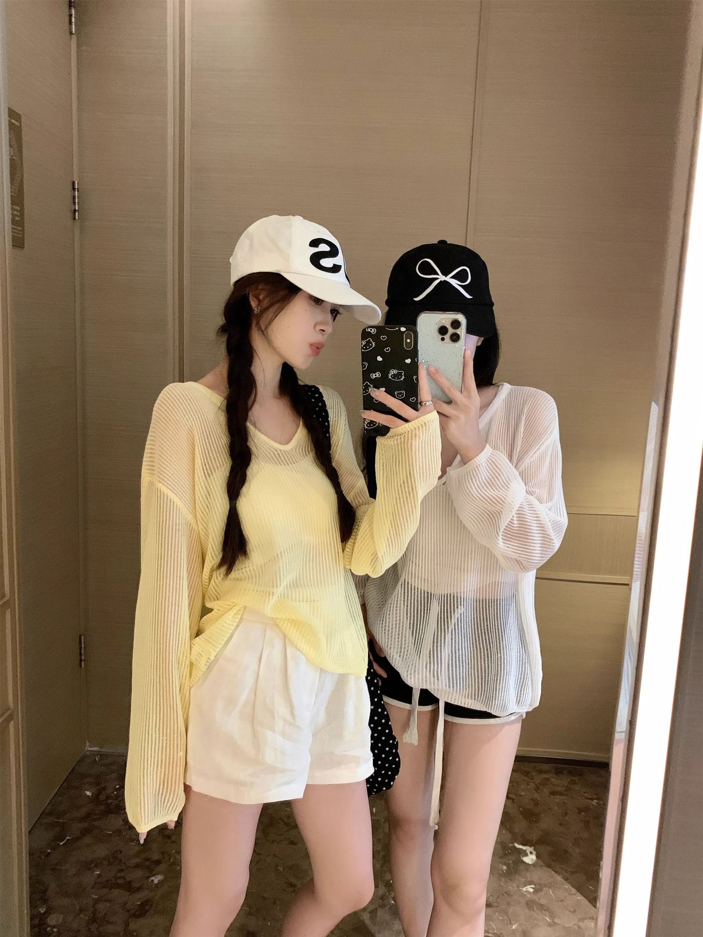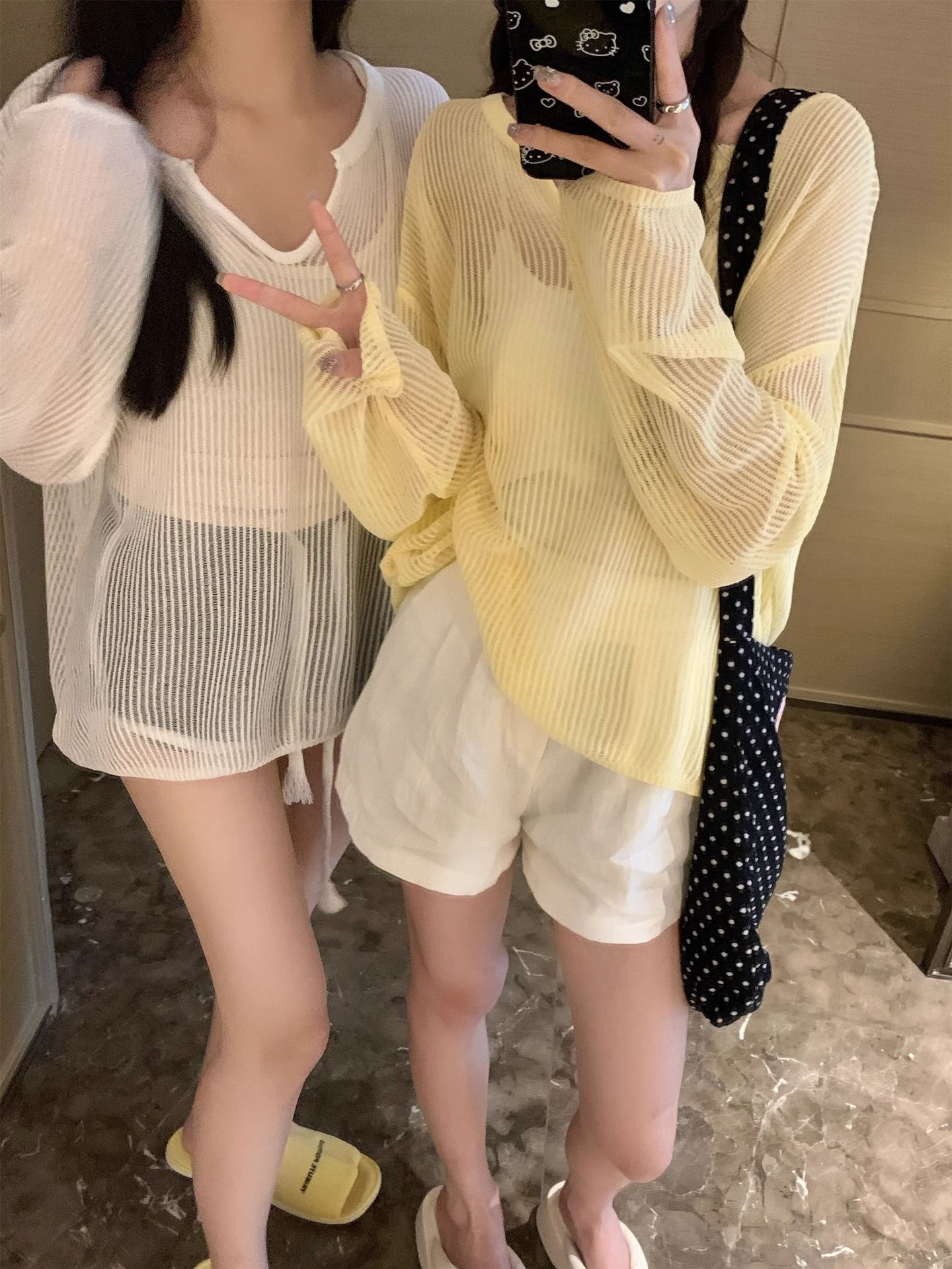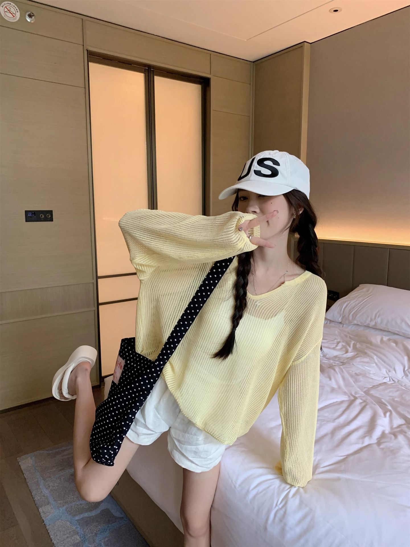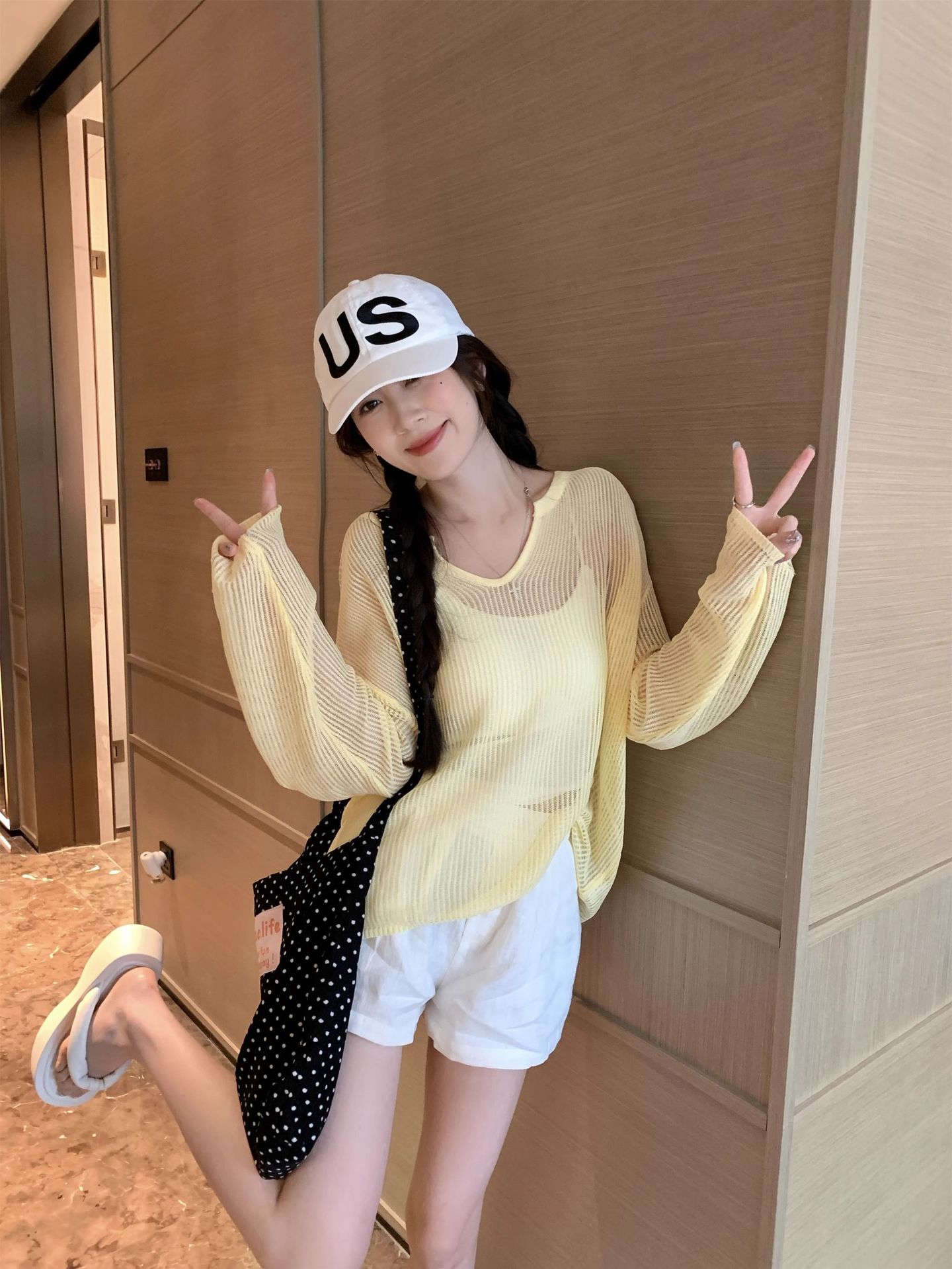게으른 스타일 노란색 V 넥 할로우 아웃 선 스크린 블라우스 여성의 여름 얇은 관점 이완 틈새 탑 긴팔 티셔츠