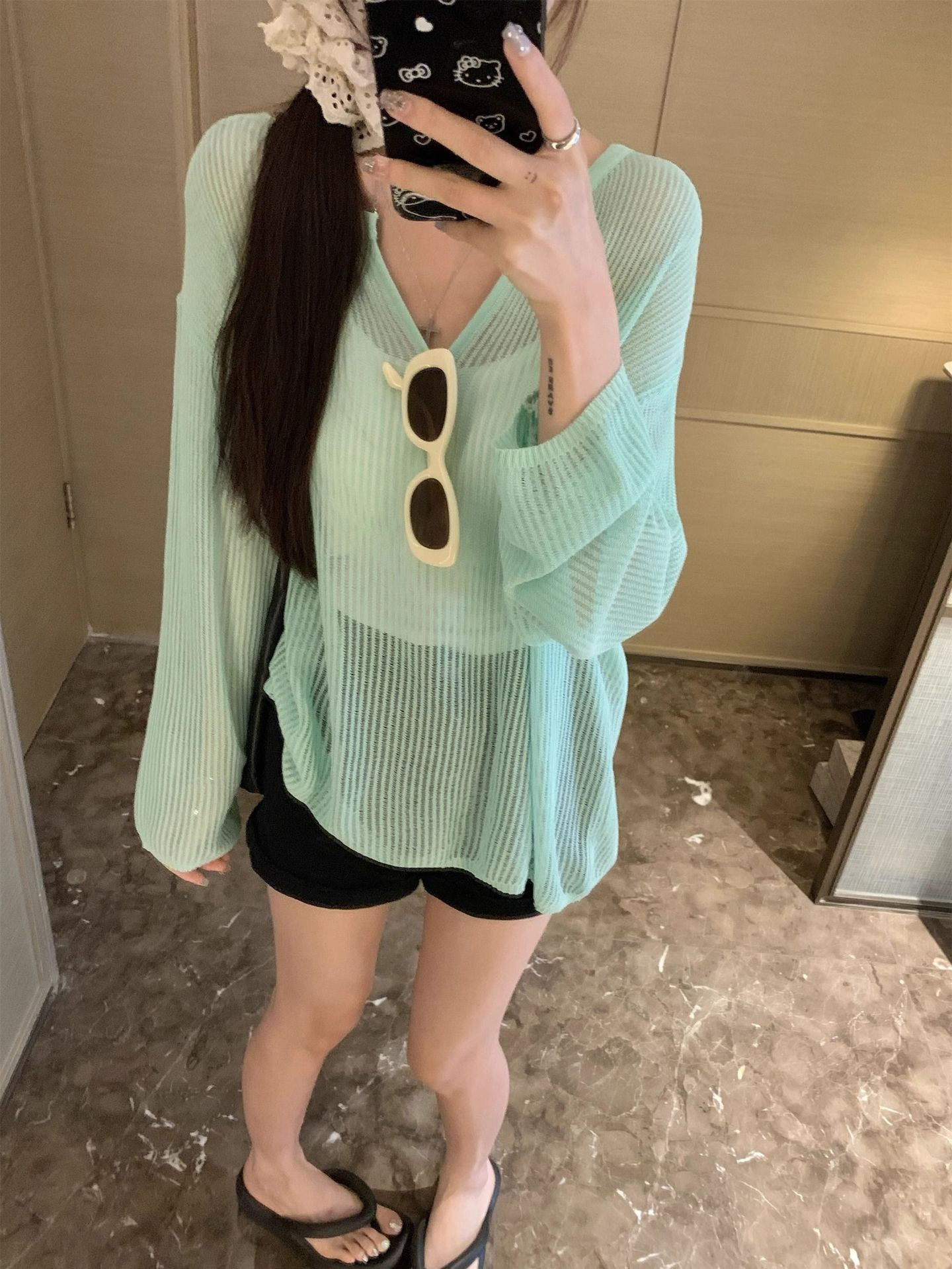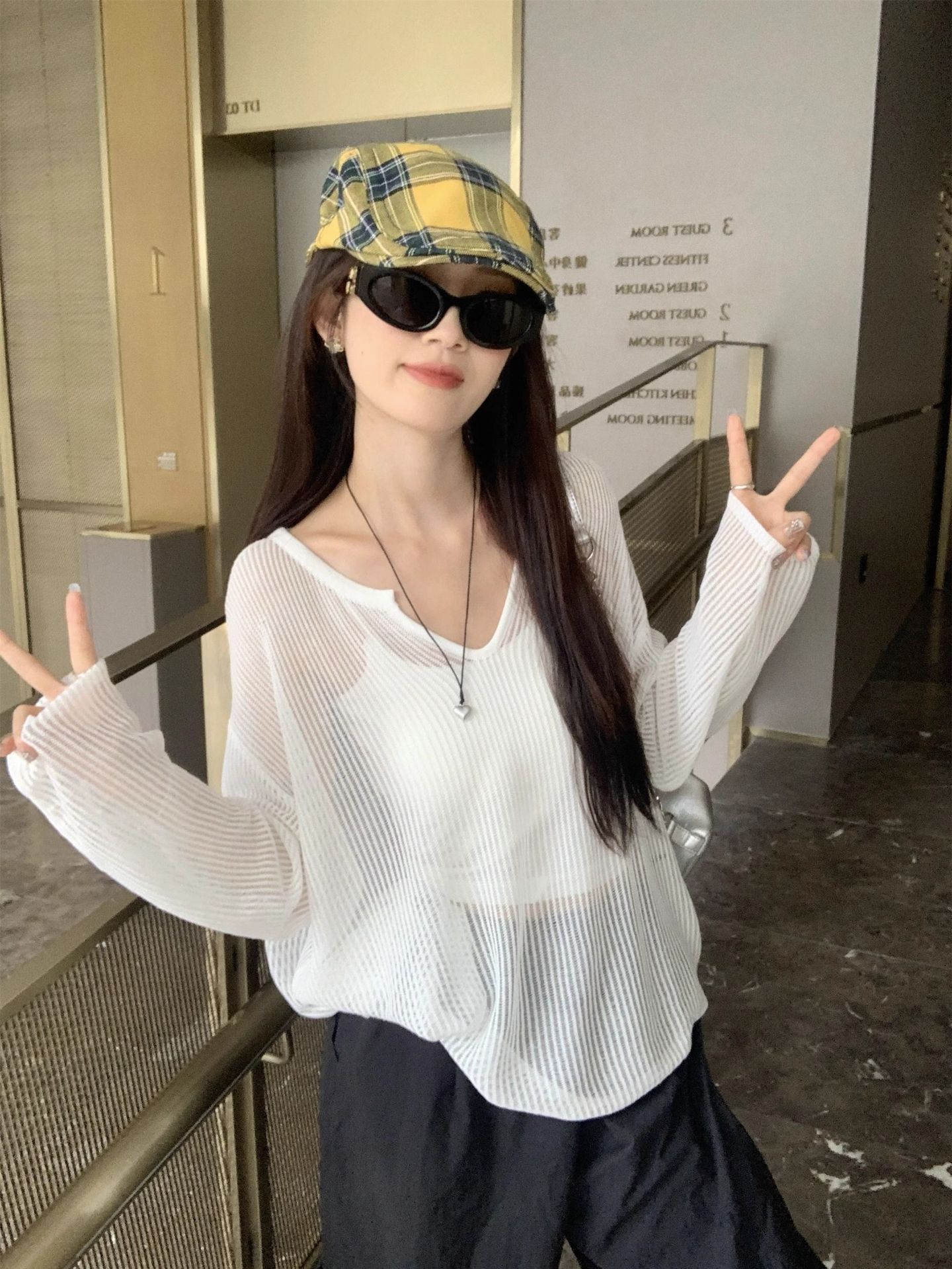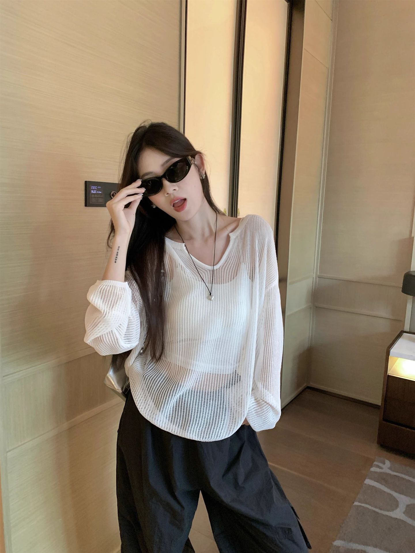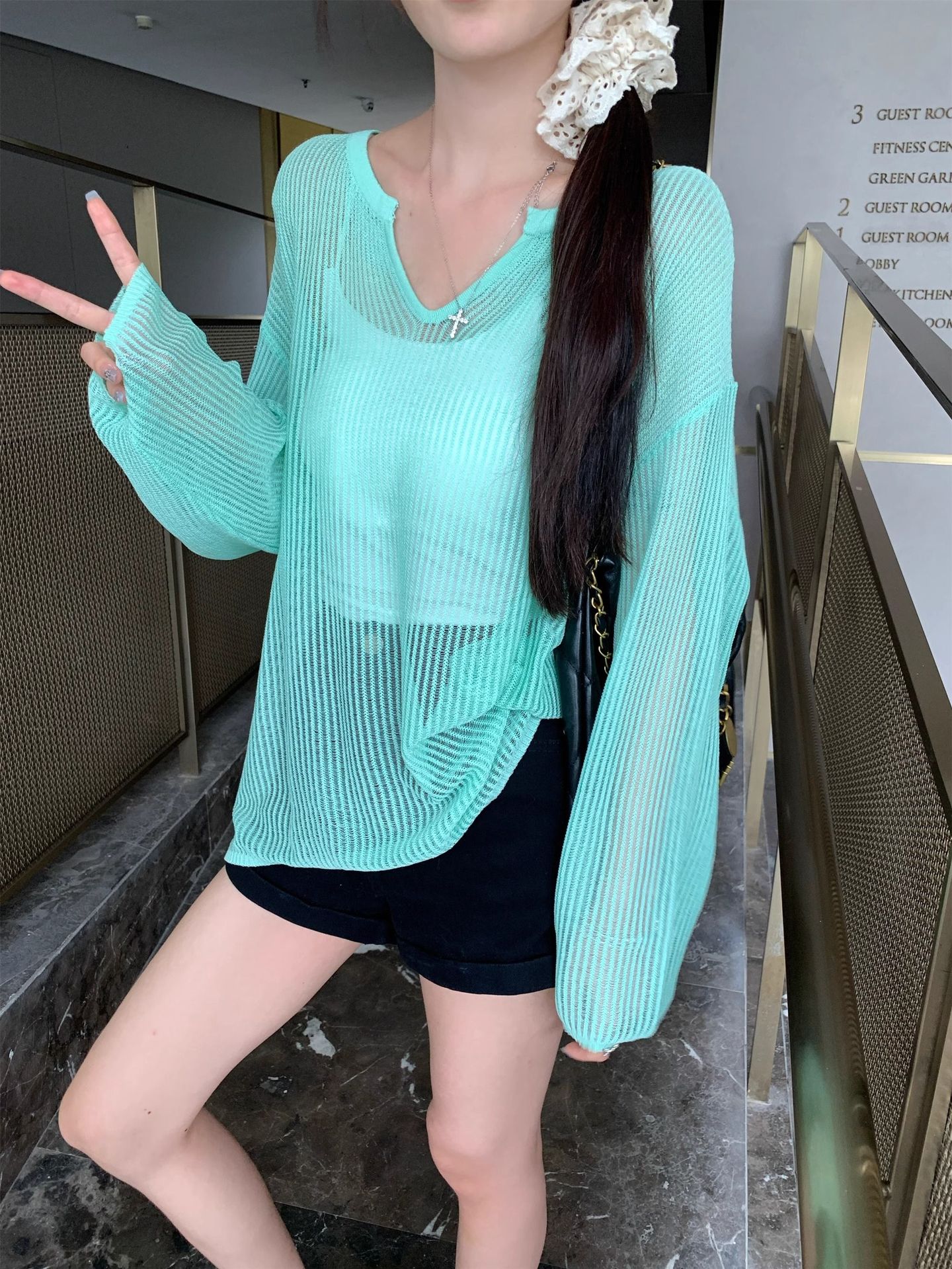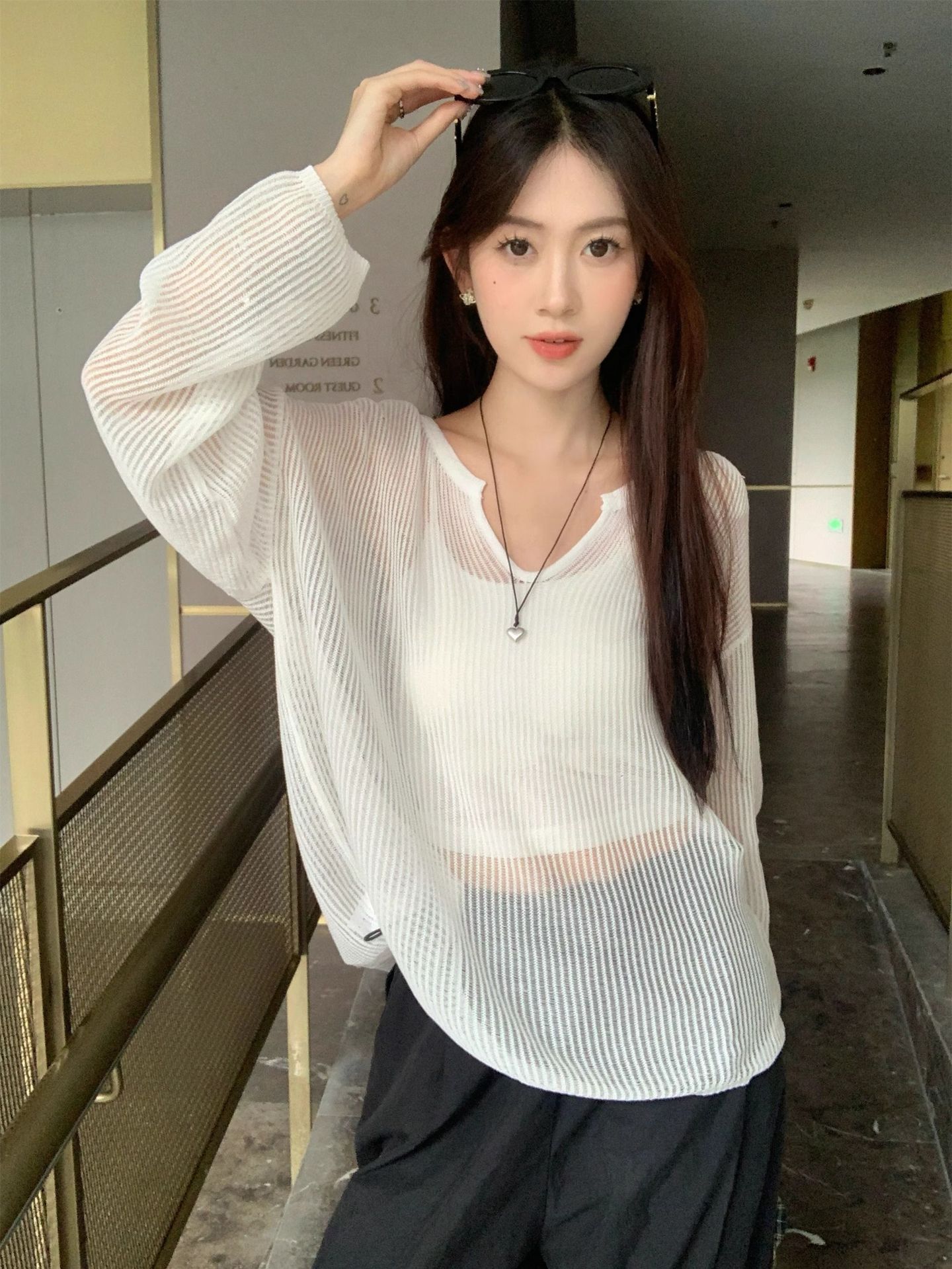 게으른 스타일 노란색 V 넥 할로우 아웃 선 스크린 블라우스 여성의 여름 얇은 관점 이완 틈새 탑 긴팔 티셔츠