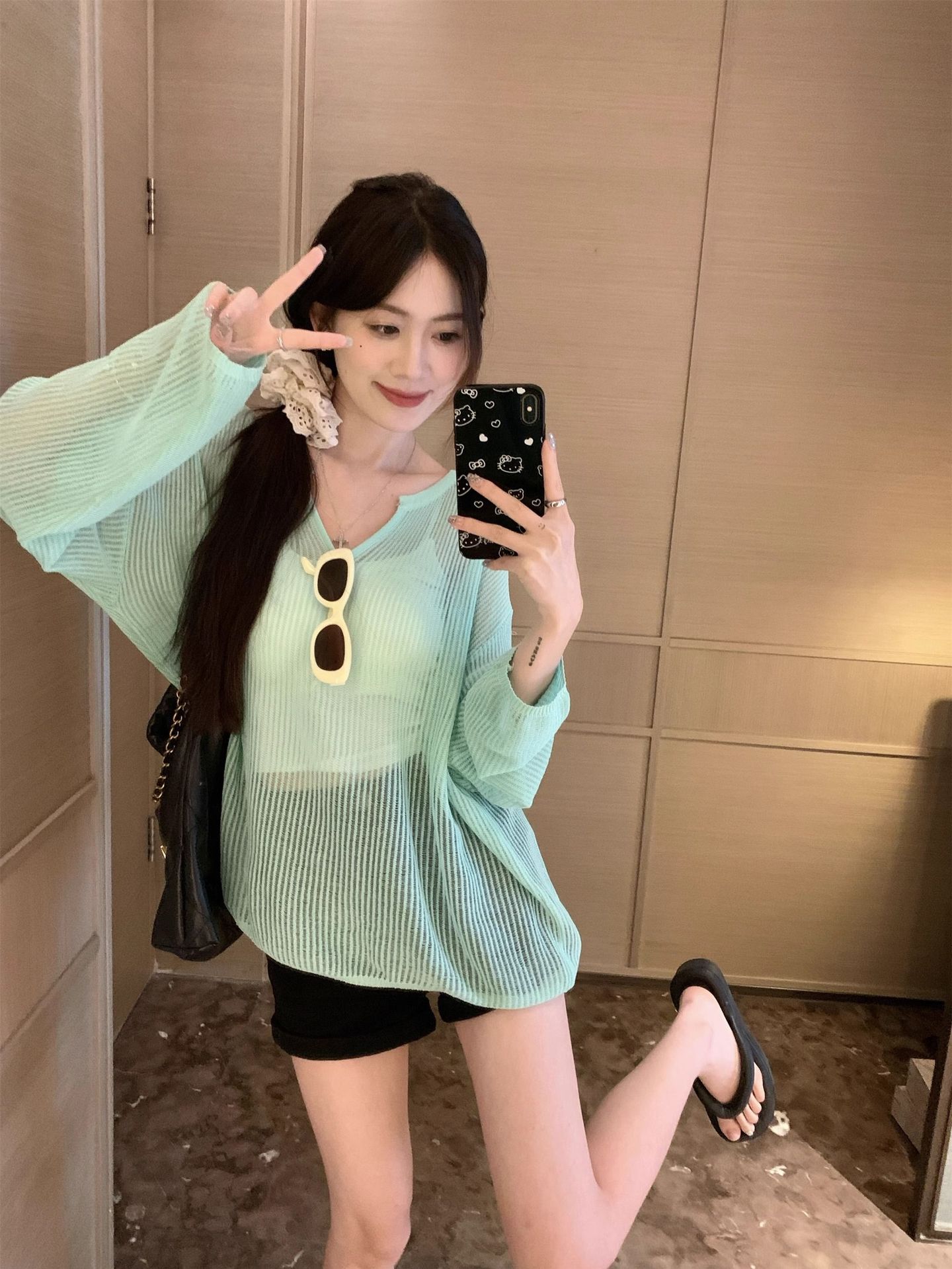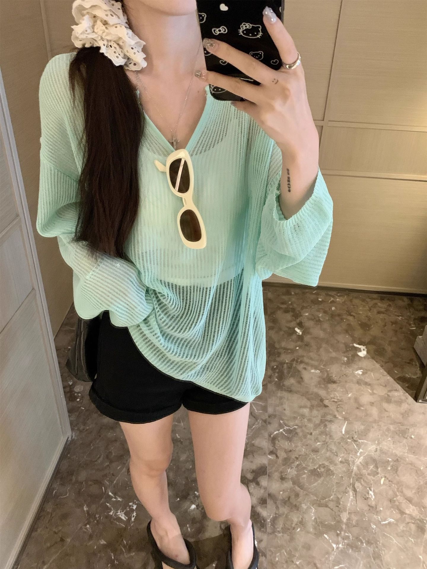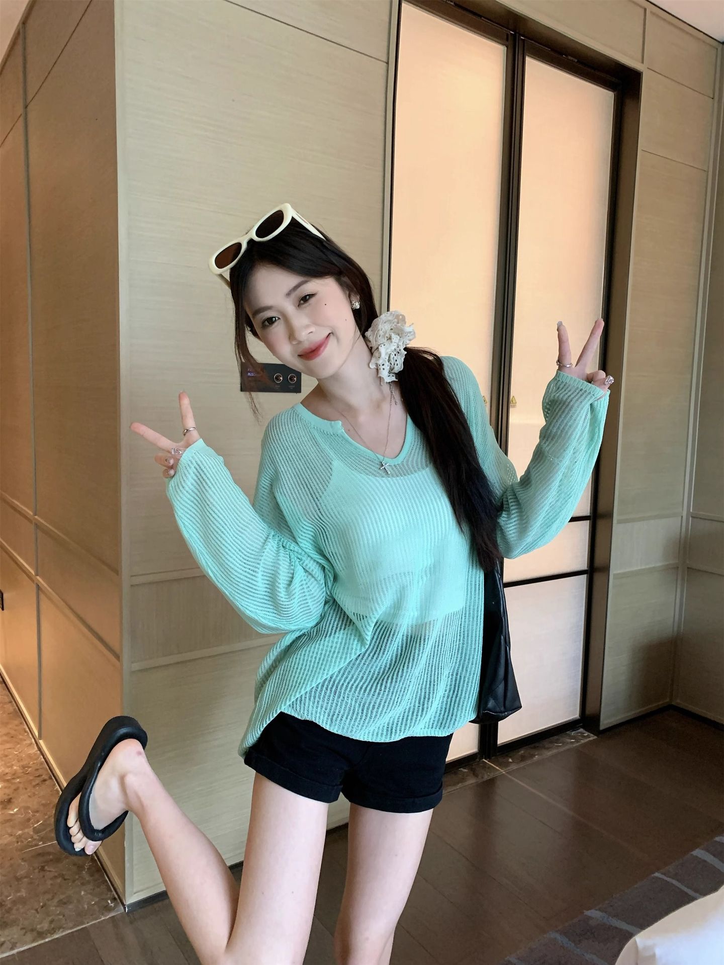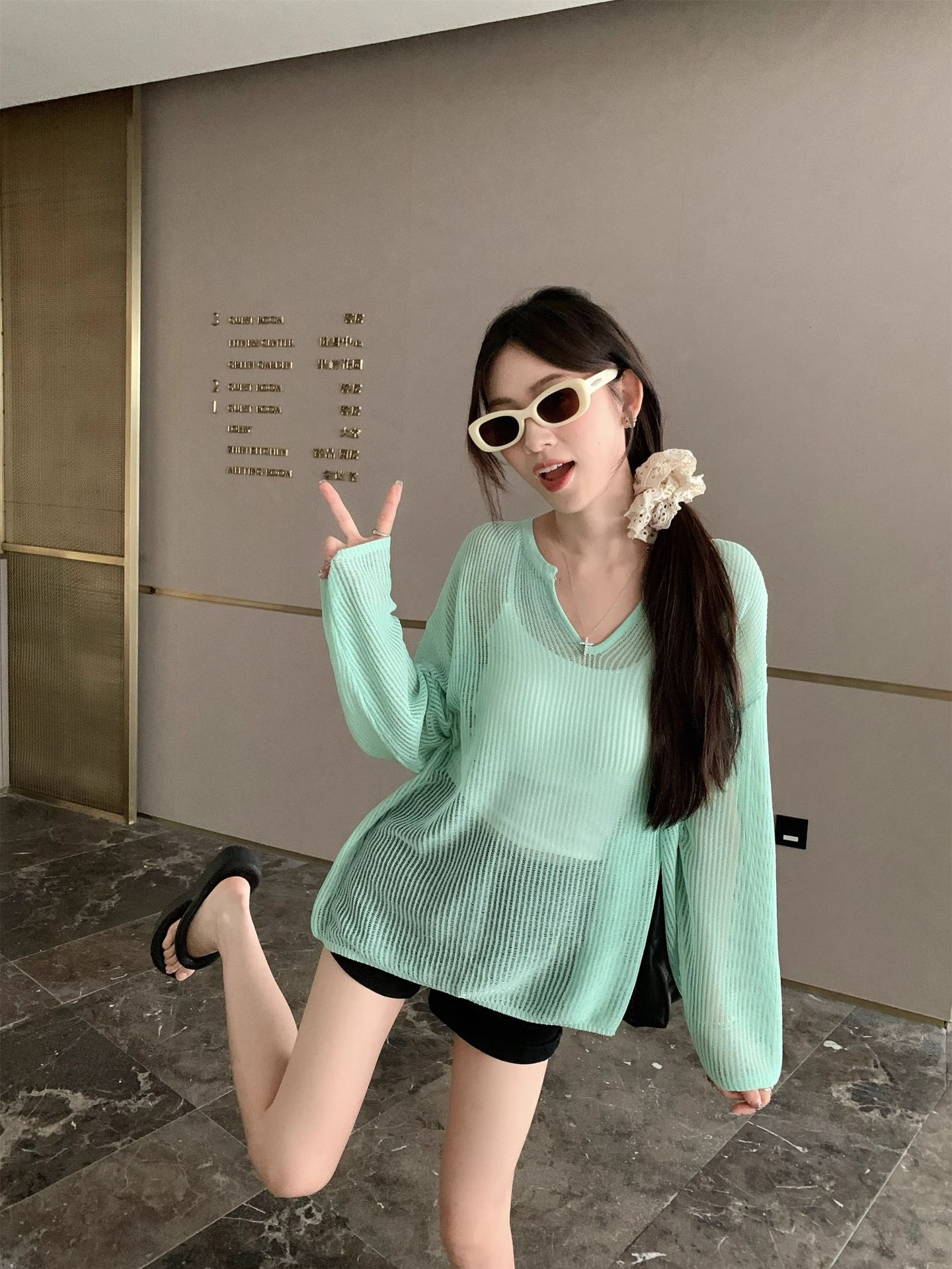 게으른 스타일 노란색 V 넥 할로우 아웃 선 스크린 블라우스 여성의 여름 얇은 관점 이완 틈새 탑 긴팔 티셔츠