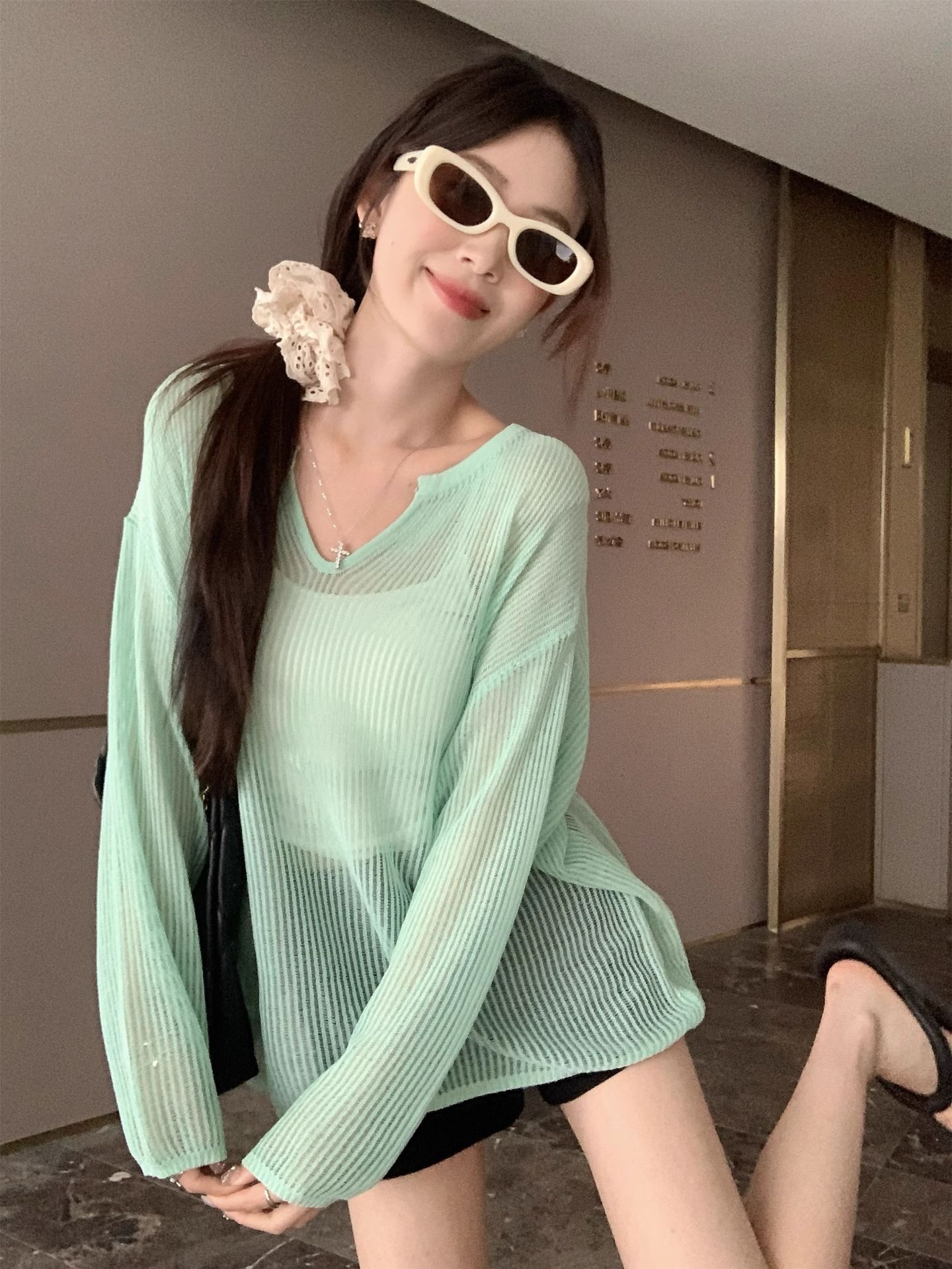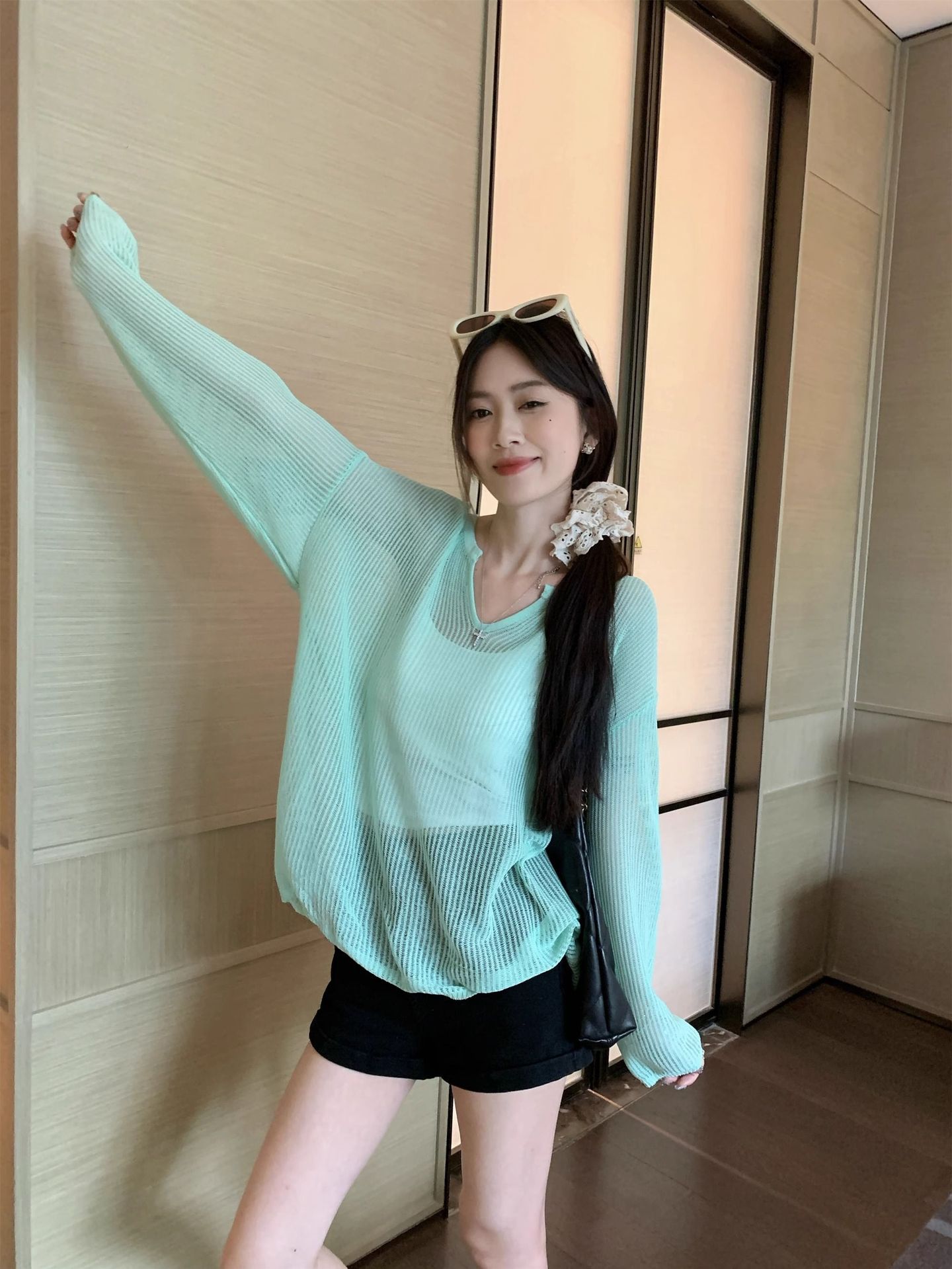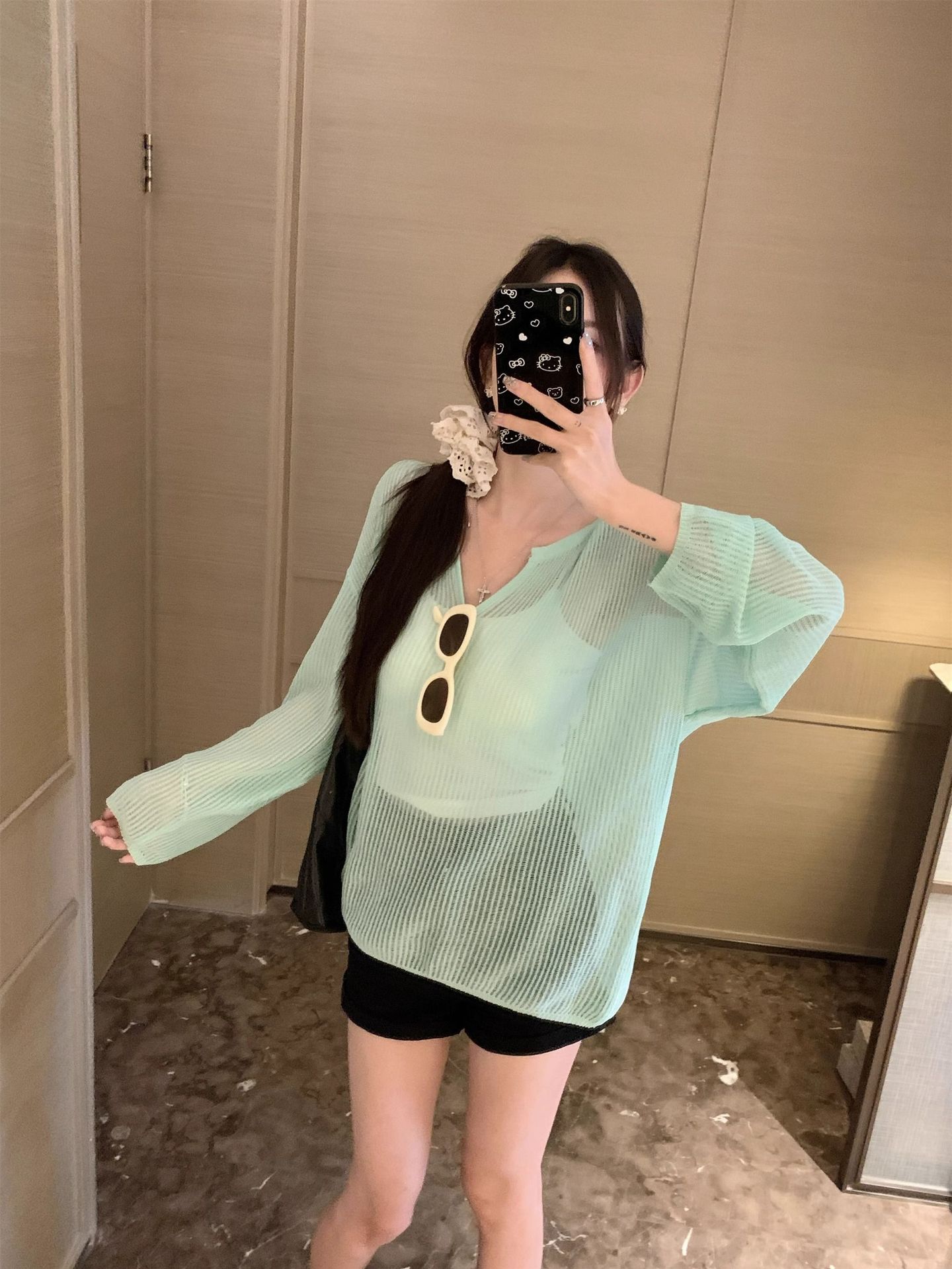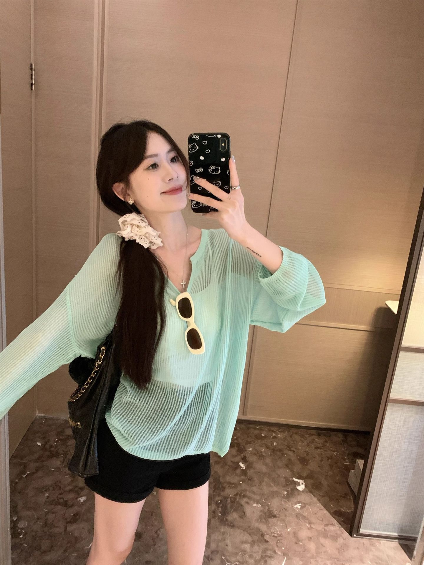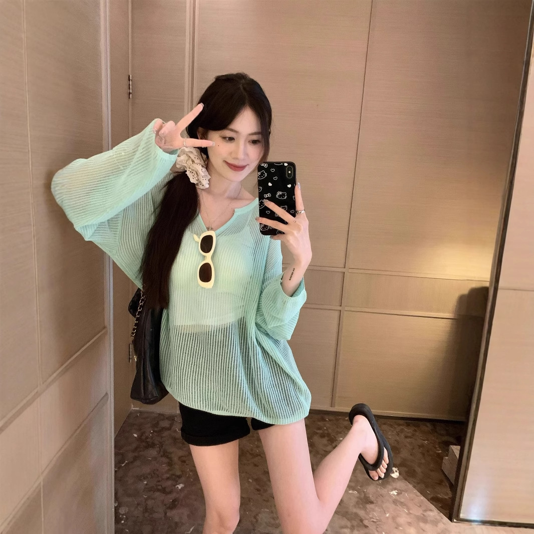 게으른 스타일 노란색 V 넥 할로우 아웃 선 스크린 블라우스 여성의 여름 얇은 관점 이완 틈새 탑 긴팔 티셔츠