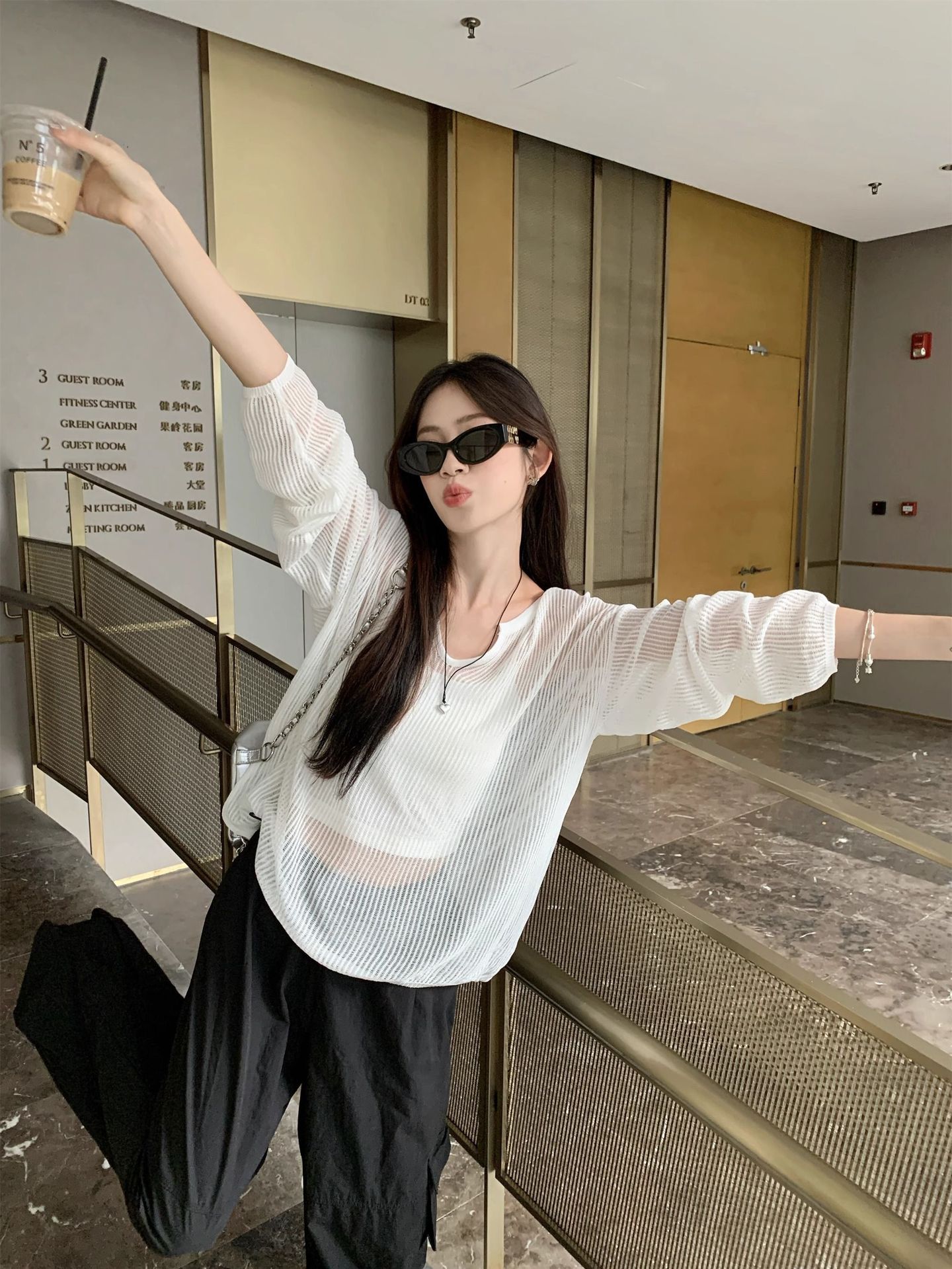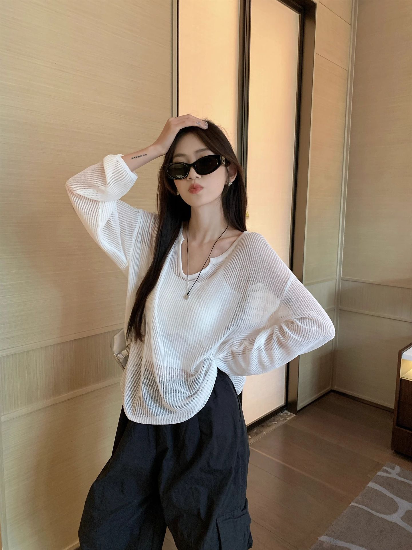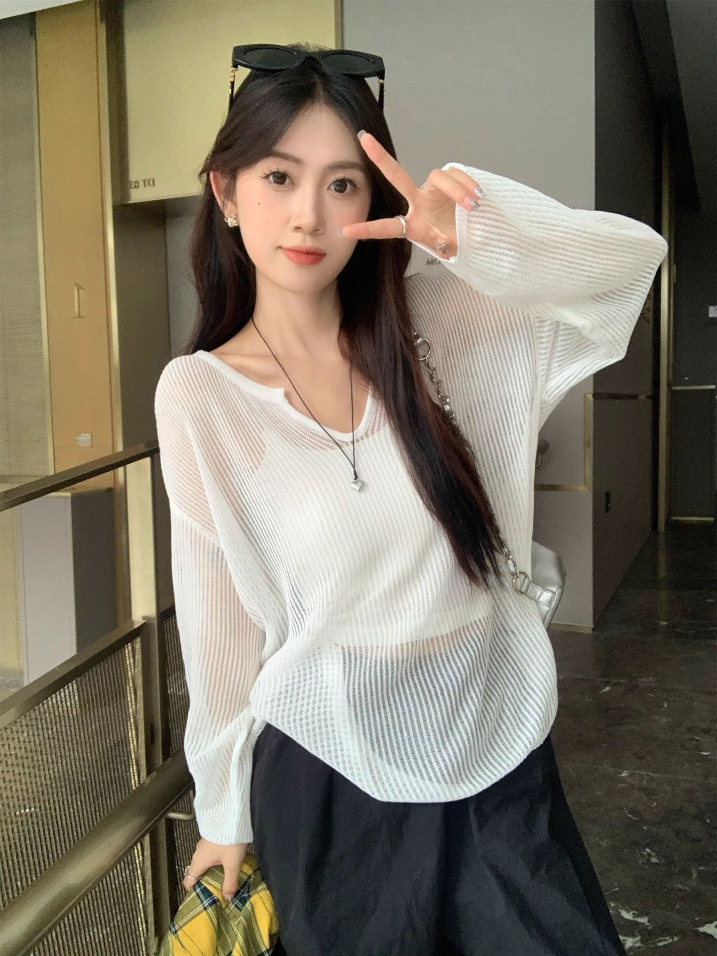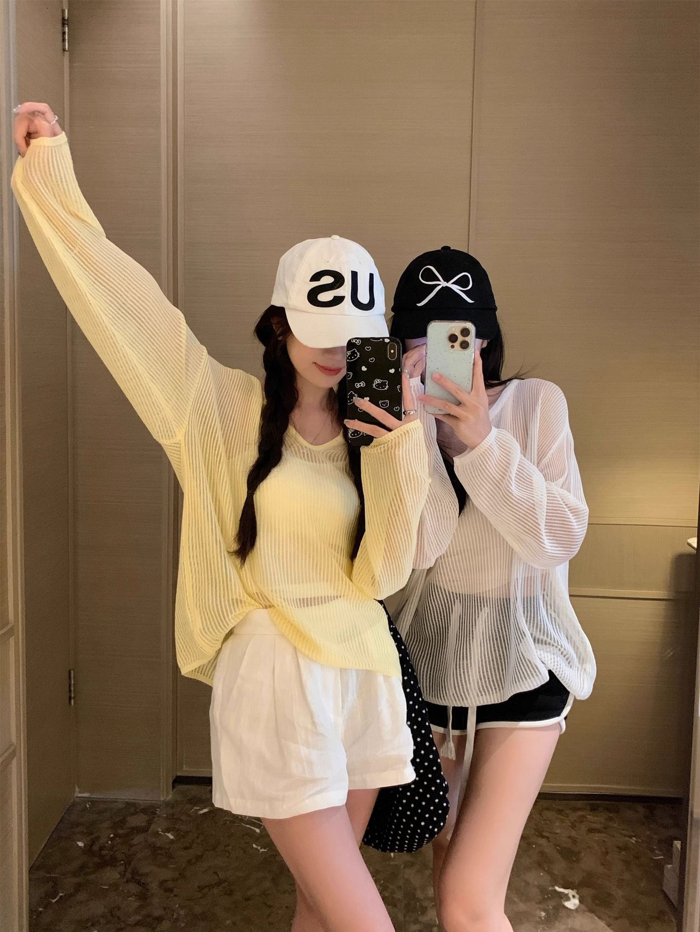 게으른 스타일 노란색 V 넥 할로우 아웃 선 스크린 블라우스 여성의 여름 얇은 관점 이완 틈새 탑 긴팔 티셔츠