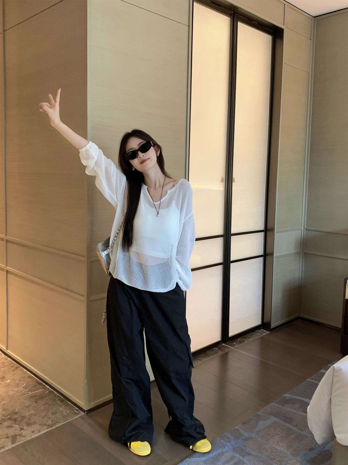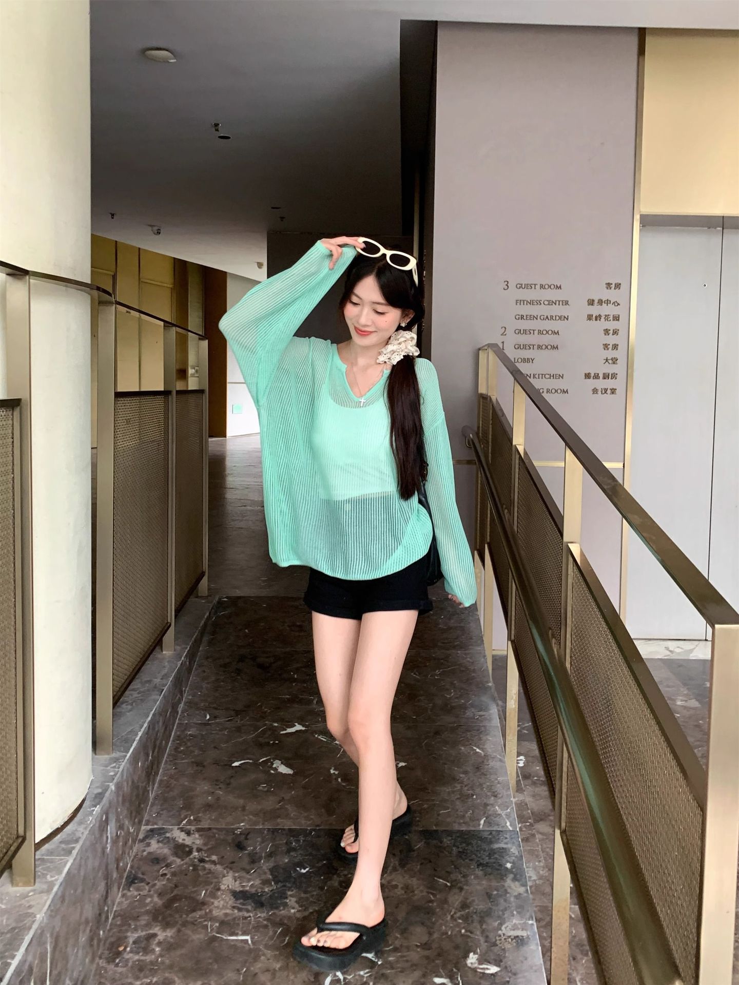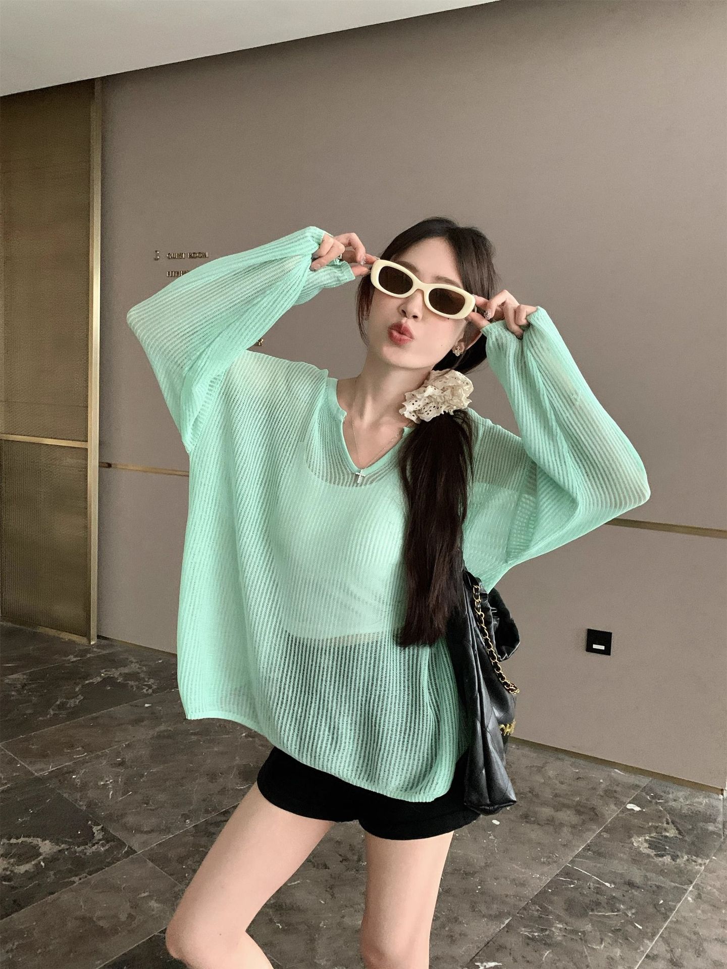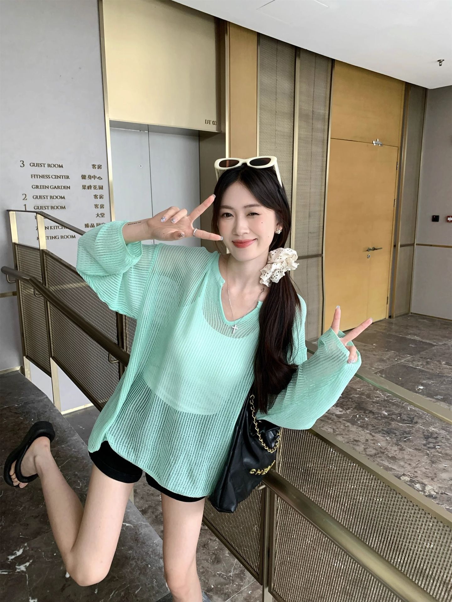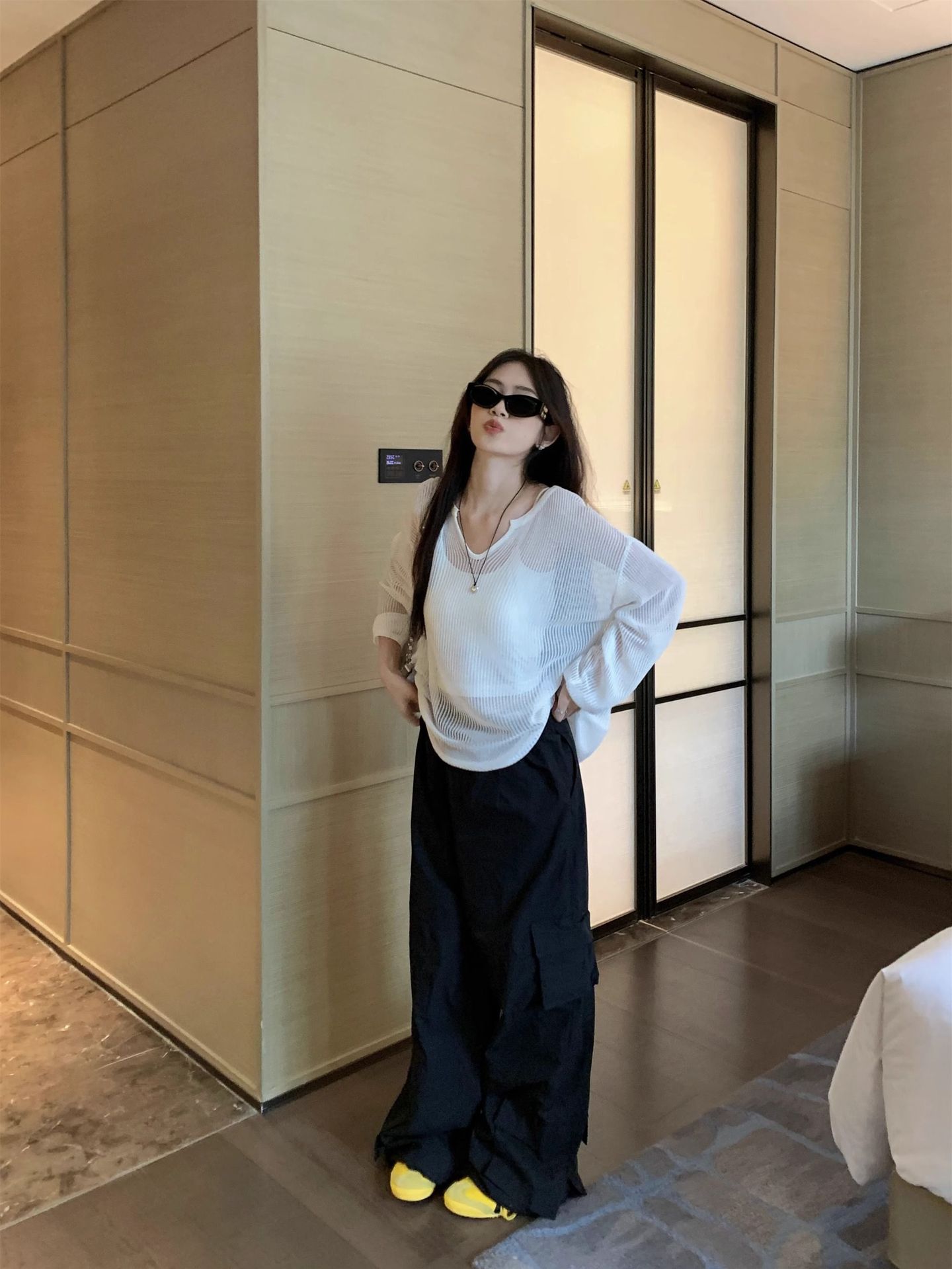 게으른 스타일 노란색 V 넥 할로우 아웃 선 스크린 블라우스 여성의 여름 얇은 관점 이완 틈새 탑 긴팔 티셔츠