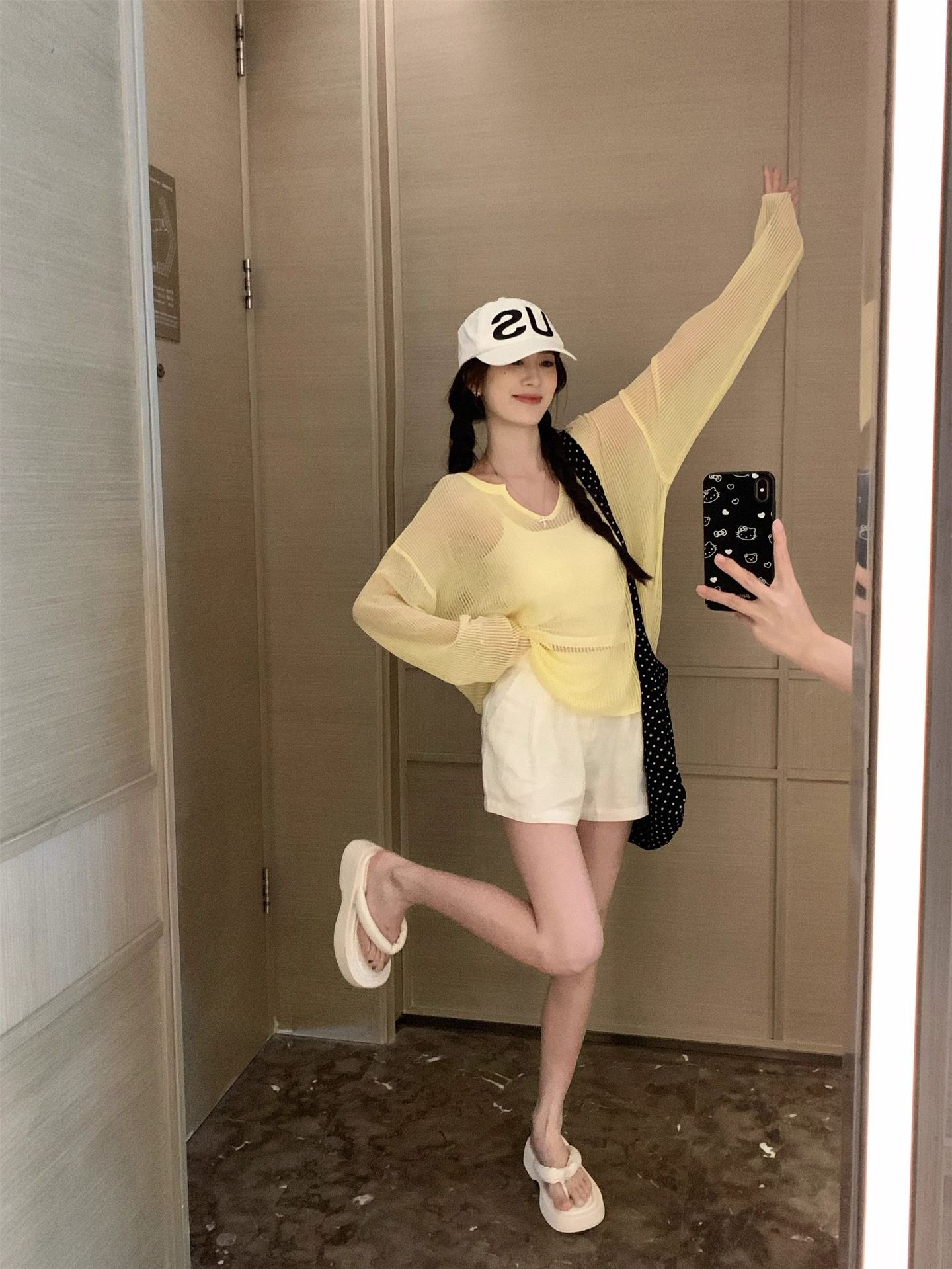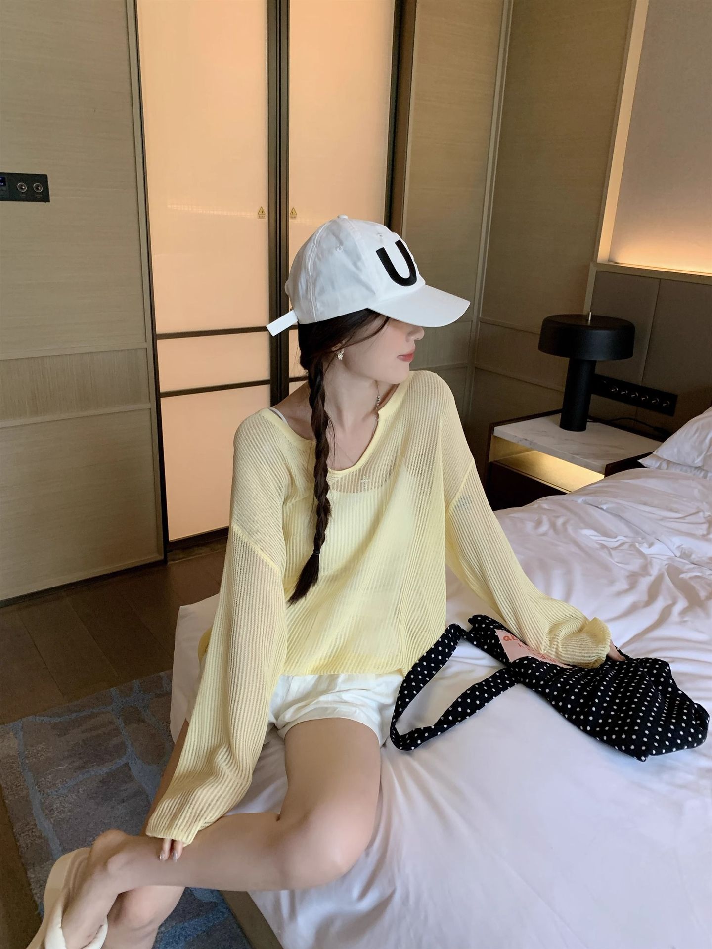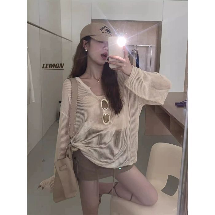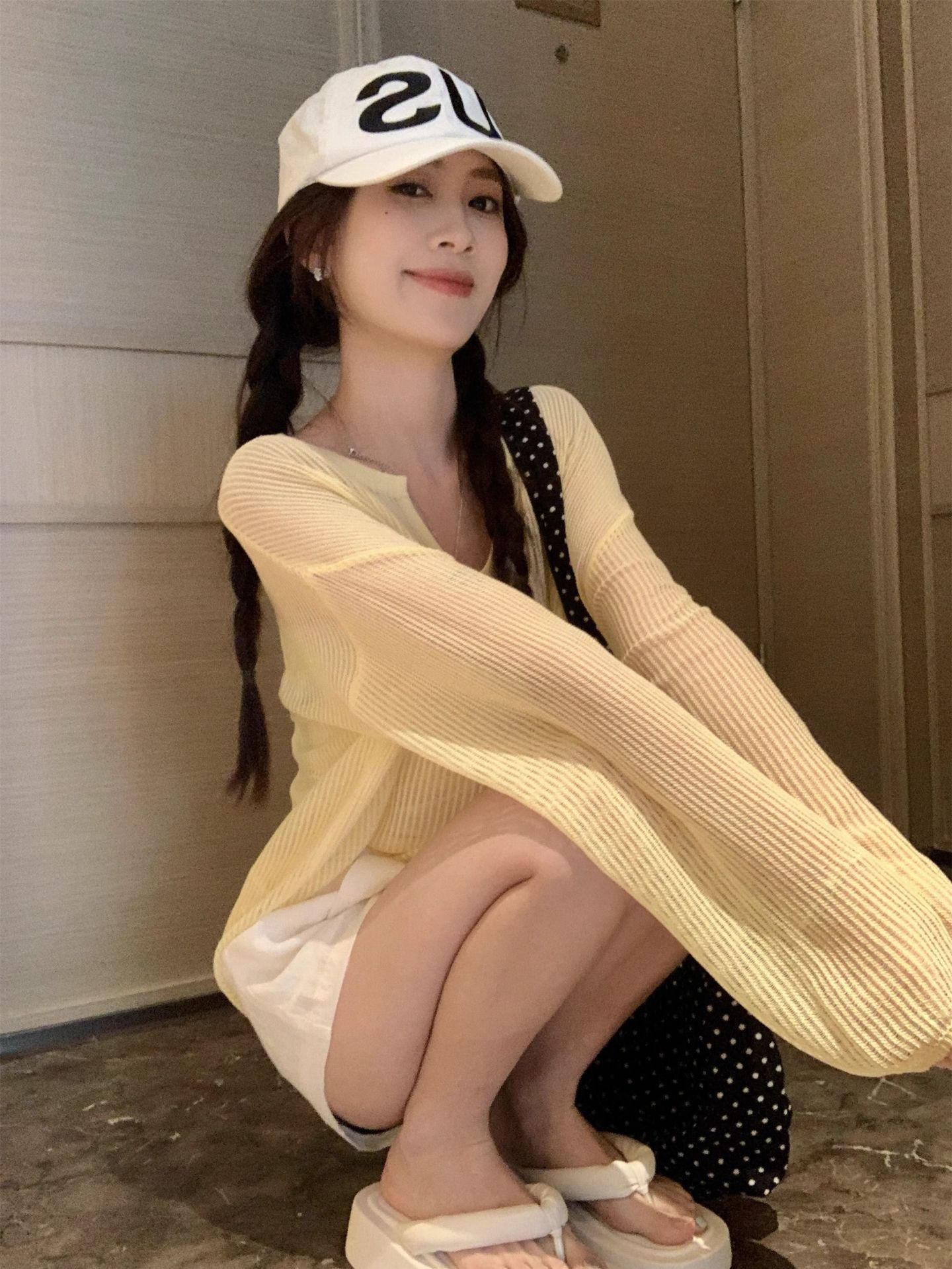 게으른 스타일 노란색 V 넥 할로우 아웃 선 스크린 블라우스 여성의 여름 얇은 관점 이완 틈새 탑 긴팔 티셔츠스토어 가기