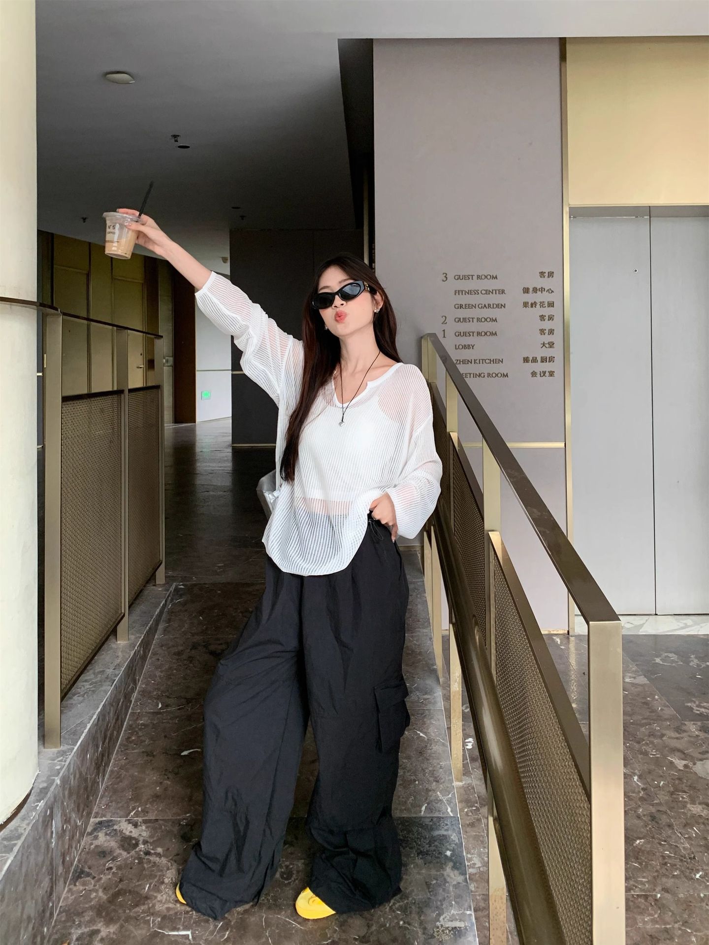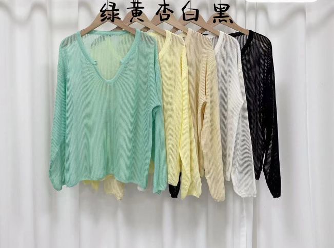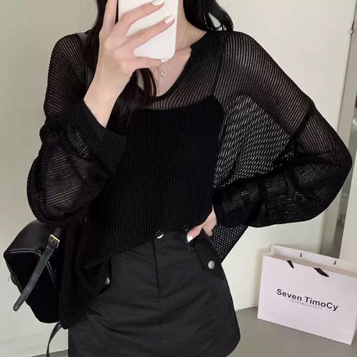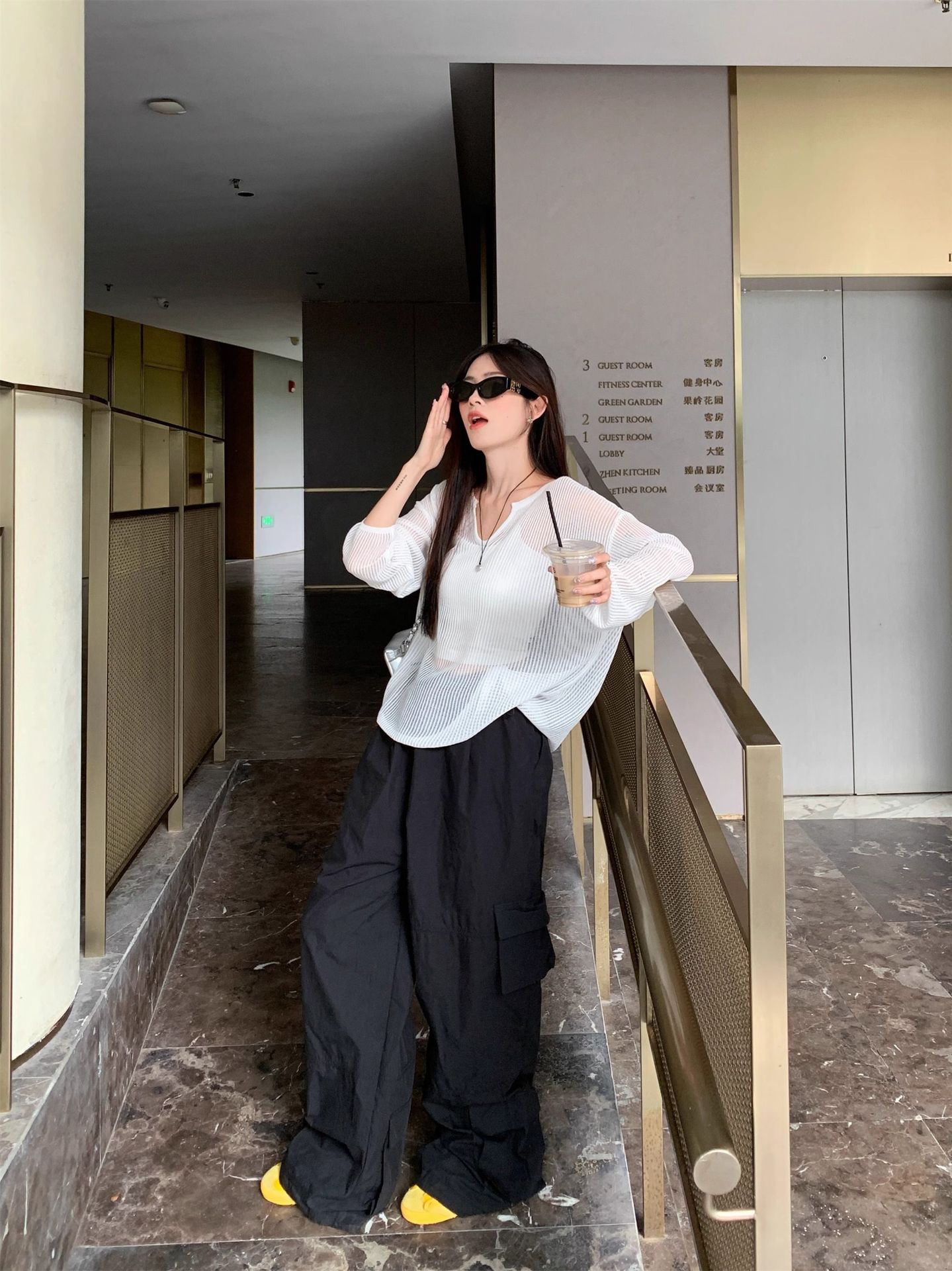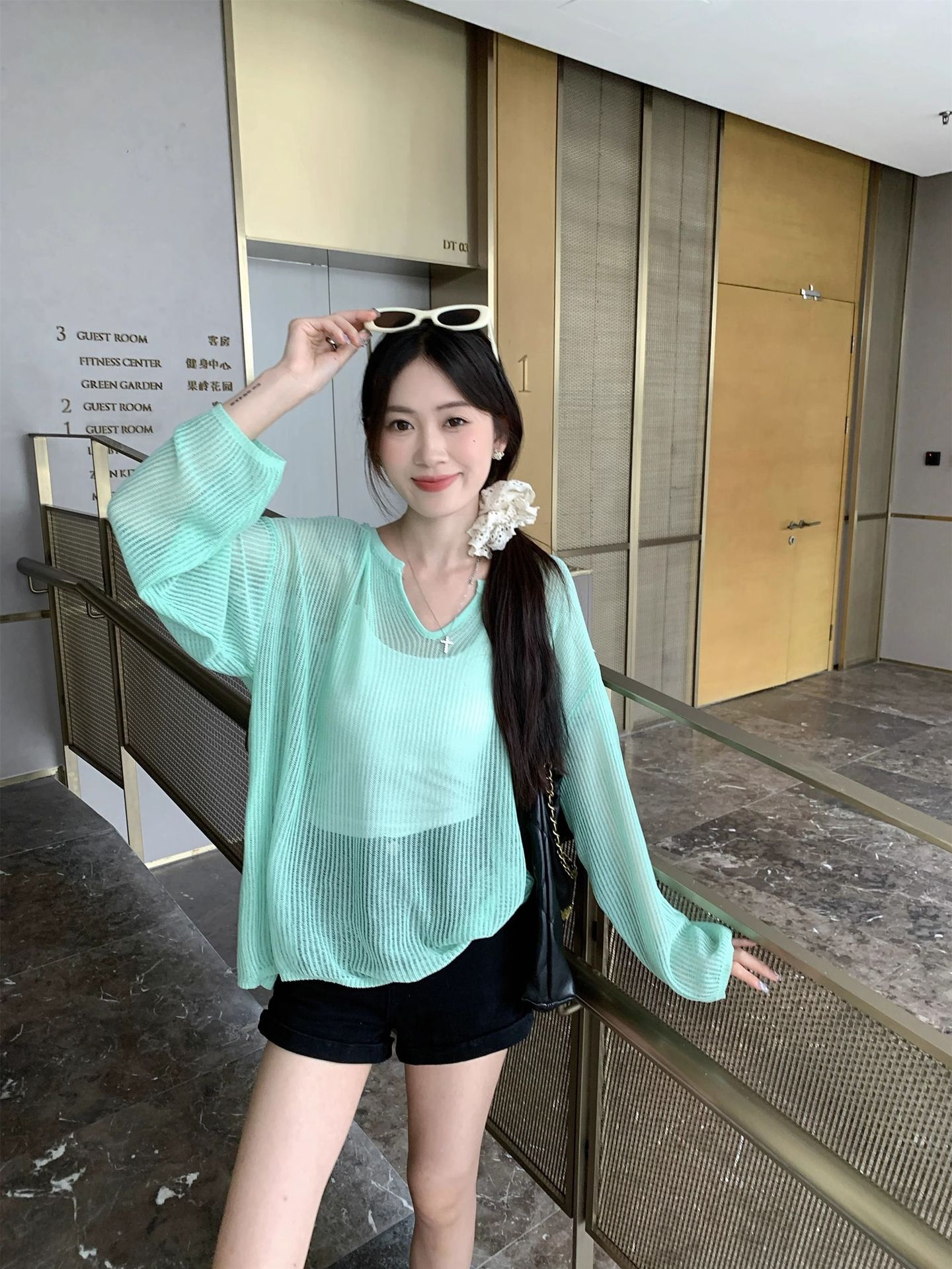 게으른 스타일 노란색 V 넥 할로우 아웃 선 스크린 블라우스 여성의 여름 얇은 관점 이완 틈새 탑 긴팔 티셔츠스토어 가기