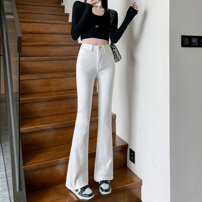 핫한 여성을 위한 가을 겨울 화이트 마이크로 플레어 청바지, 하이웨이스트, 슬리밍, 키가 작은 9부, 하이힐, 롱팬츠