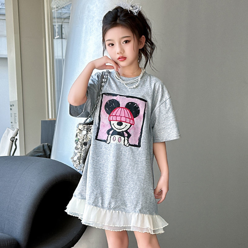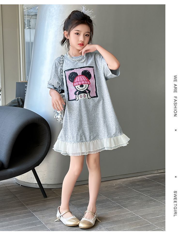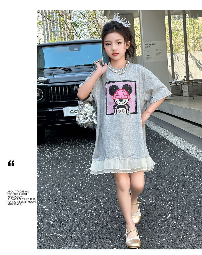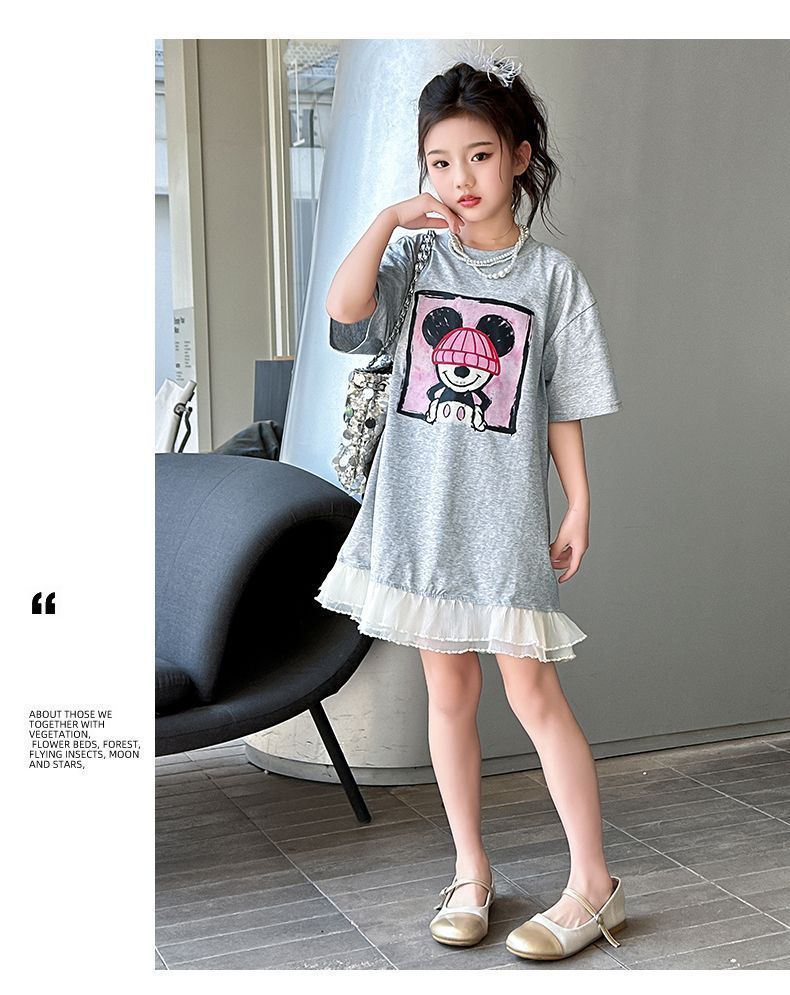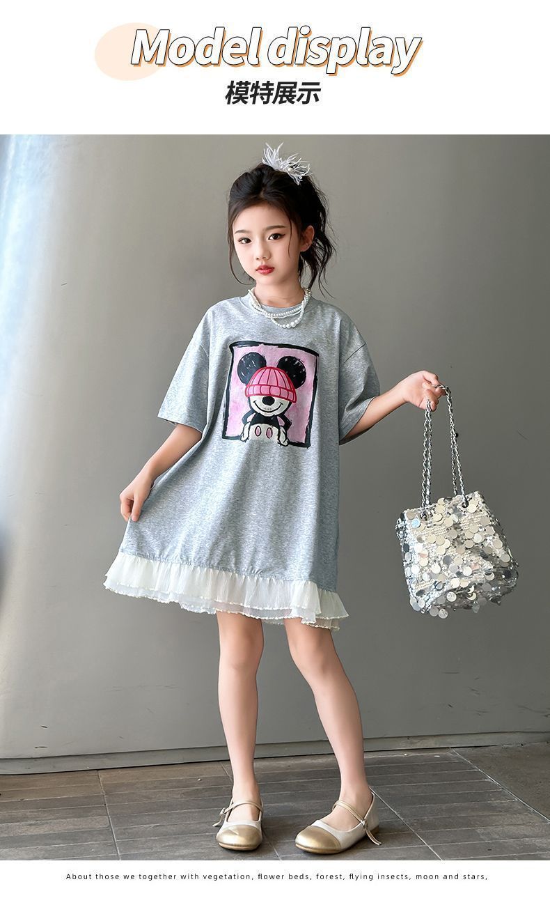 여자 메쉬 스플 라이스 드레스 여름 2025 새로운 만화 어린이 반팔 느슨한 라운드 넥 캐주얼 티셔츠 드레스스토어 가기