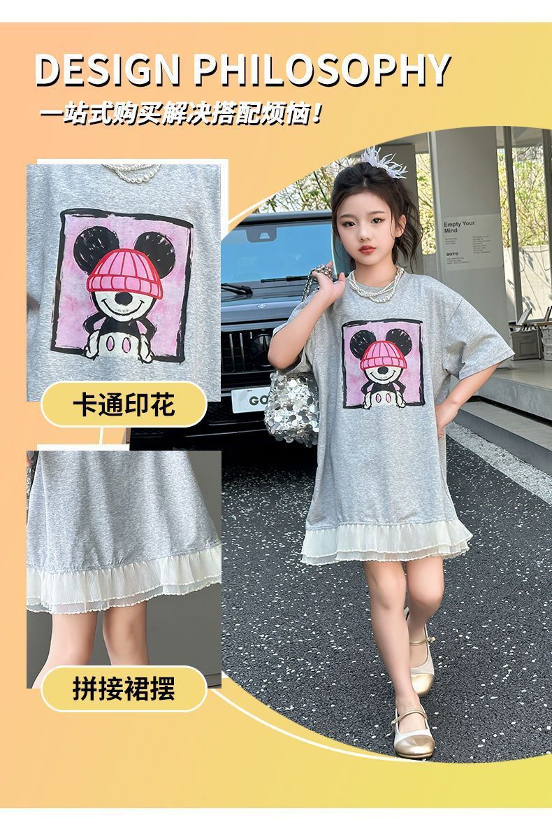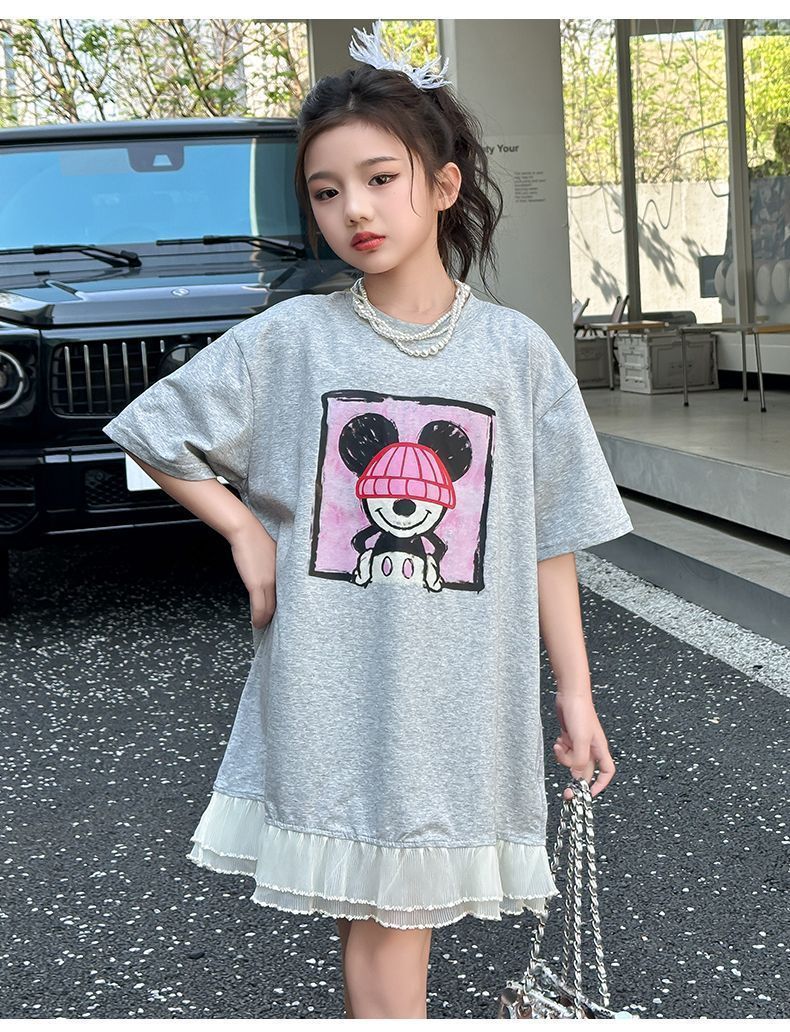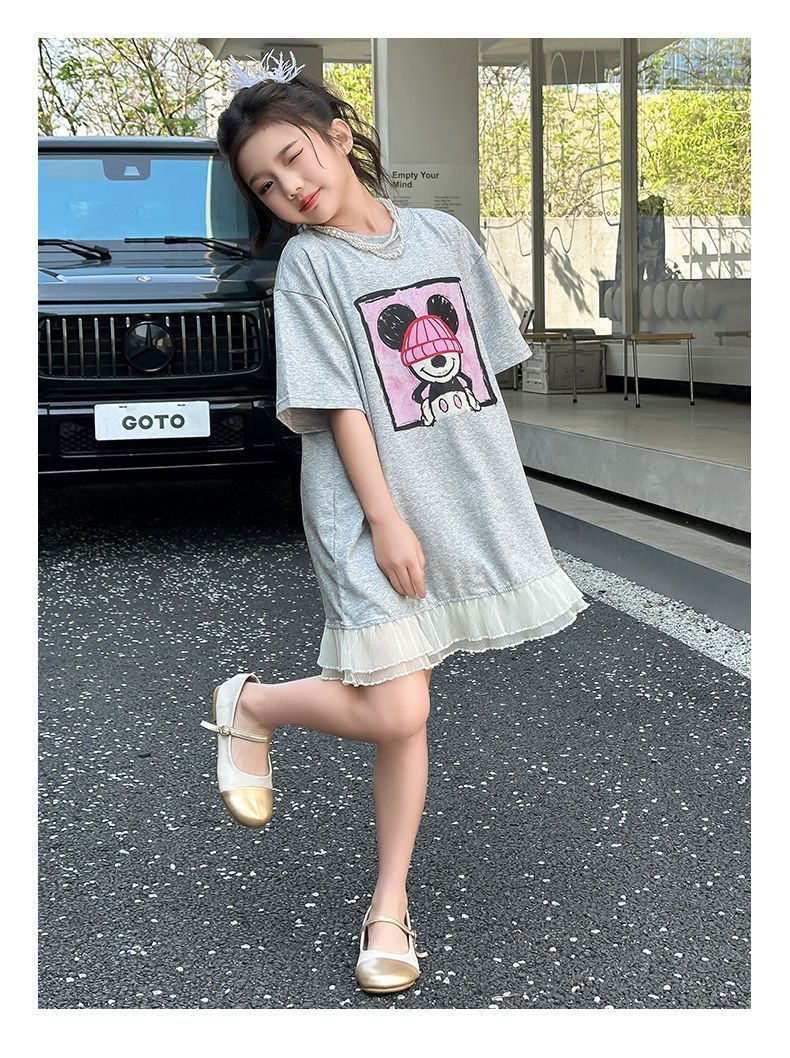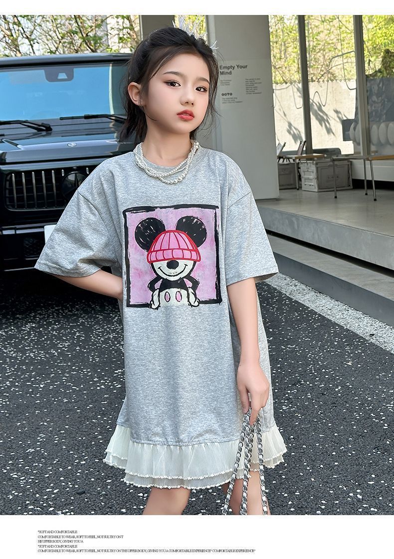 여자 메쉬 스플 라이스 드레스 여름 2025 새로운 만화 어린이 반팔 느슨한 라운드 넥 캐주얼 티셔츠 드레스스토어 가기