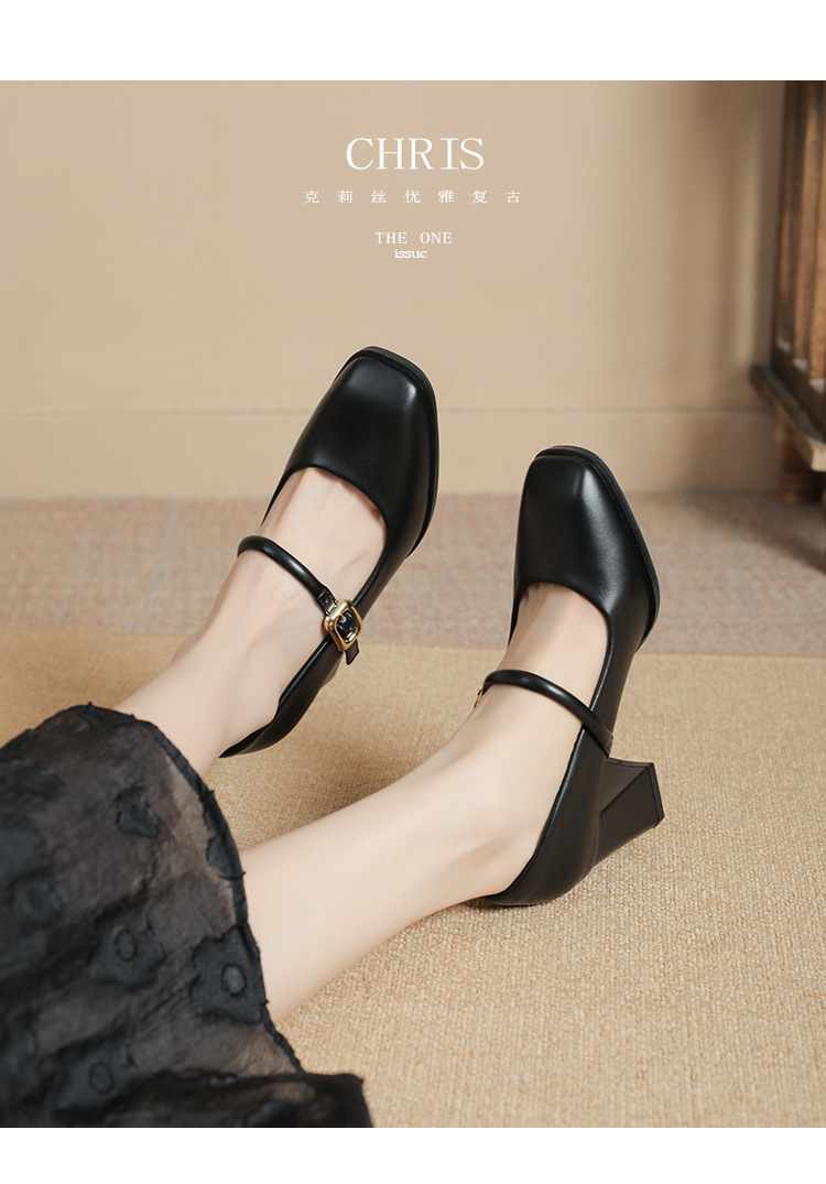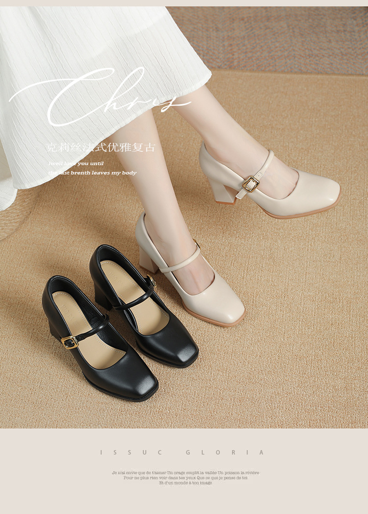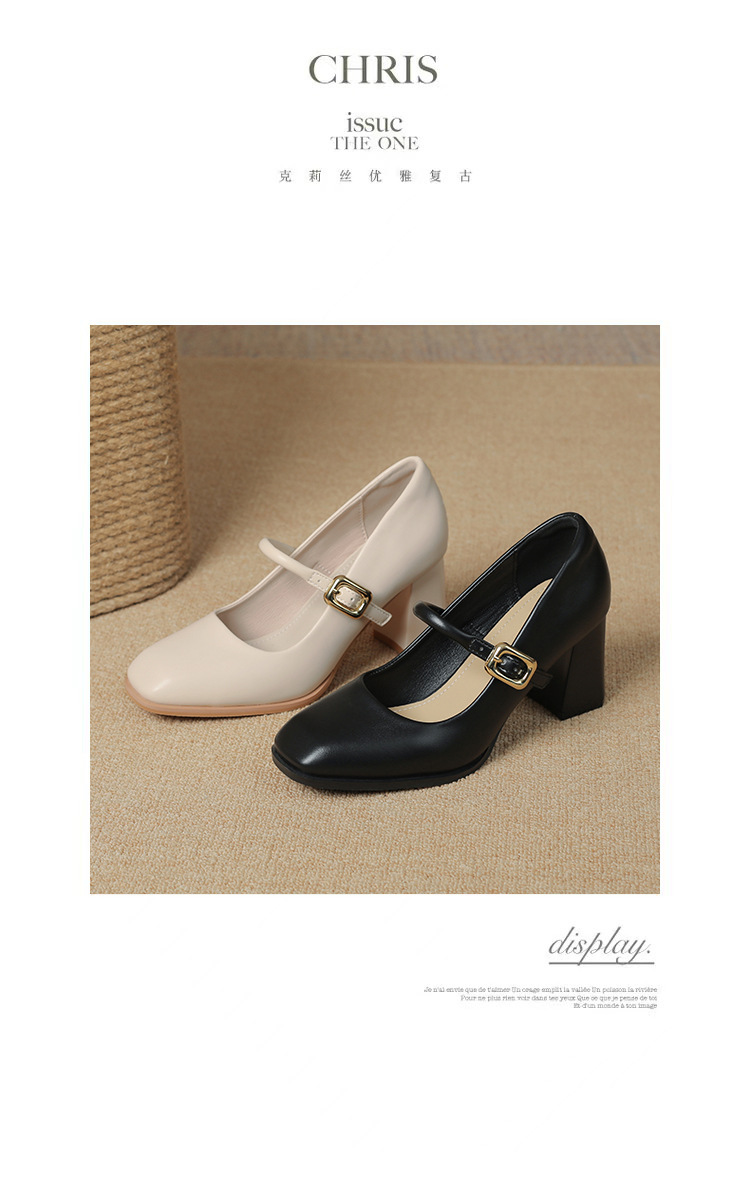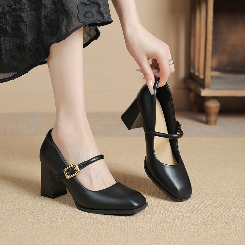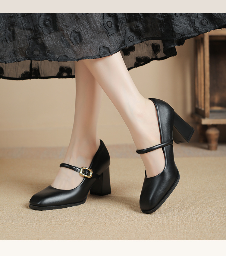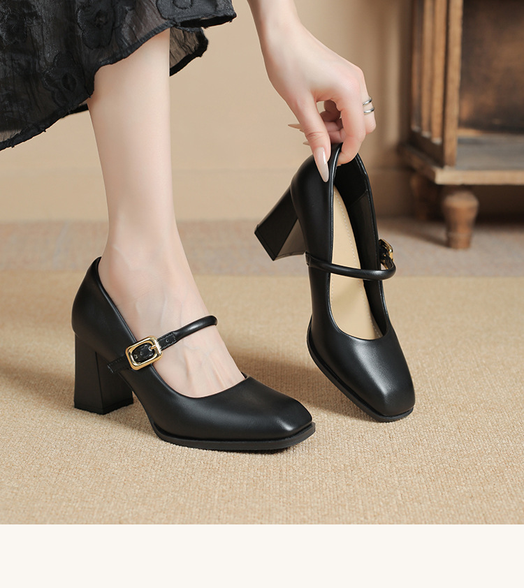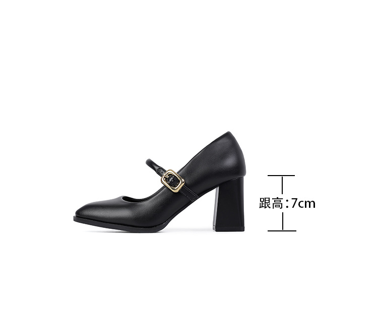 스팟 소사이즈 313233 사이즈 두꺼운 굽 7CM 스퀘어 토 버클 심플 기질 통근화 부드러운 가죽 여성화스토어 가기