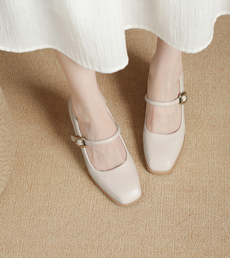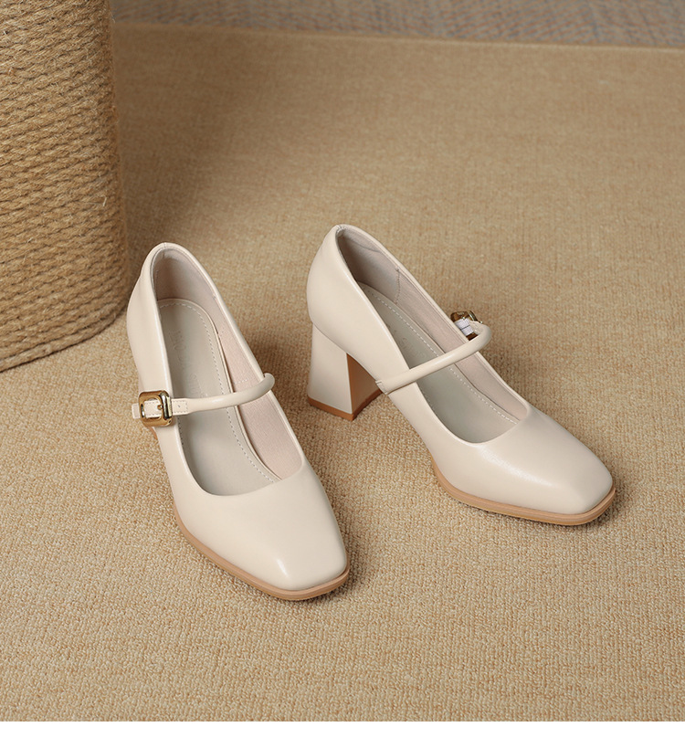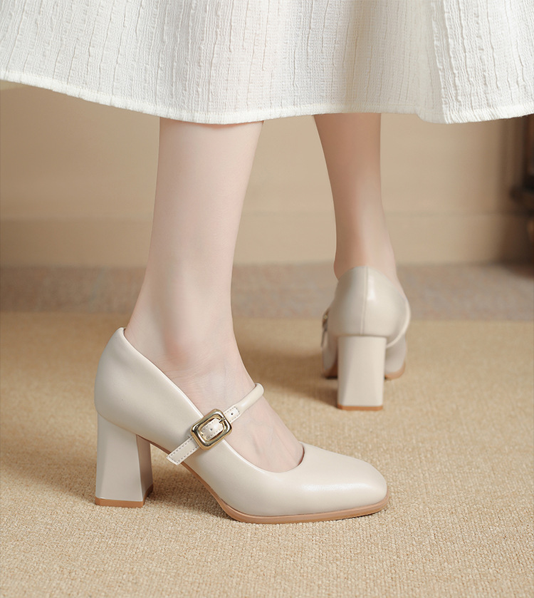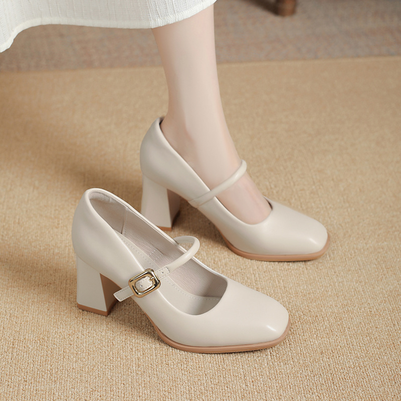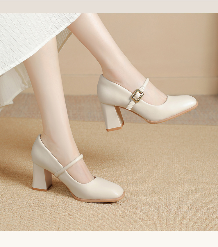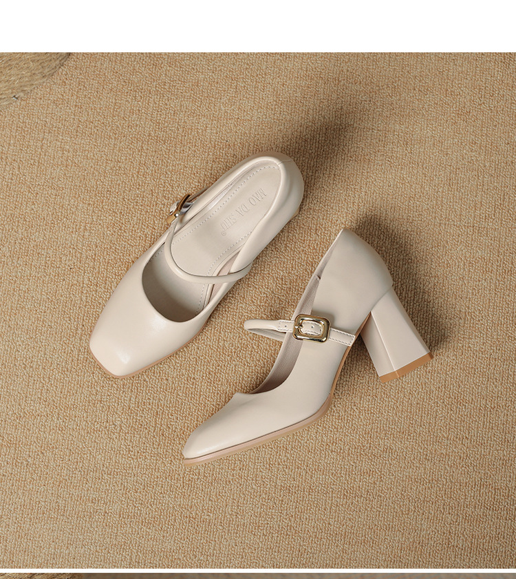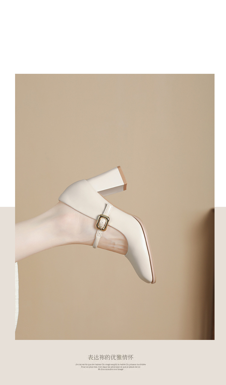 스팟 소사이즈 313233 사이즈 두꺼운 굽 7CM 스퀘어 토 버클 심플 기질 통근화 부드러운 가죽 여성화스토어 가기