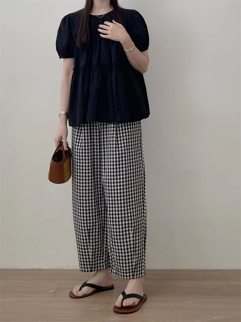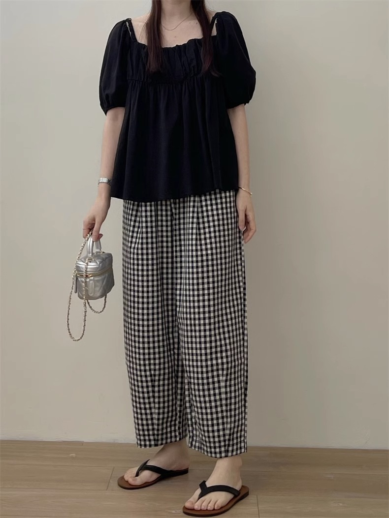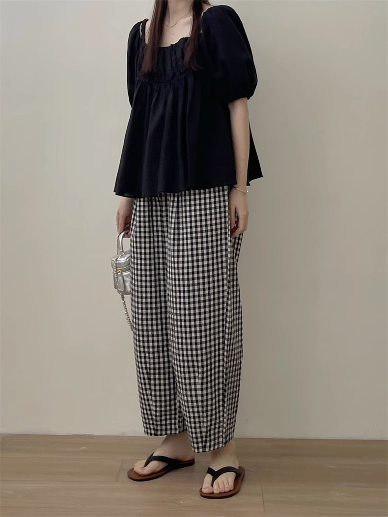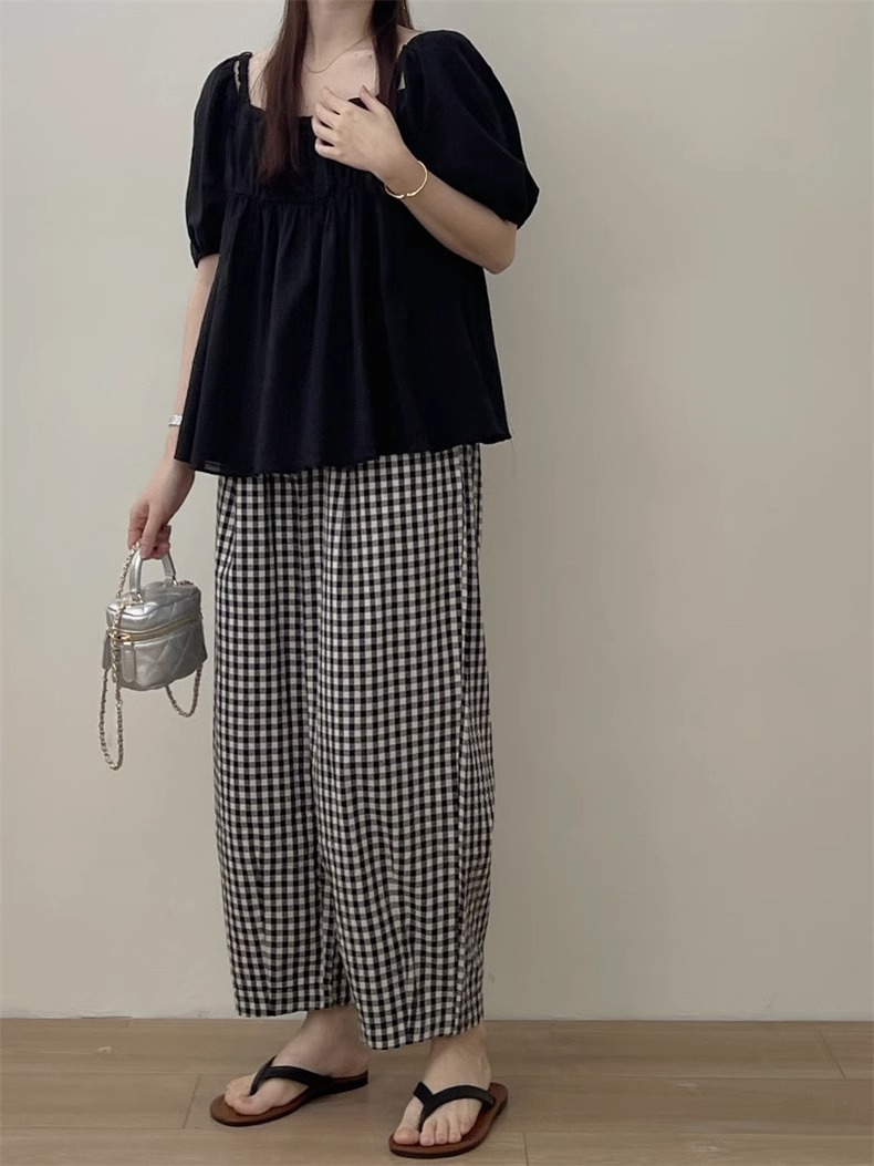 얇은 일본식 격자 무늬 캐주얼 와이드 레그 팬츠 여자 2025 년 여름 새로운 루즈 레트로 엘라스탄 허리 드로스트링 한랭 바지