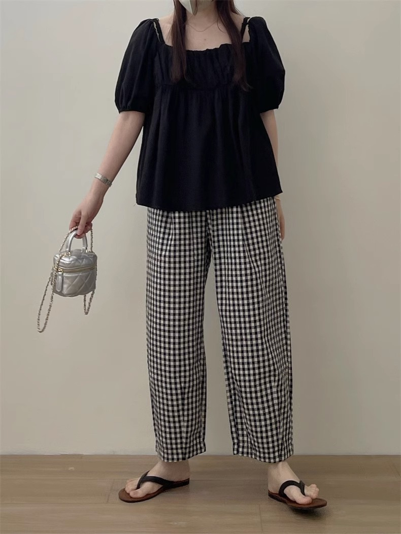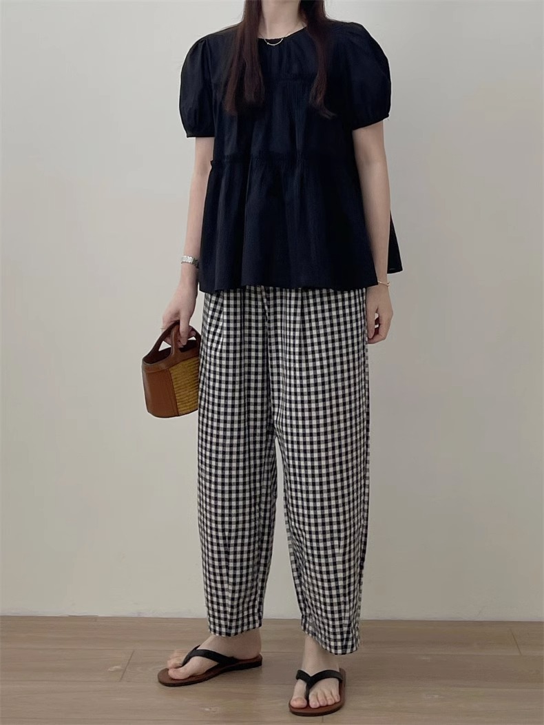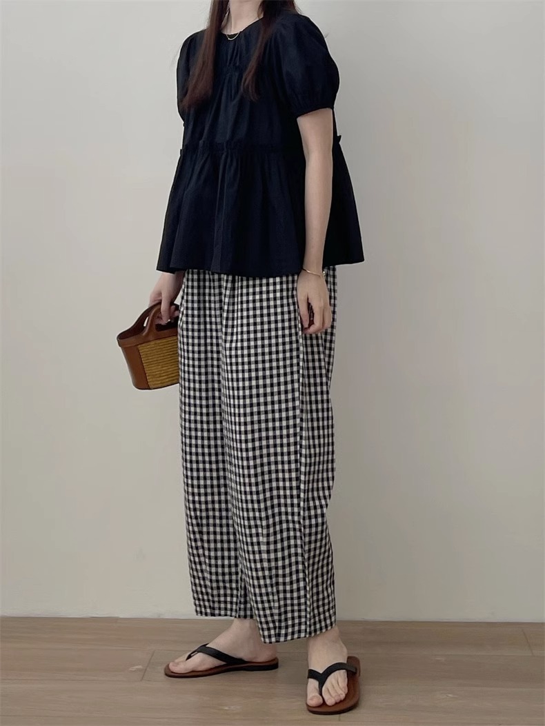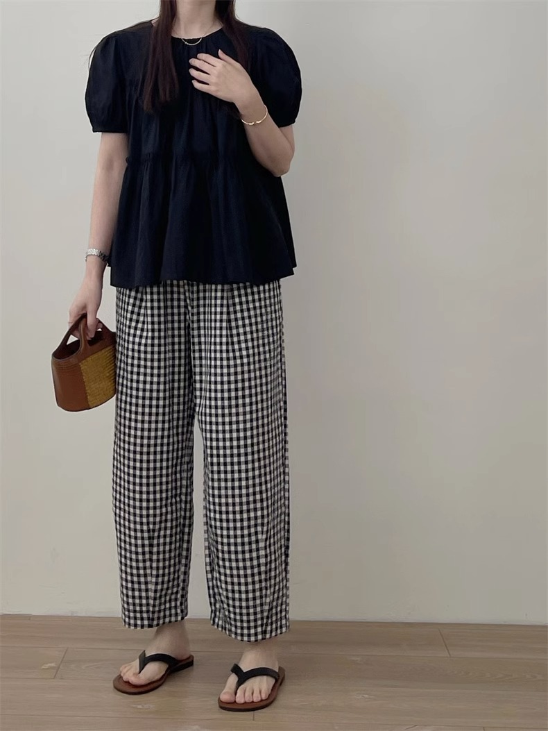 얇은 일본식 격자 무늬 캐주얼 와이드 레그 팬츠 여자 2025 년 여름 새로운 루즈 레트로 엘라스탄 허리 드로스트링 한랭 바지