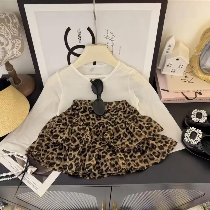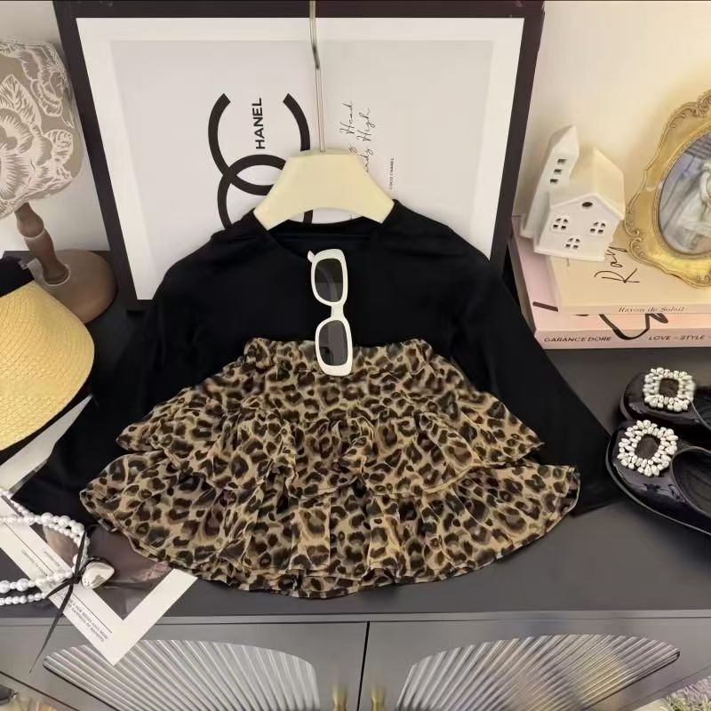 2025 여자 봄과 여름 새로운 한국식 올 매치 캐주얼 라운드 넥 티셔츠 레오파드 무늬 케이크 원피스 트렌디 한 투피스 세트