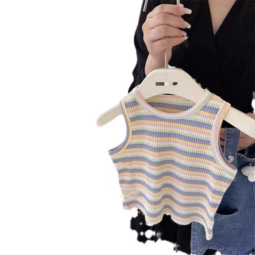 2025 새로운 어린이 여름 한국식 줄무늬 조끼 소년 소녀를위한 데님 스트랩 반바지 세트 아동복스토어 가기