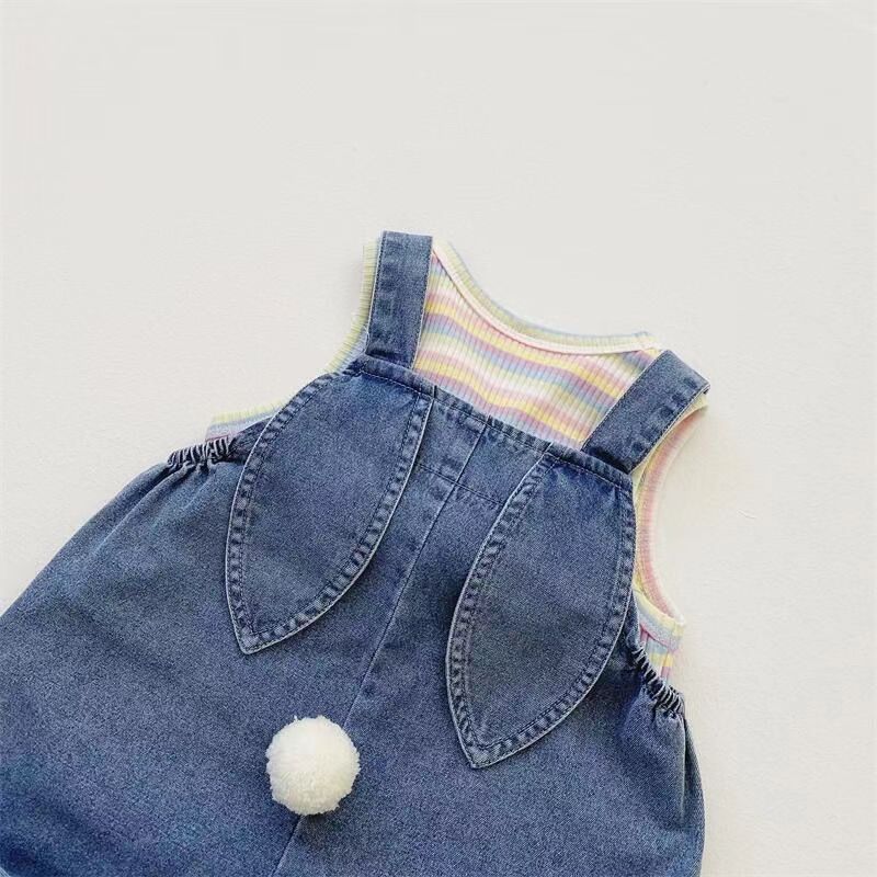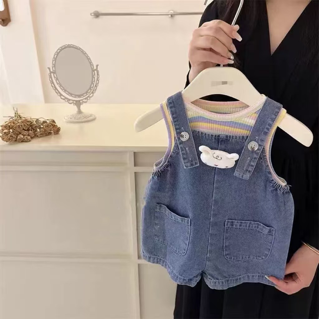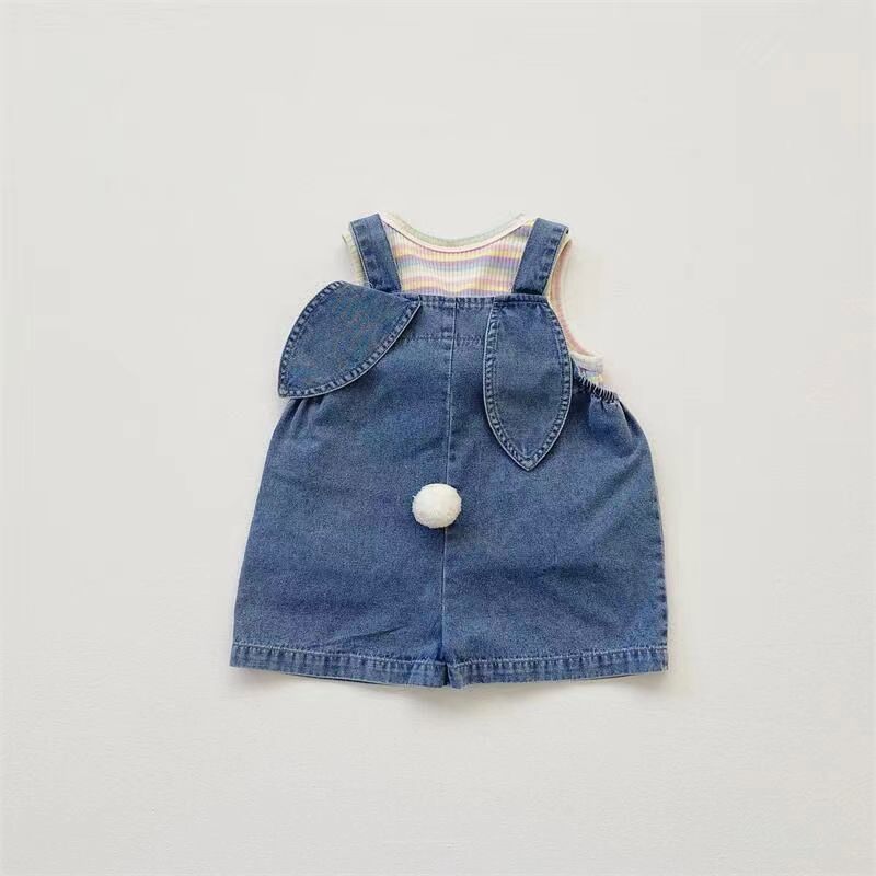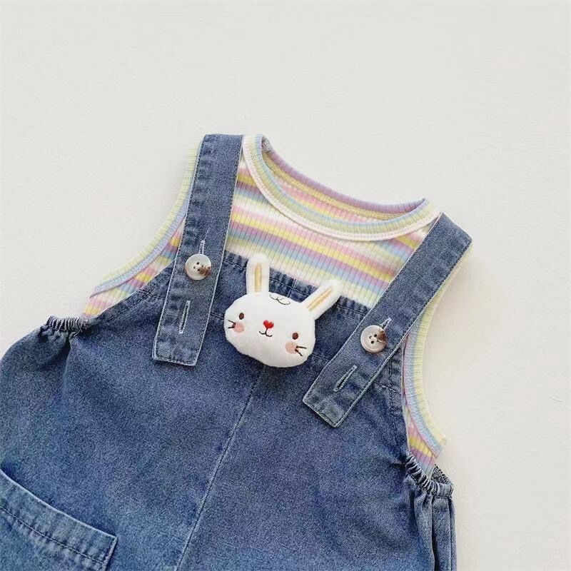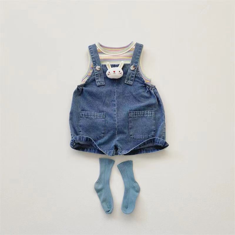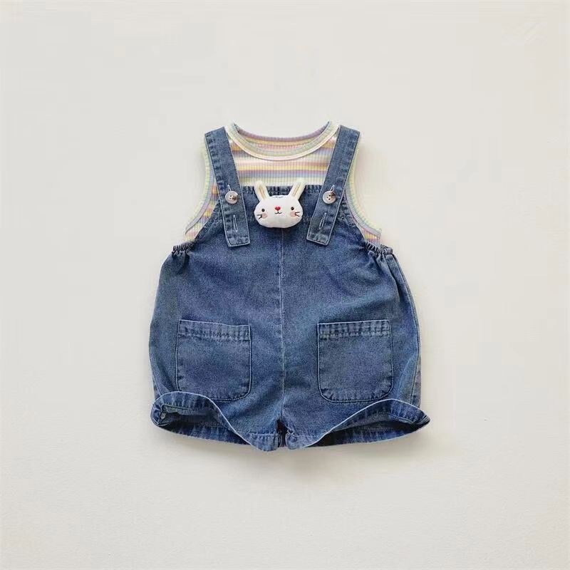 2025 새로운 어린이 여름 한국식 줄무늬 조끼 소년 소녀를위한 데님 스트랩 반바지 세트 아동복