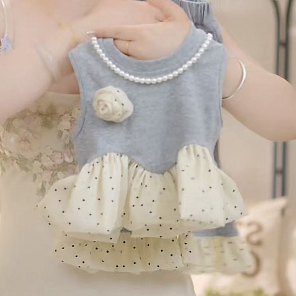 한국 어린 소녀 여름 샤넬 스타일 우아한 세트 2025 새로운 틈새 바느질 도트 조끼 T 벨 바지스토어 가기