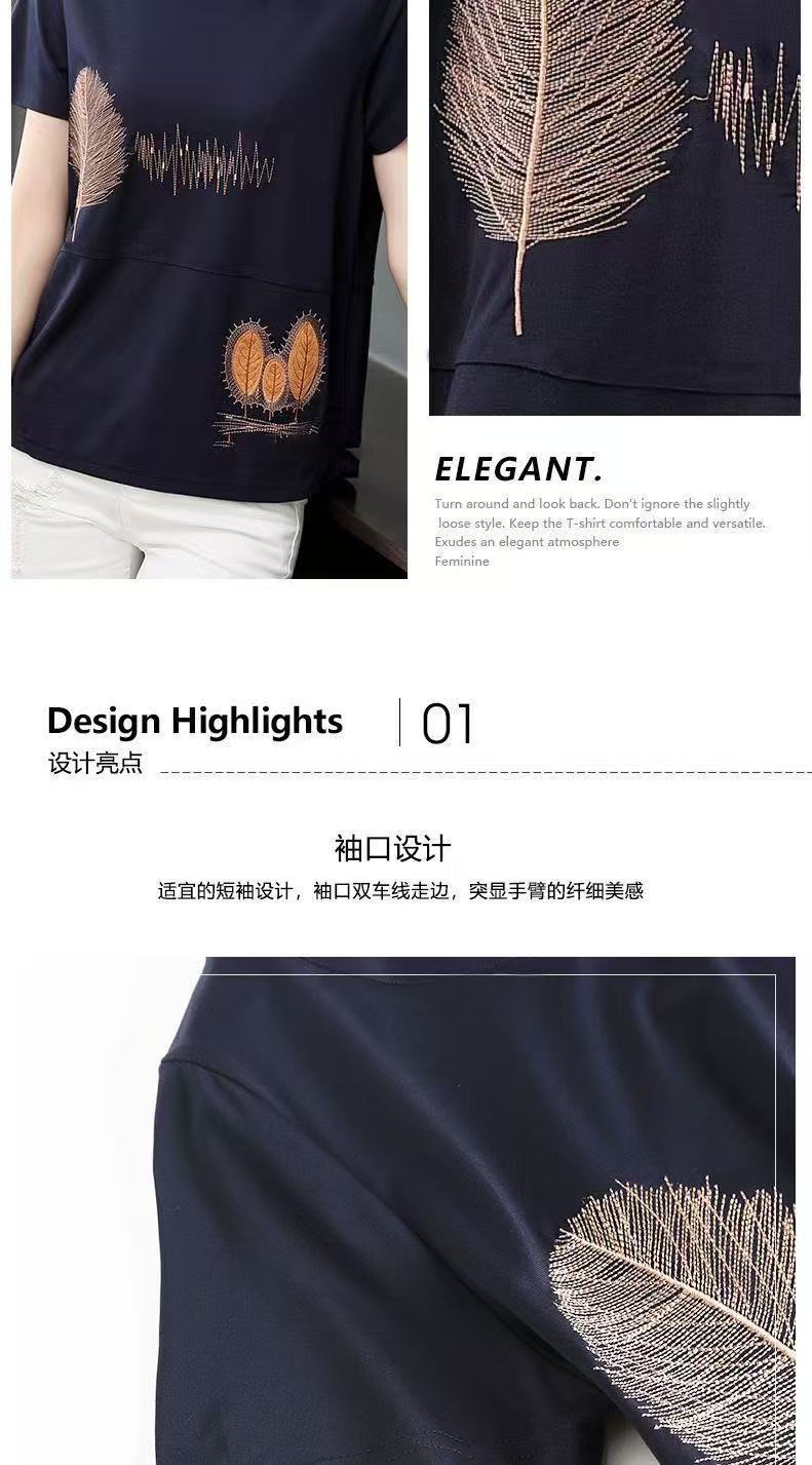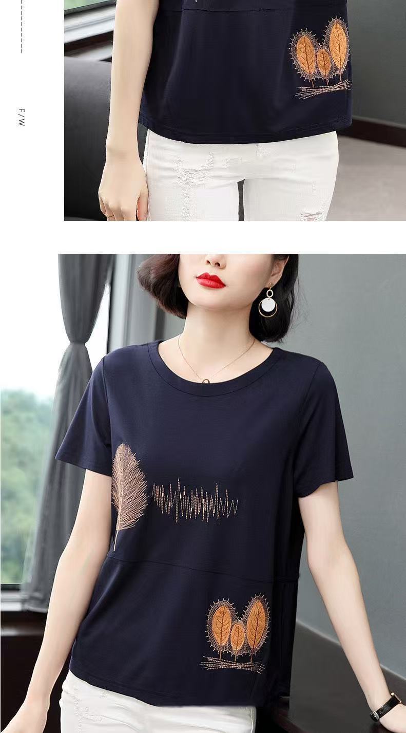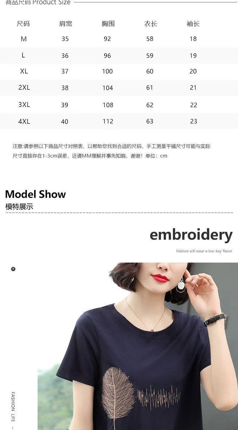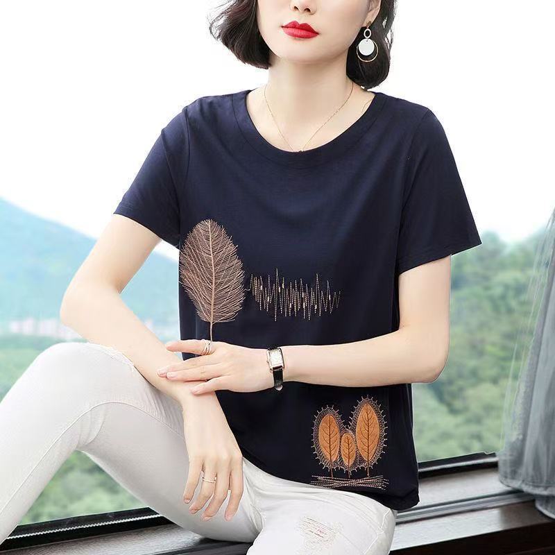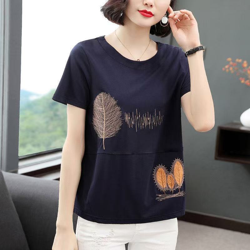 중년 어머니의 자수 반팔 티셔츠 여자 플러스 사이즈 2025 면 여름 새로운 유행 한국 느슨한 여성 탑스토어 가기