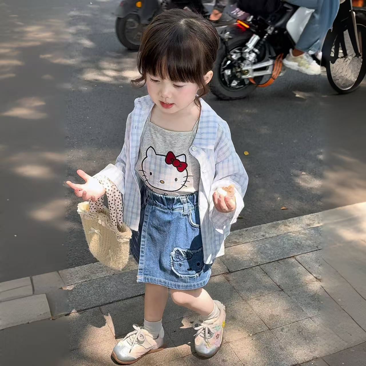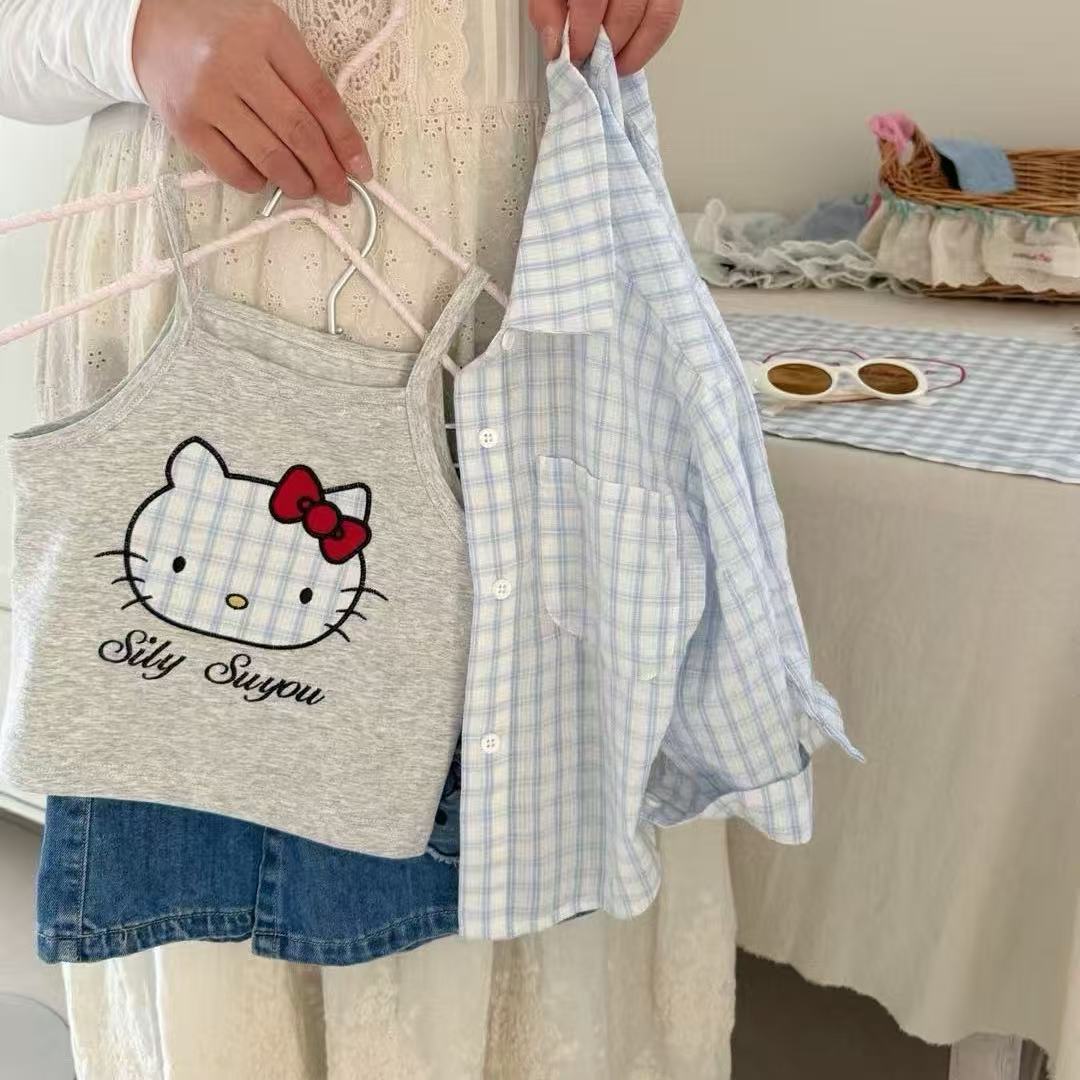 여자 봄과 여름 세트 2025 새로운 외국 스타일 아기 소녀 귀여운 kt 고양이 멜빵 탑 스커트 바지 세트스토어 가기