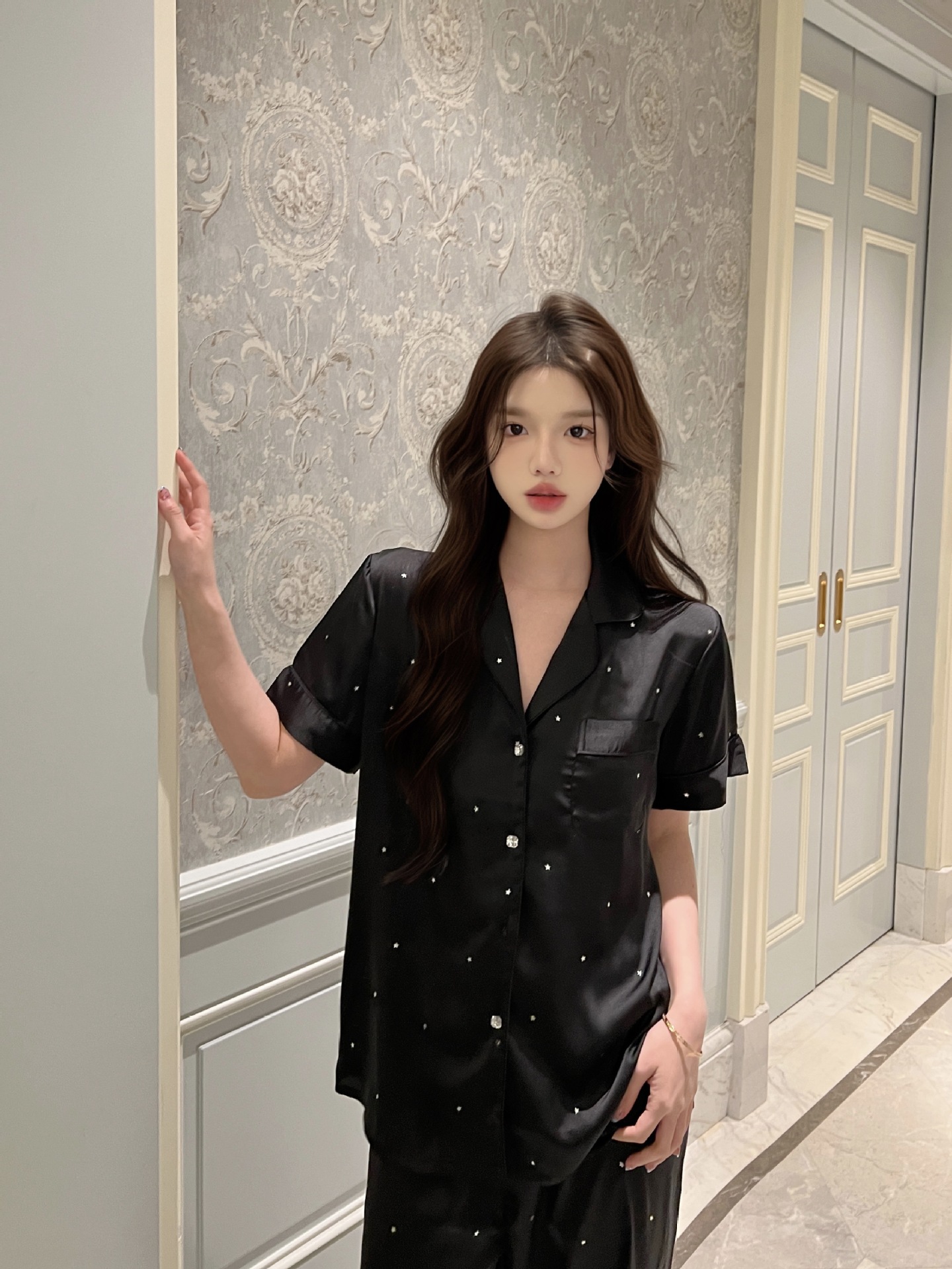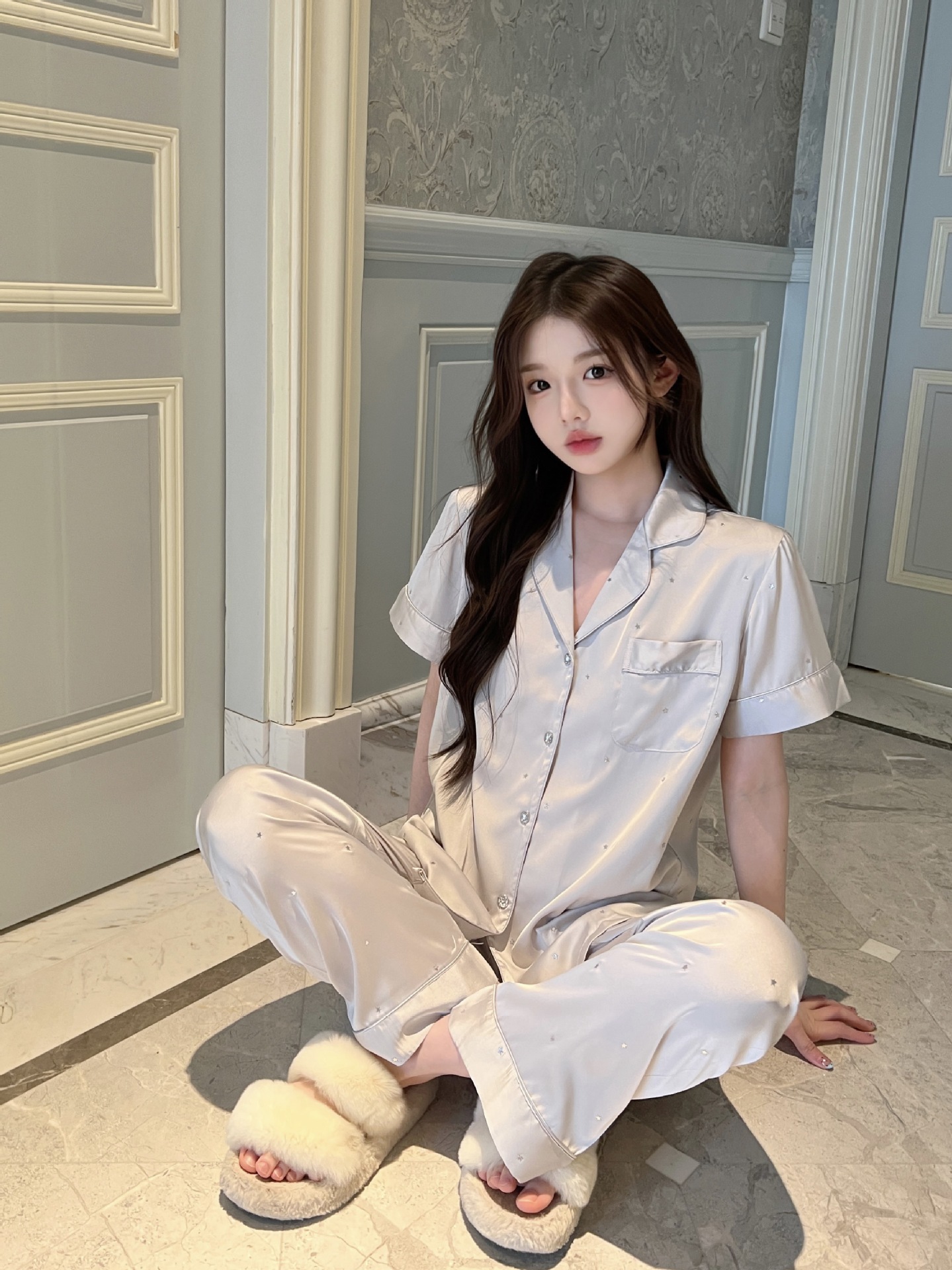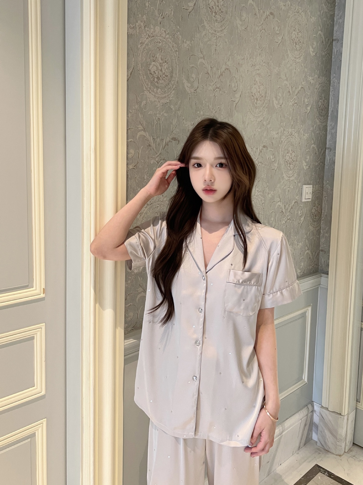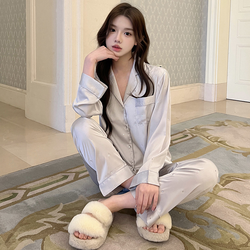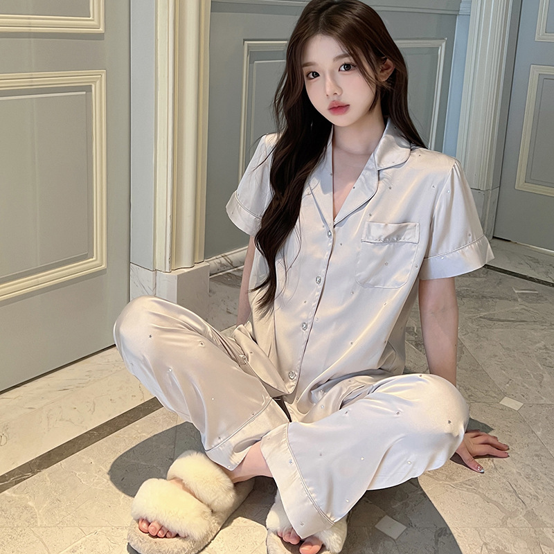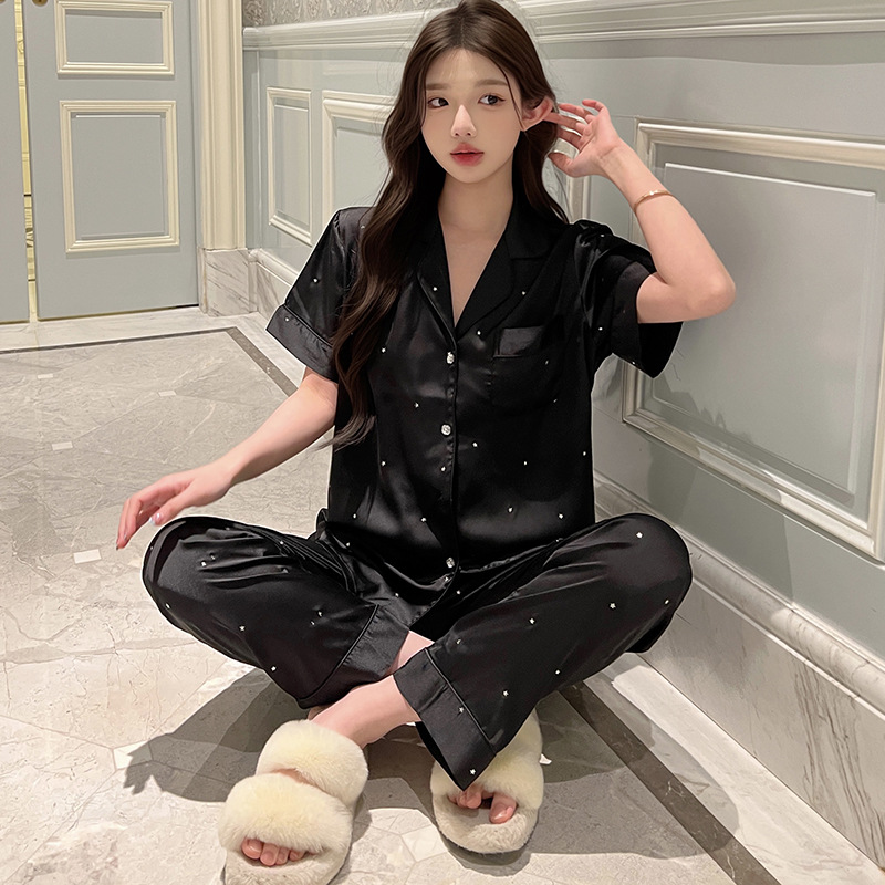 2025 새로운 아이스 실크 파자마 여성용 리틀 스타 옷깃 얇은 솔리드 컬러 하이 엔드 센스 홈 의류 세트 착용 가능스토어 가기