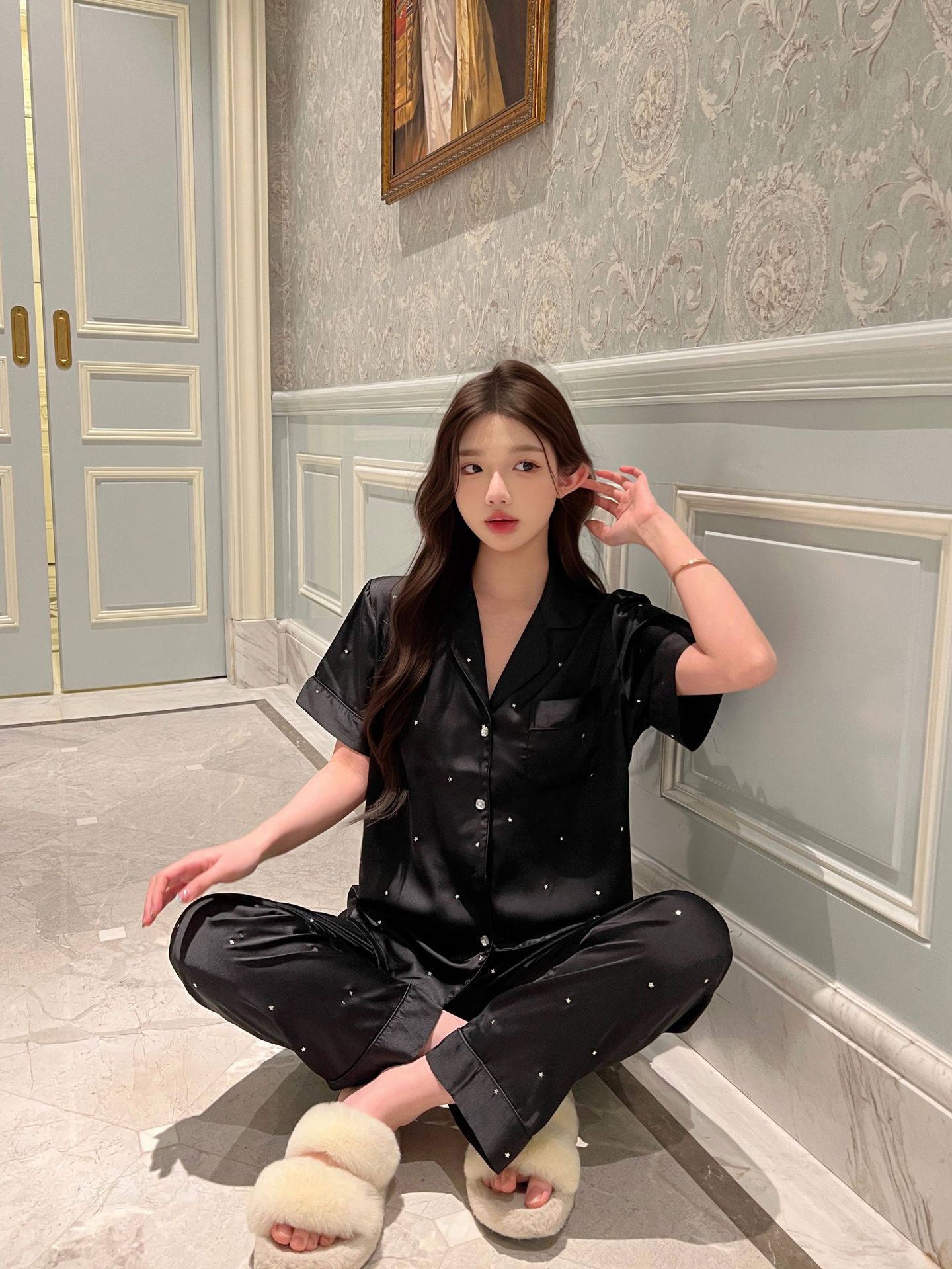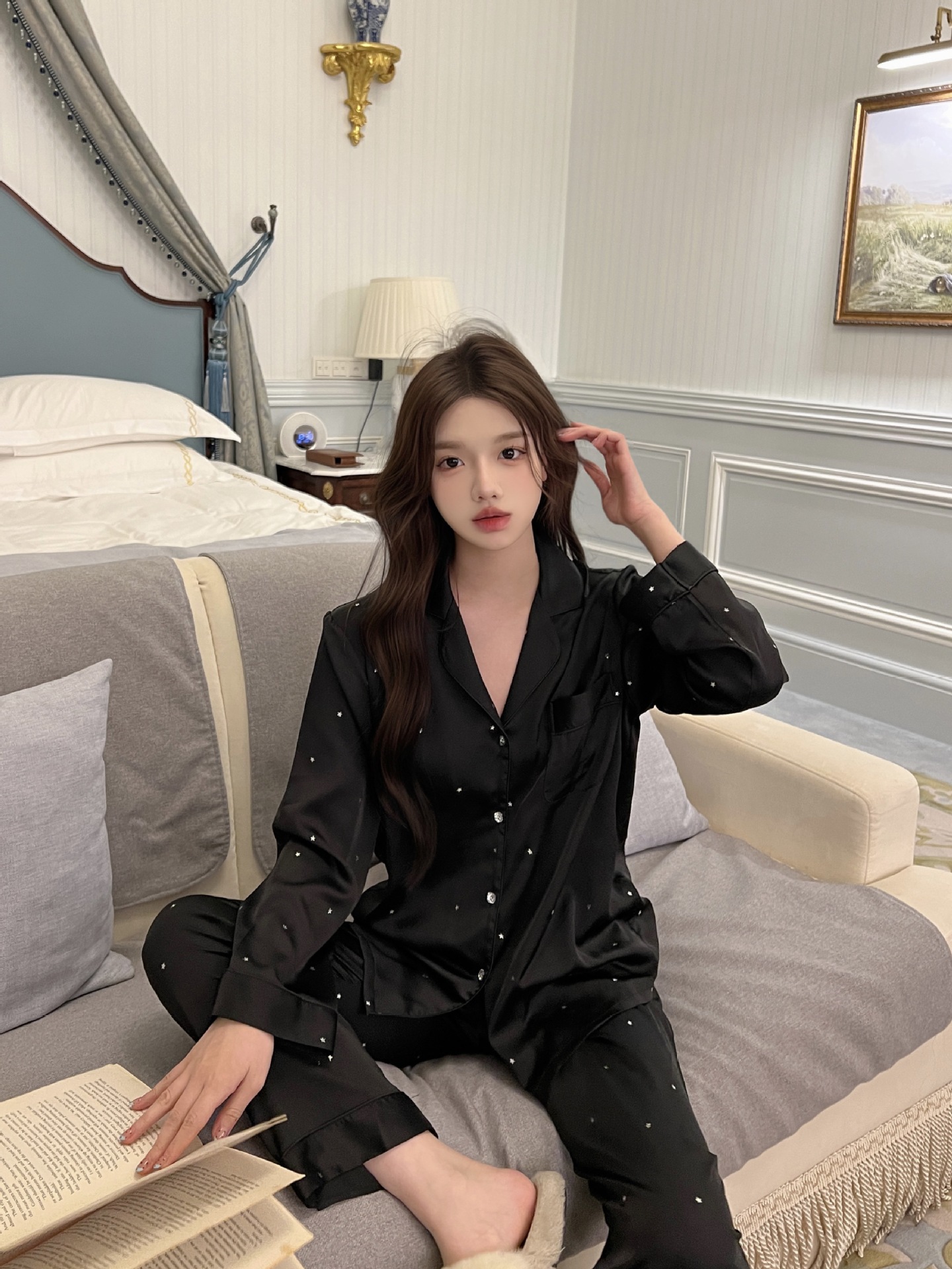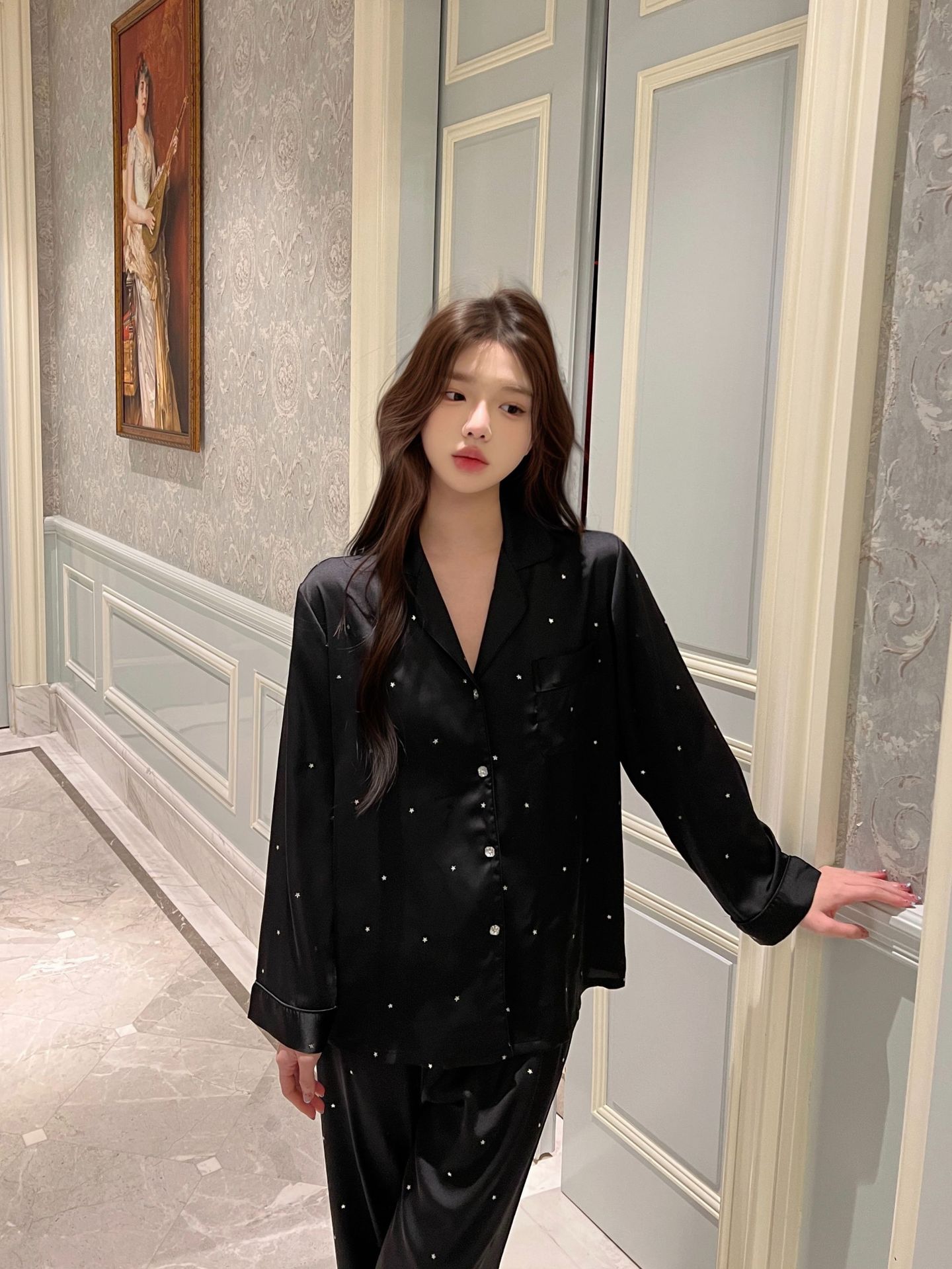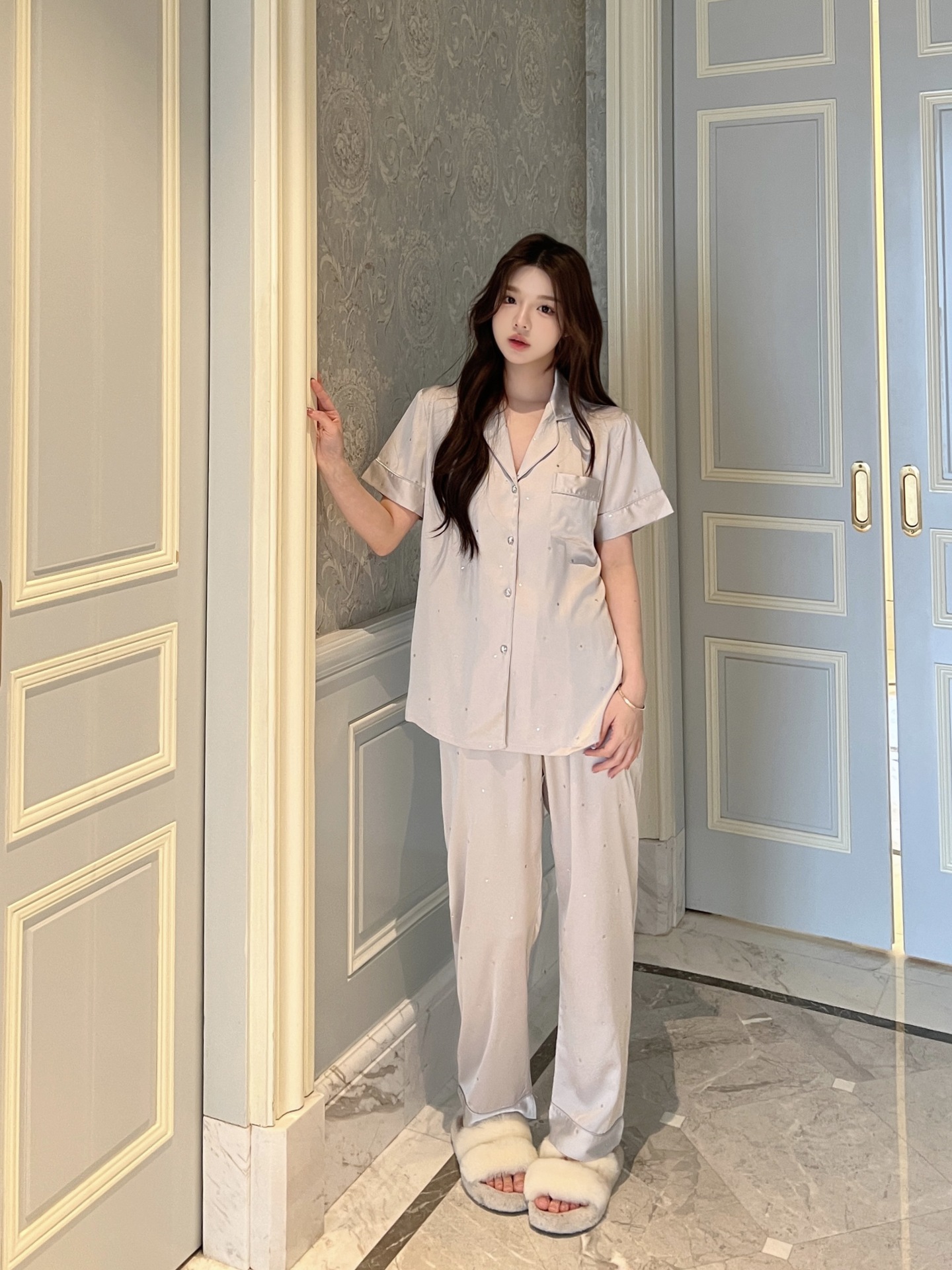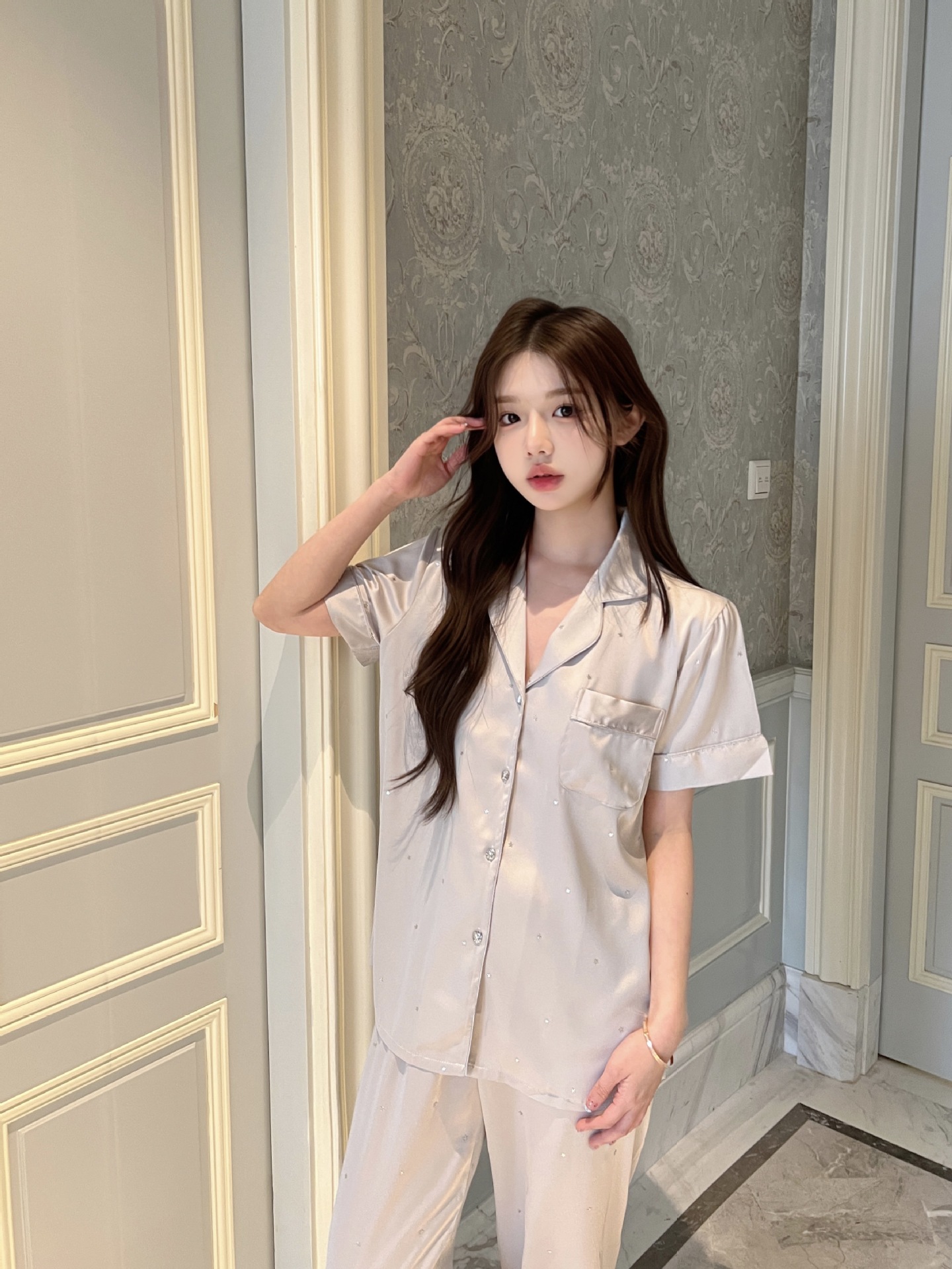 2025 새로운 아이스 실크 파자마 여성용 리틀 스타 옷깃 얇은 솔리드 컬러 하이 엔드 센스 홈 의류 세트 착용 가능스토어 가기