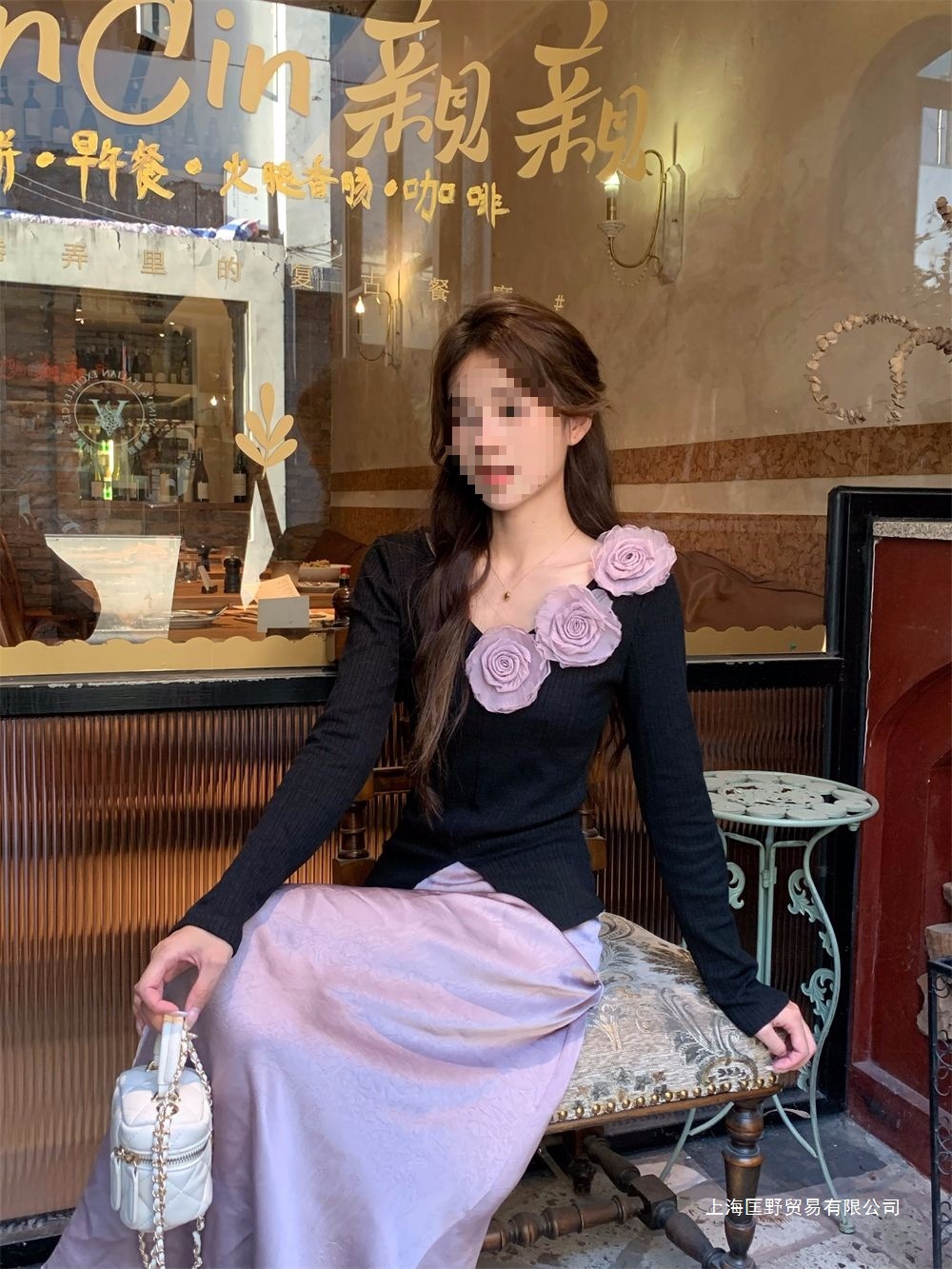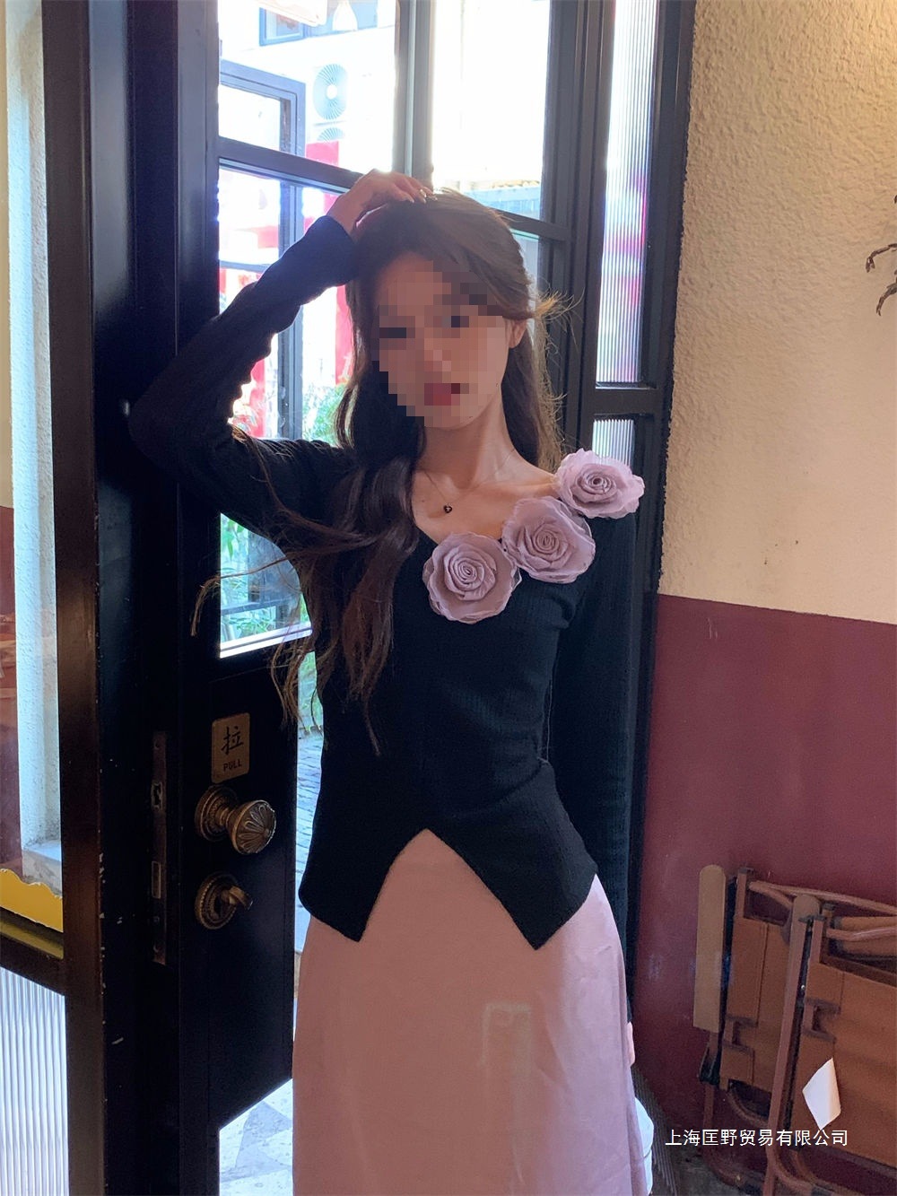 프랑스 스타일 3 차원 로즈 우아한 긴 소매 니트 스웨터 높은 허리 절반 길이 원피스 가을 새로운 패션 세트 여성 패션스토어 가기