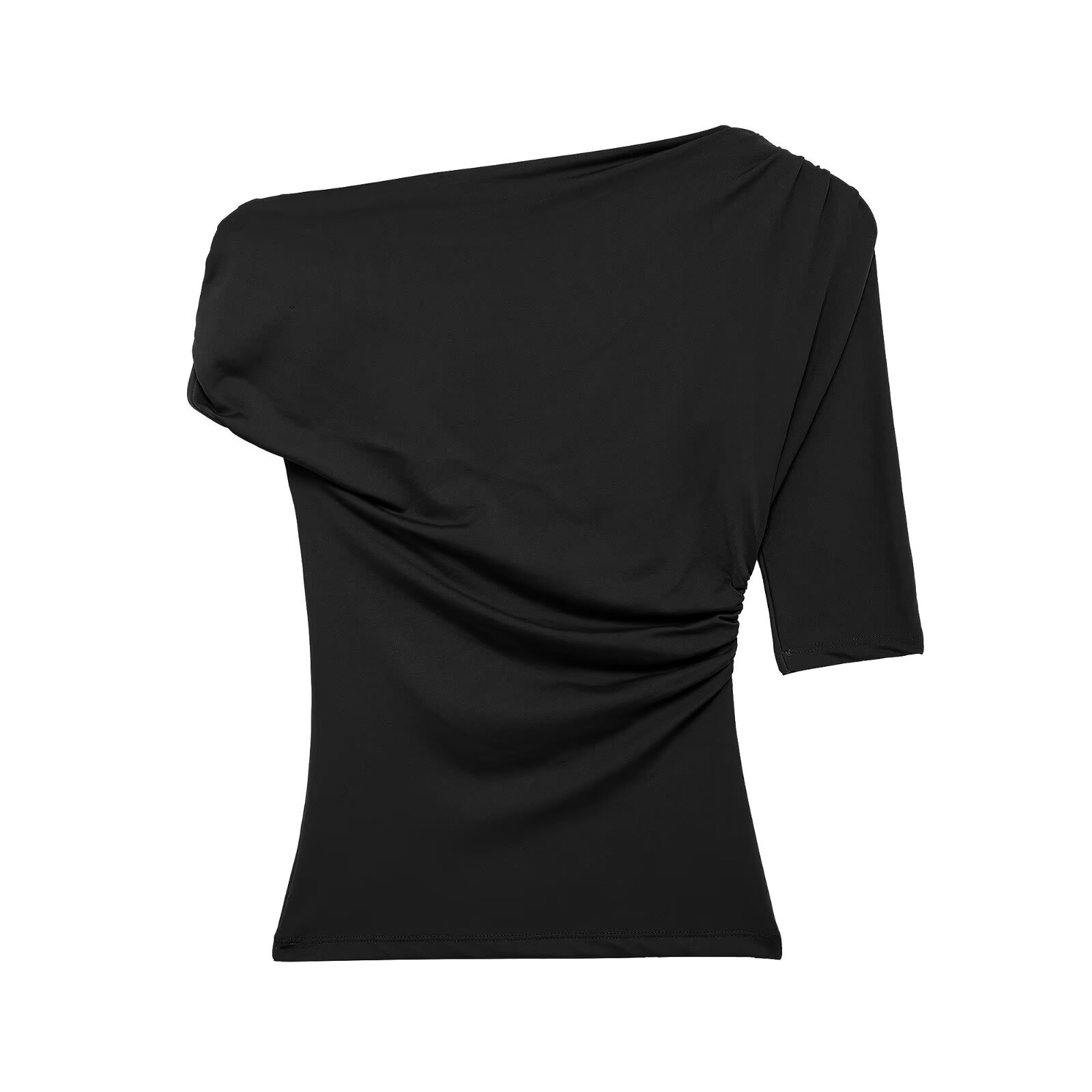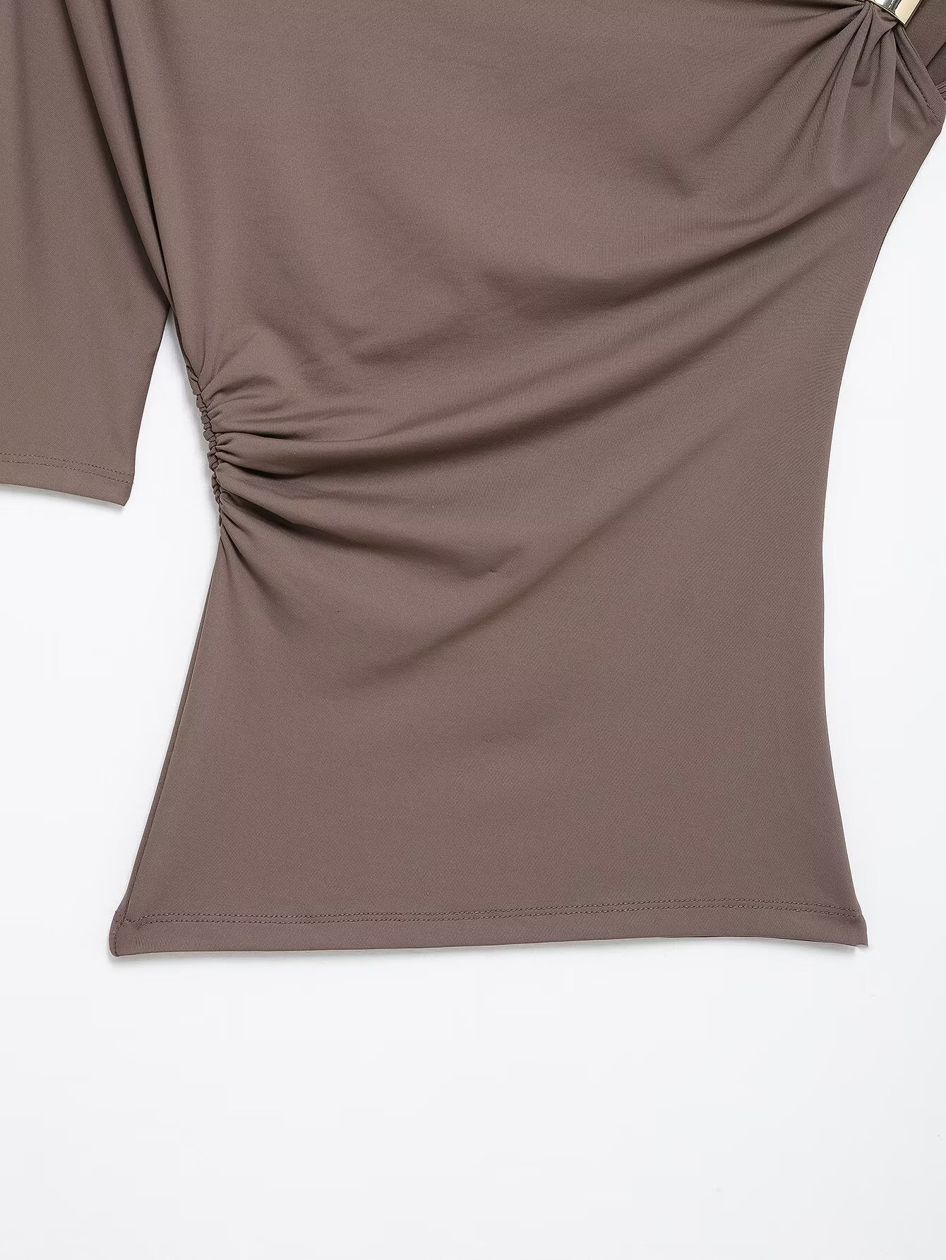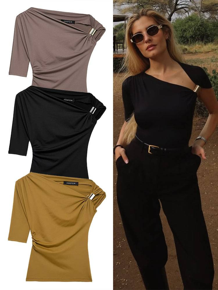 크로스보더 여성 메탈 장식 비대칭 풀오버 탑 여름 유럽 및 미국 스타일 주름 단일 소매 신축성 슬림핏 캐주얼 티셔츠