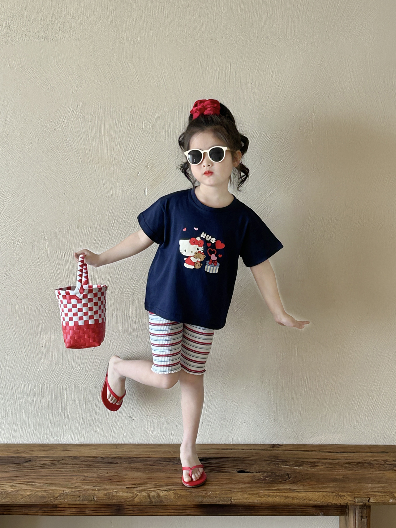 여자 서양식 반팔 티셔츠 2025 여름 새 도착 한국 스타일 만화 KT 고양이 톱 스트라이프 중장 바지