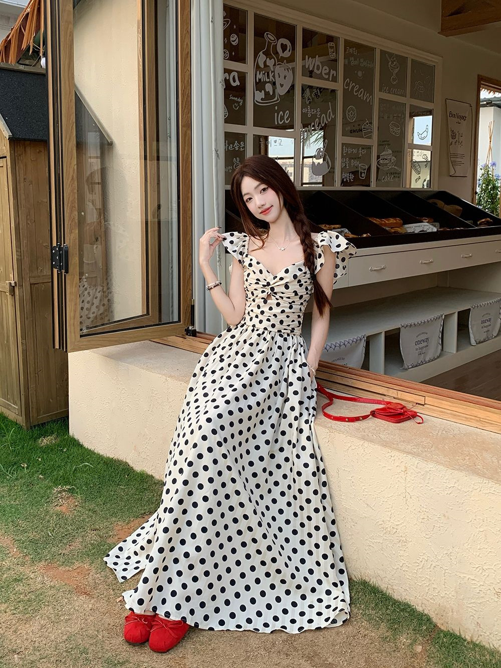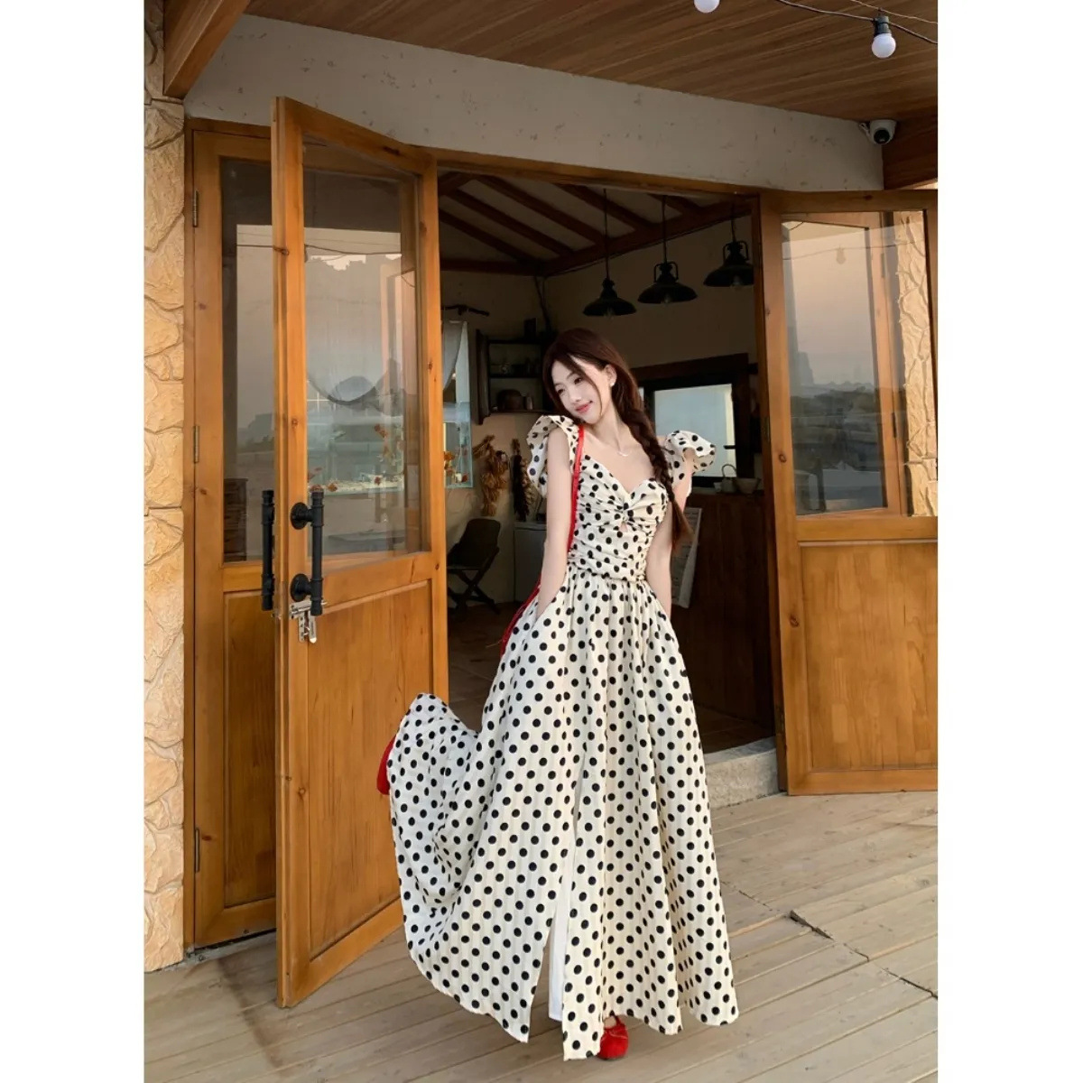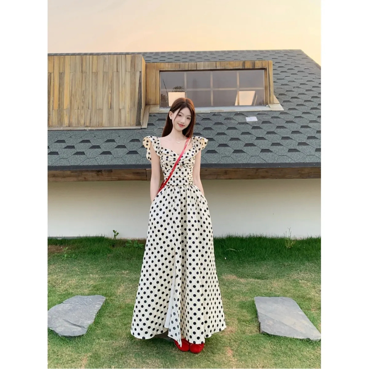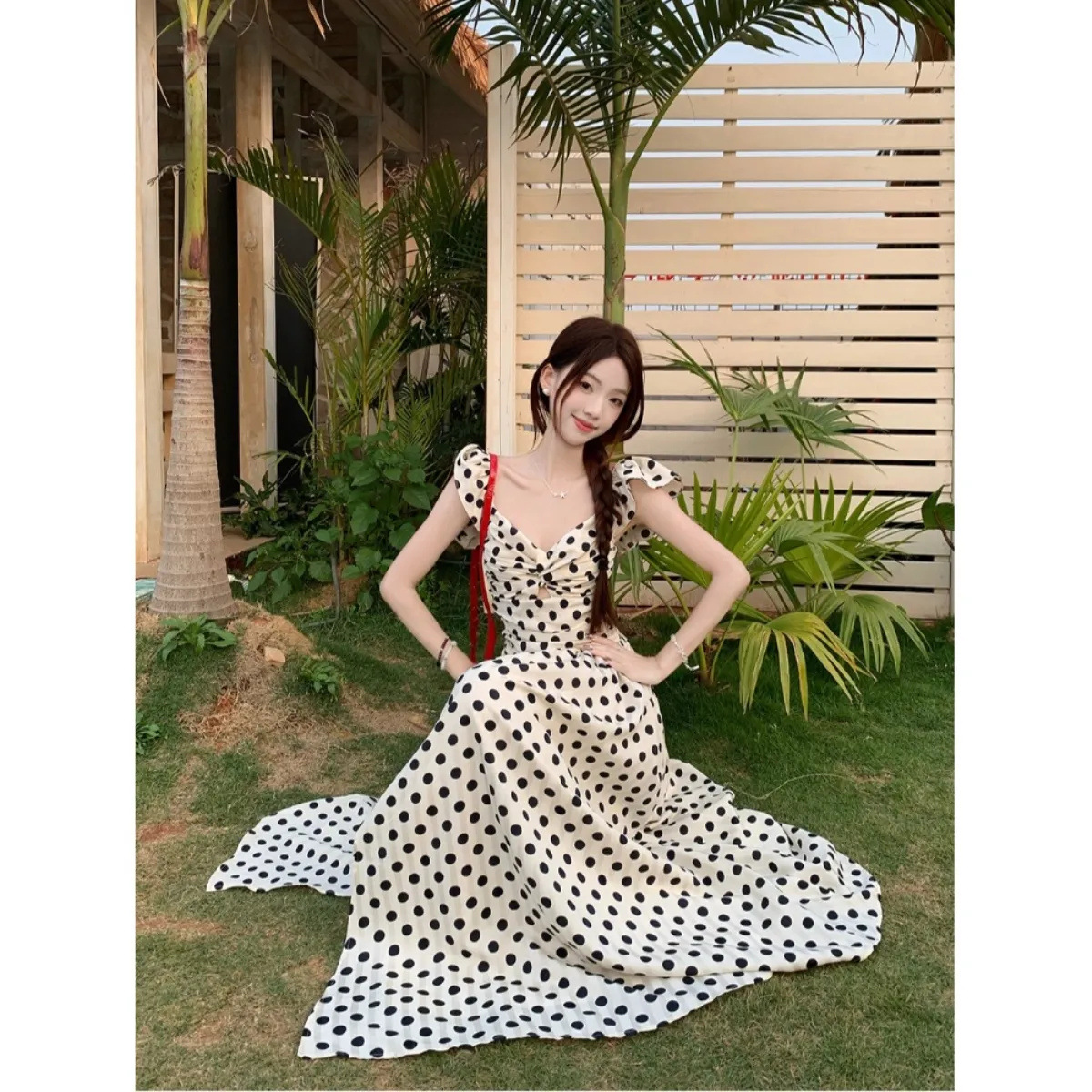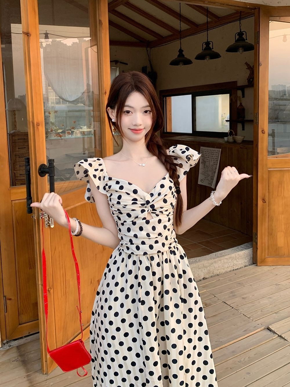 디자인 센스 주름 작은 비행 소매 레트로 폴크 도트 원피스 여성 여름 우아한 타이트 허리 슬리밍 휴가 원피스