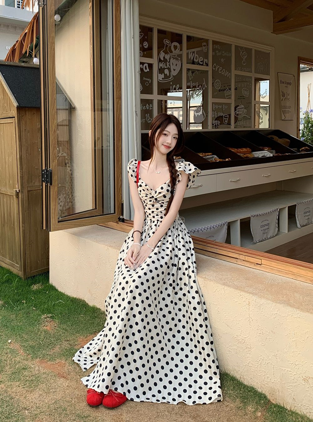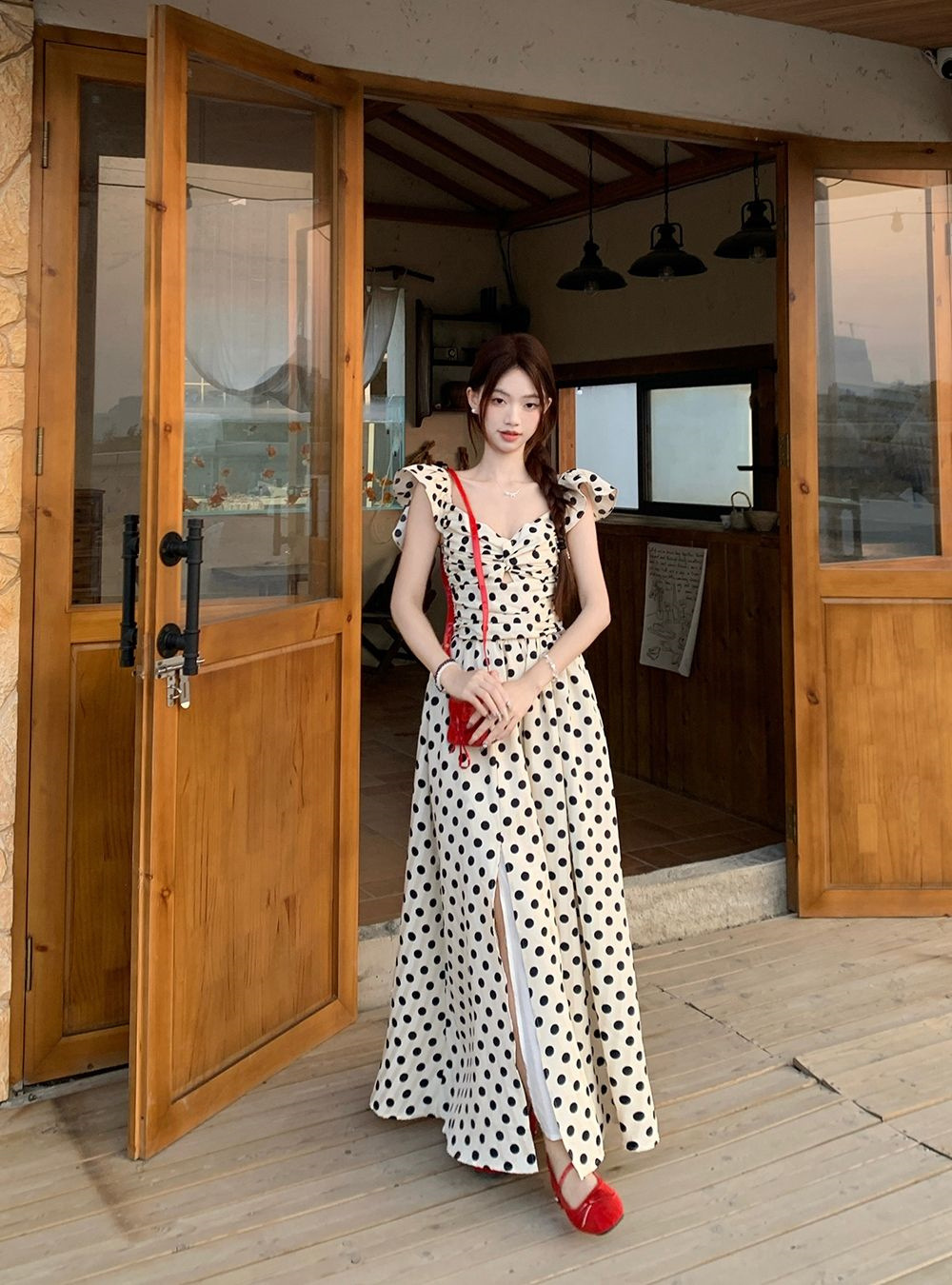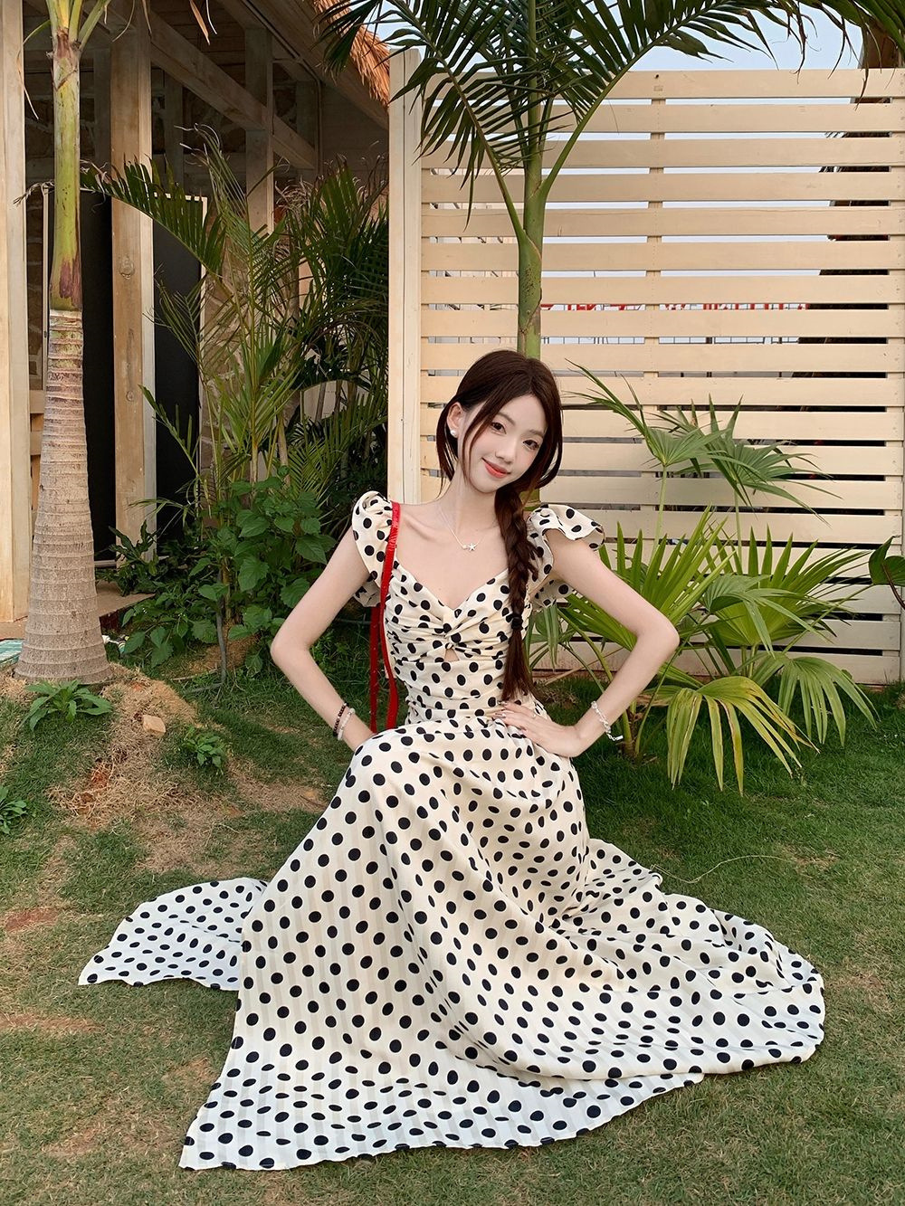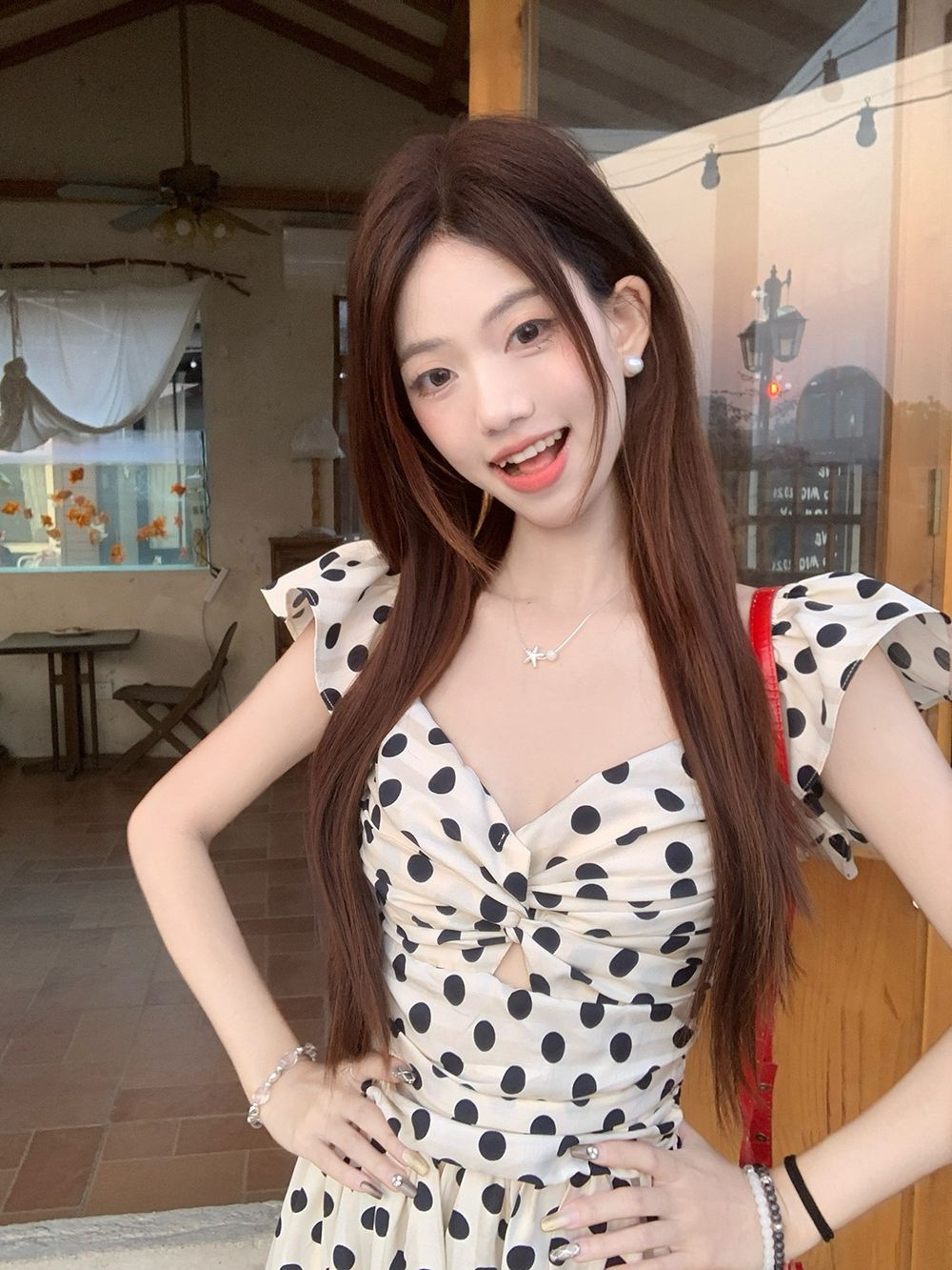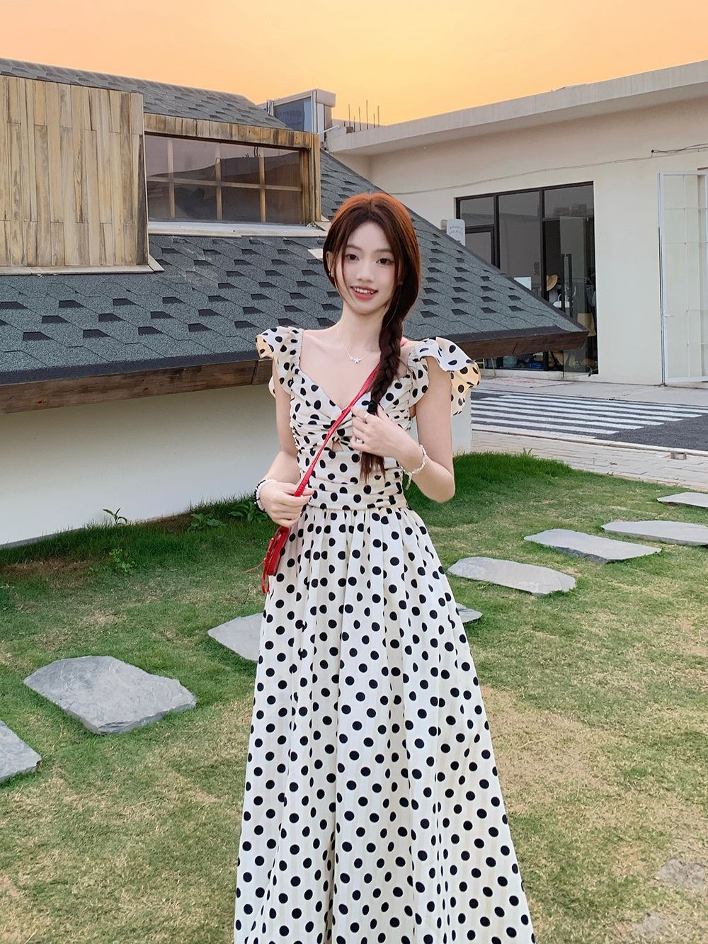 디자인 센스 주름 작은 비행 소매 레트로 폴크 도트 원피스 여성 여름 우아한 타이트 허리 슬리밍 휴가 원피스