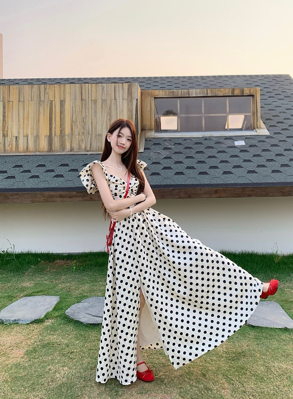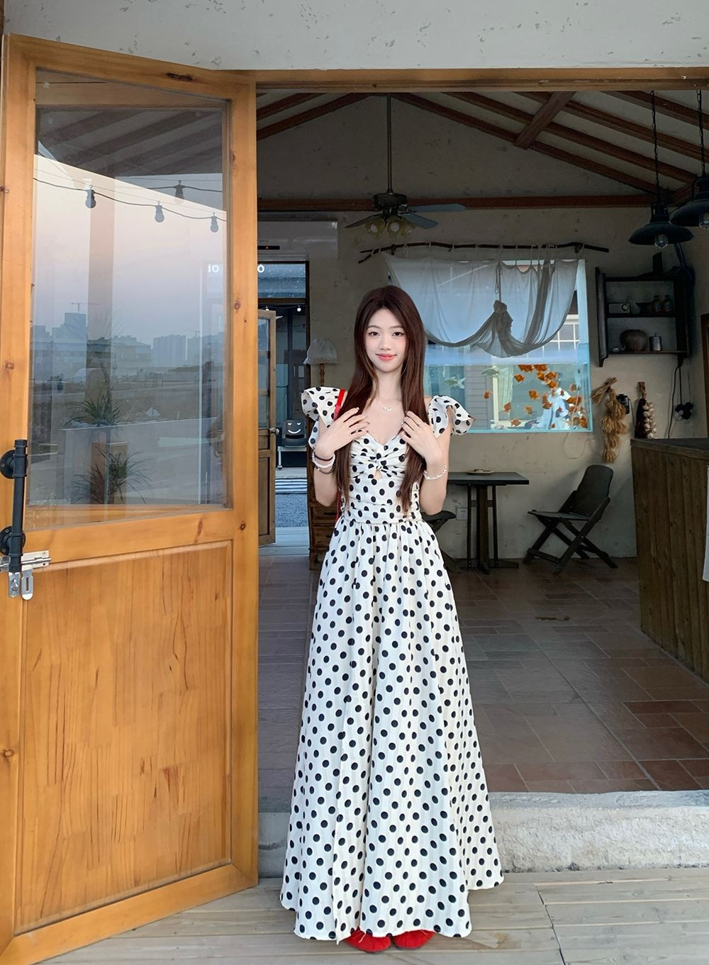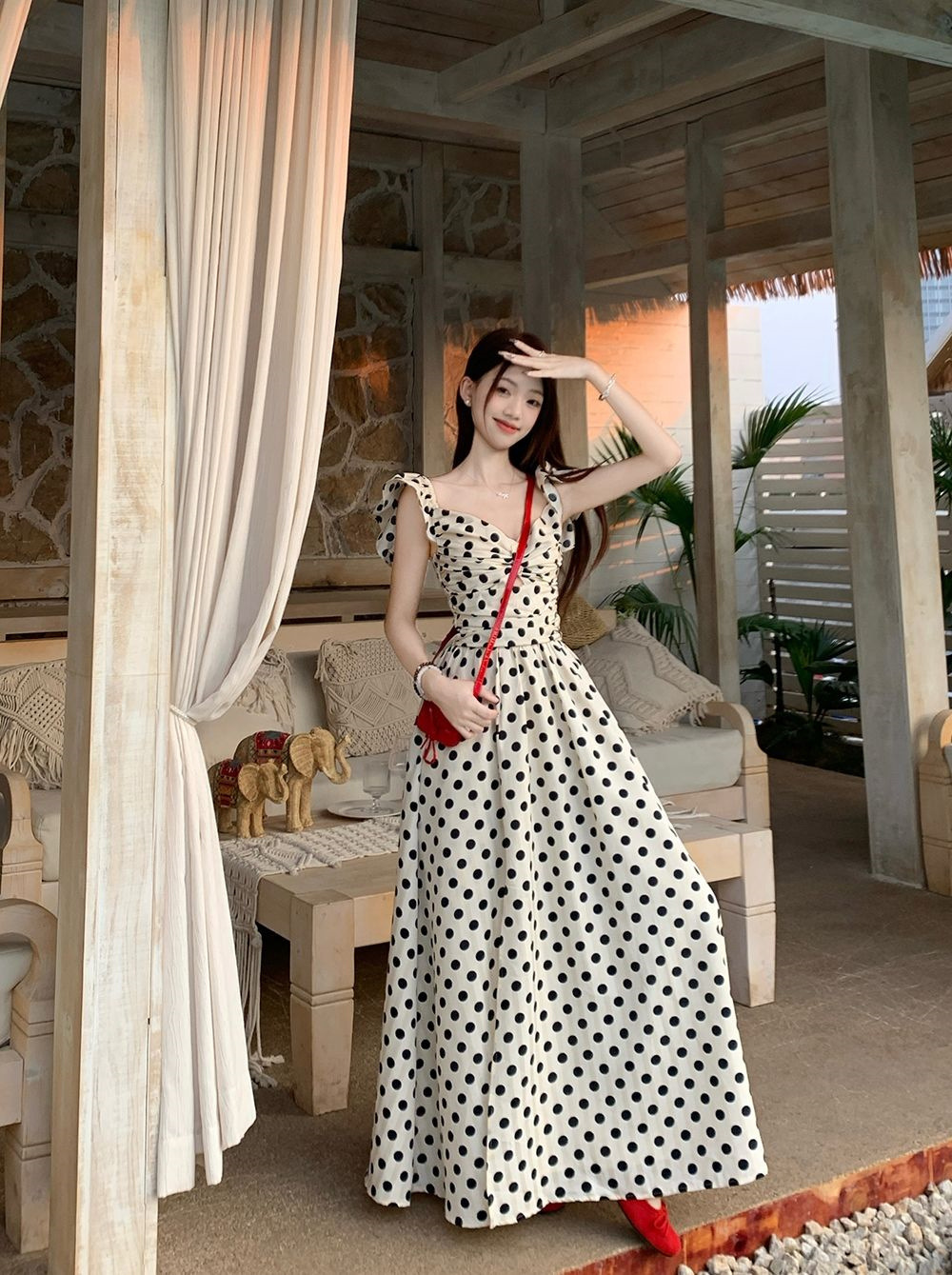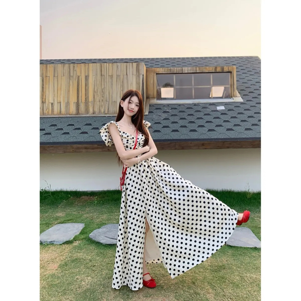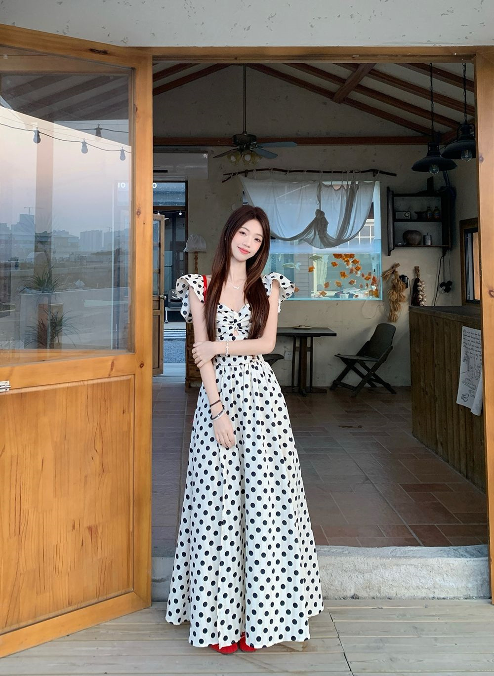 디자인 센스 주름 작은 비행 소매 레트로 폴크 도트 원피스 여성 여름 우아한 타이트 허리 슬리밍 휴가 원피스