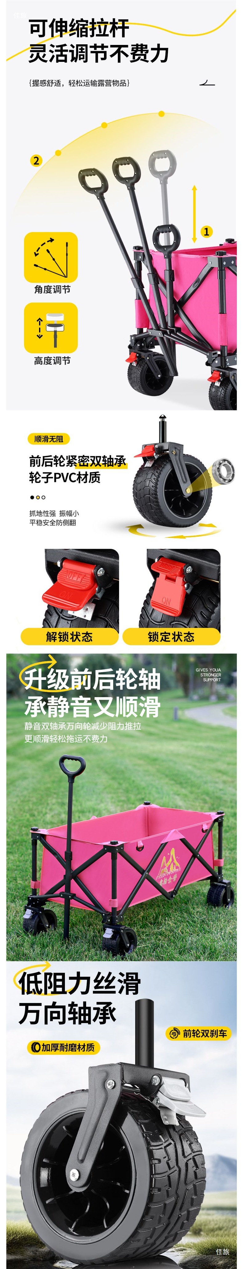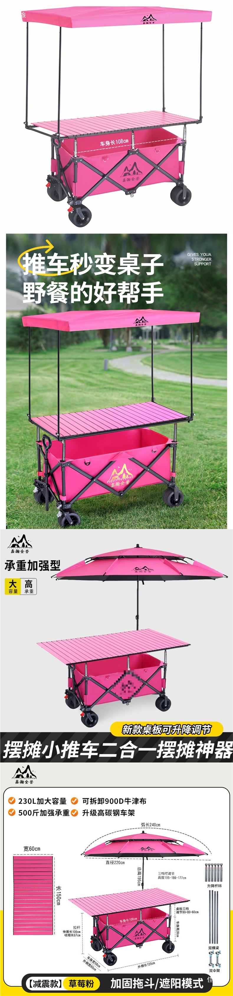 • 신제품 [사이드 포켓] 딸기 핑크 카트 + 150cm*70cm 테이블 [핑크] + 리프팅 로드 [6개] + 대형 우산 [핑크]