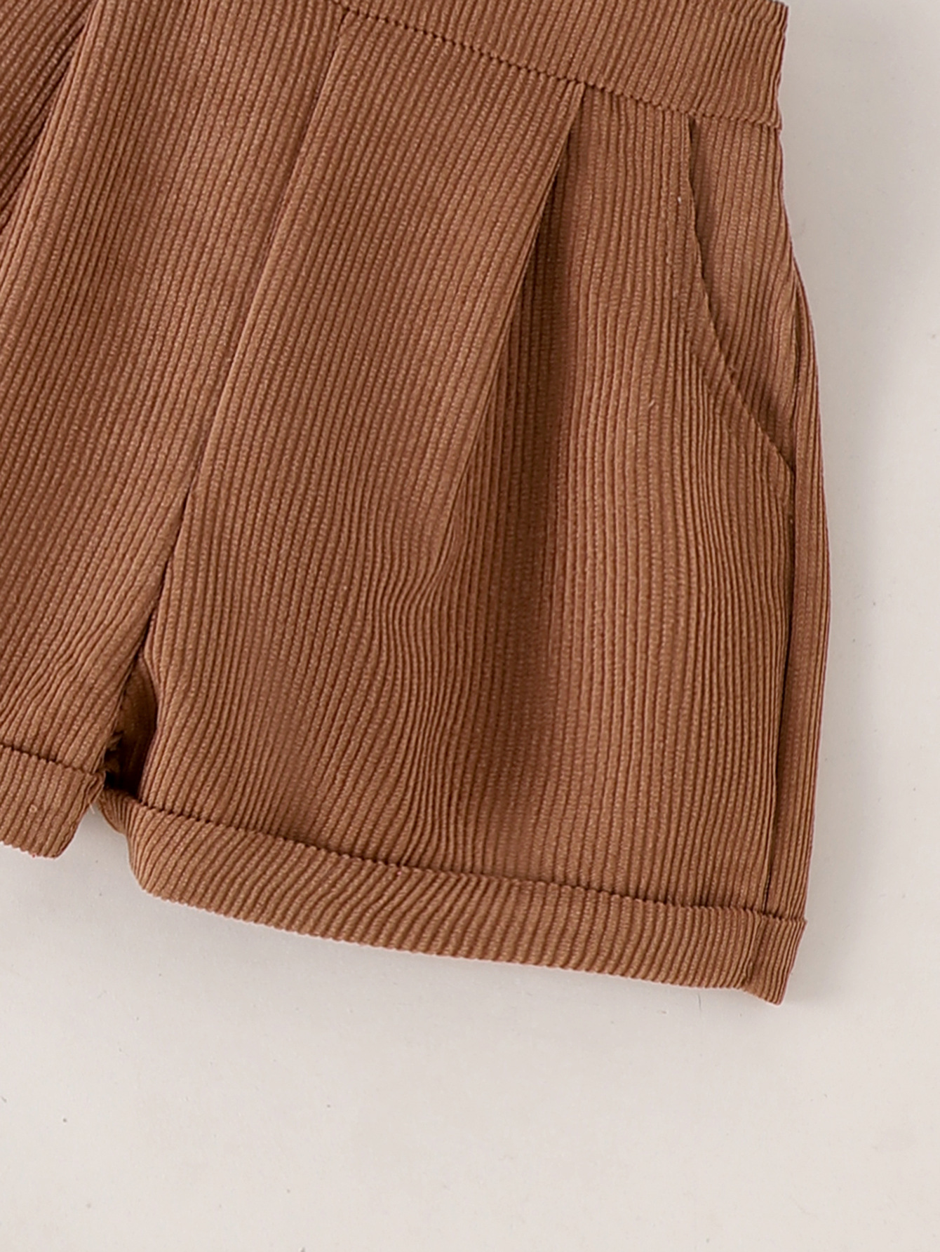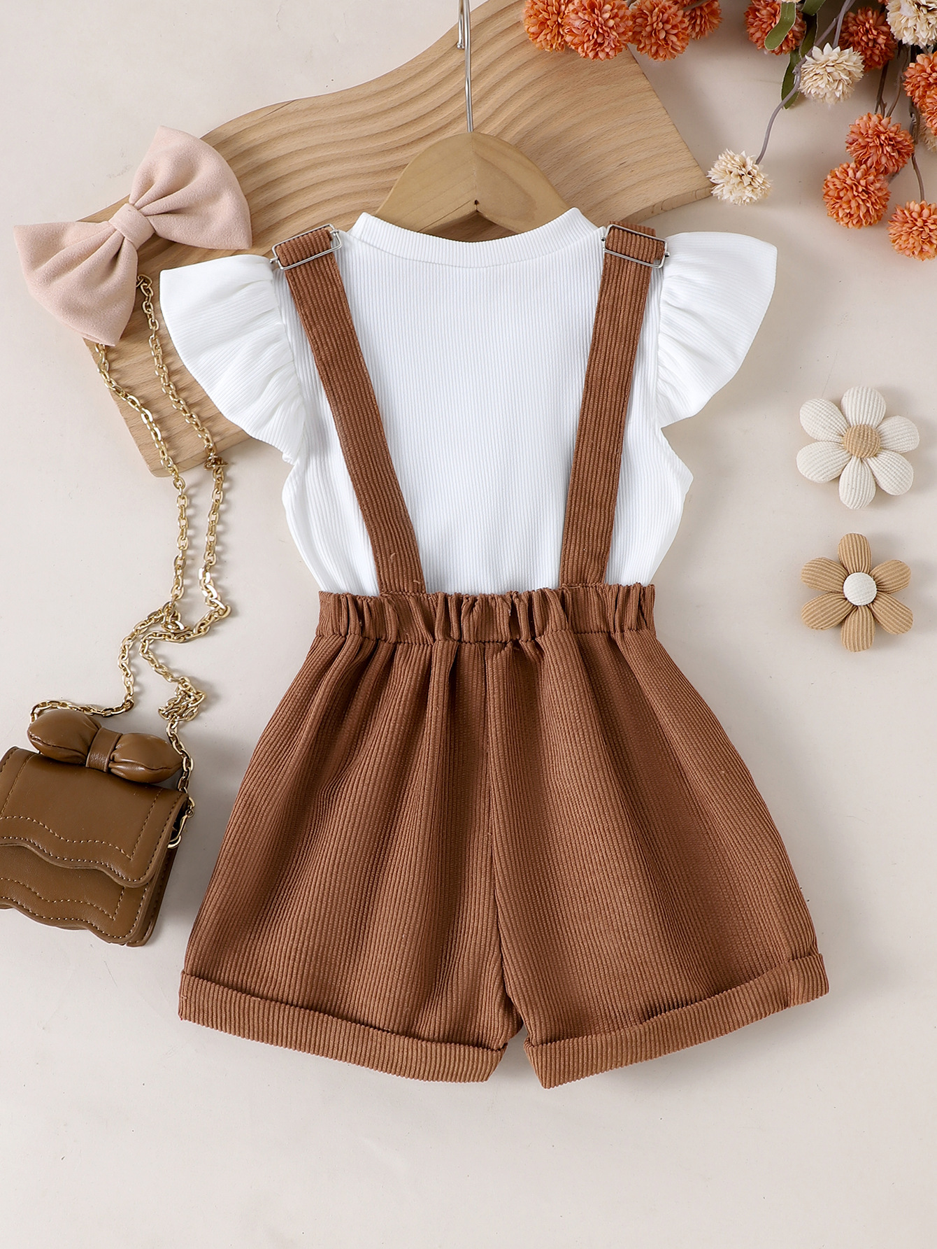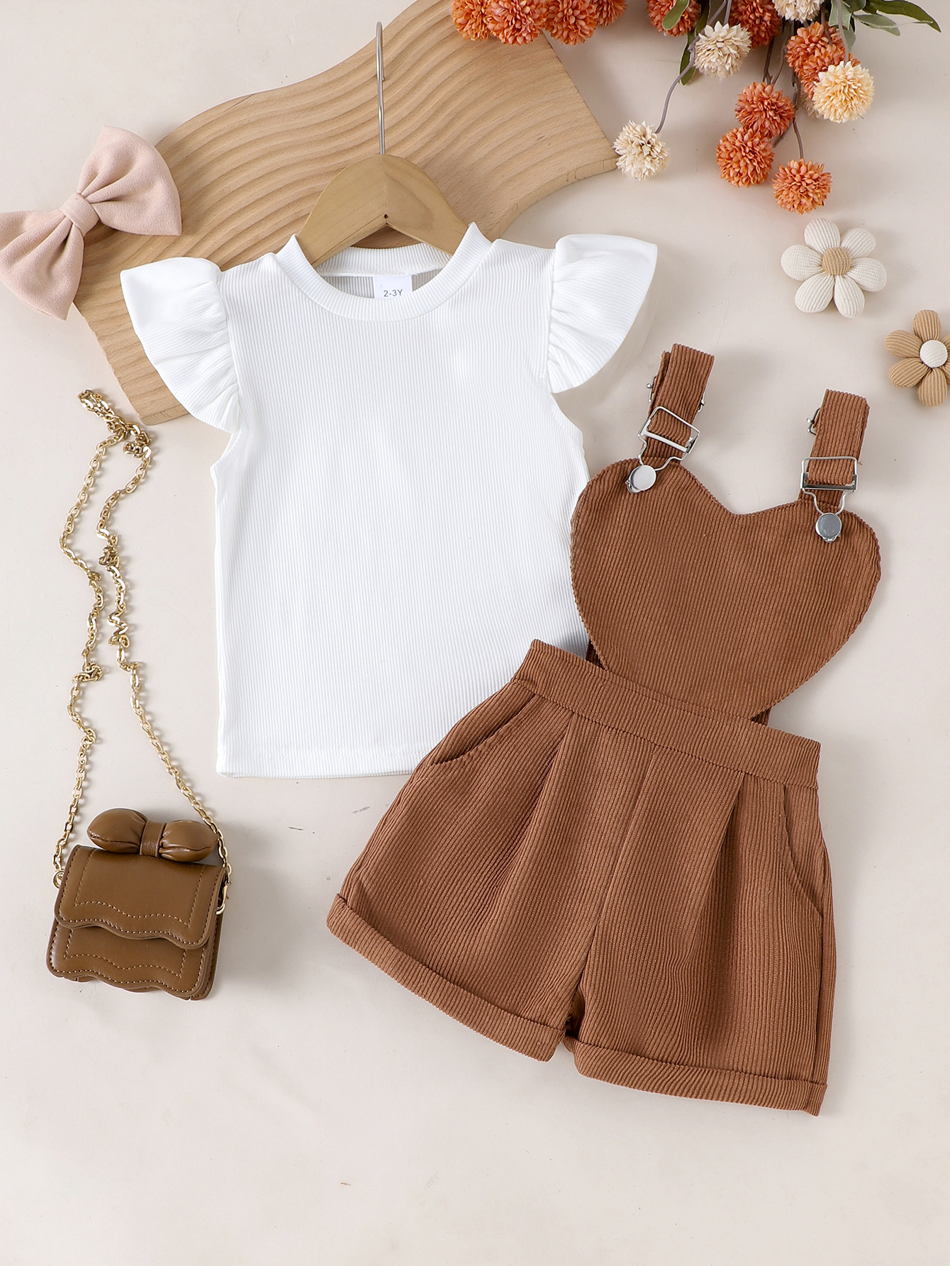 25 국경 봄과 여름 유럽과 미국의 새로운 소녀 크루 넥 작은 비행 슬리브 솔리드 컬러 탑 러브 디자인 스트랩 반바지 세트