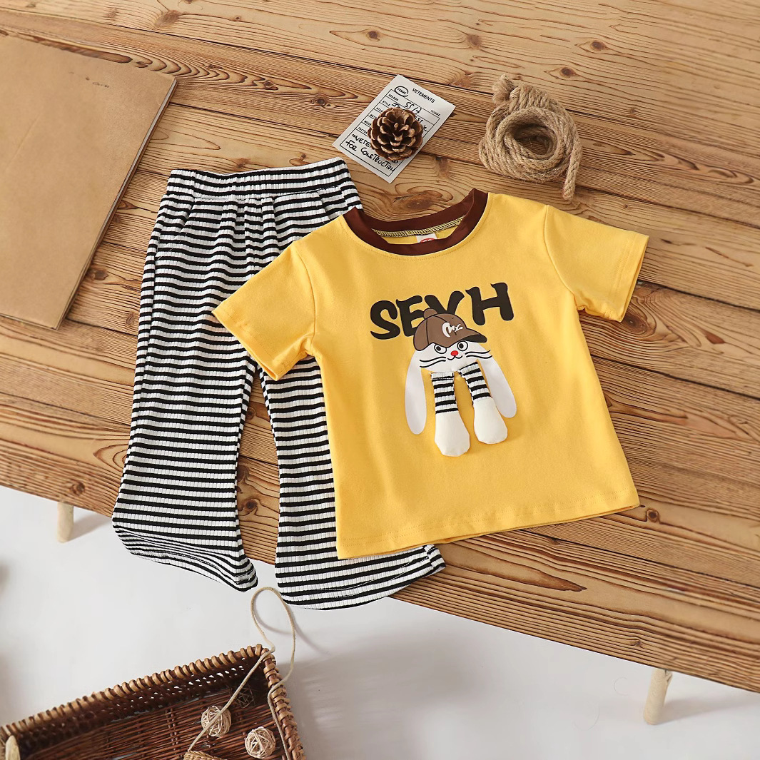 2025년 여름 여아용 새로운 줄무늬 투피스 세트, 아동용 여름 스타일 정장, 대외 무역 도매를 생방송으로 제공합니다.