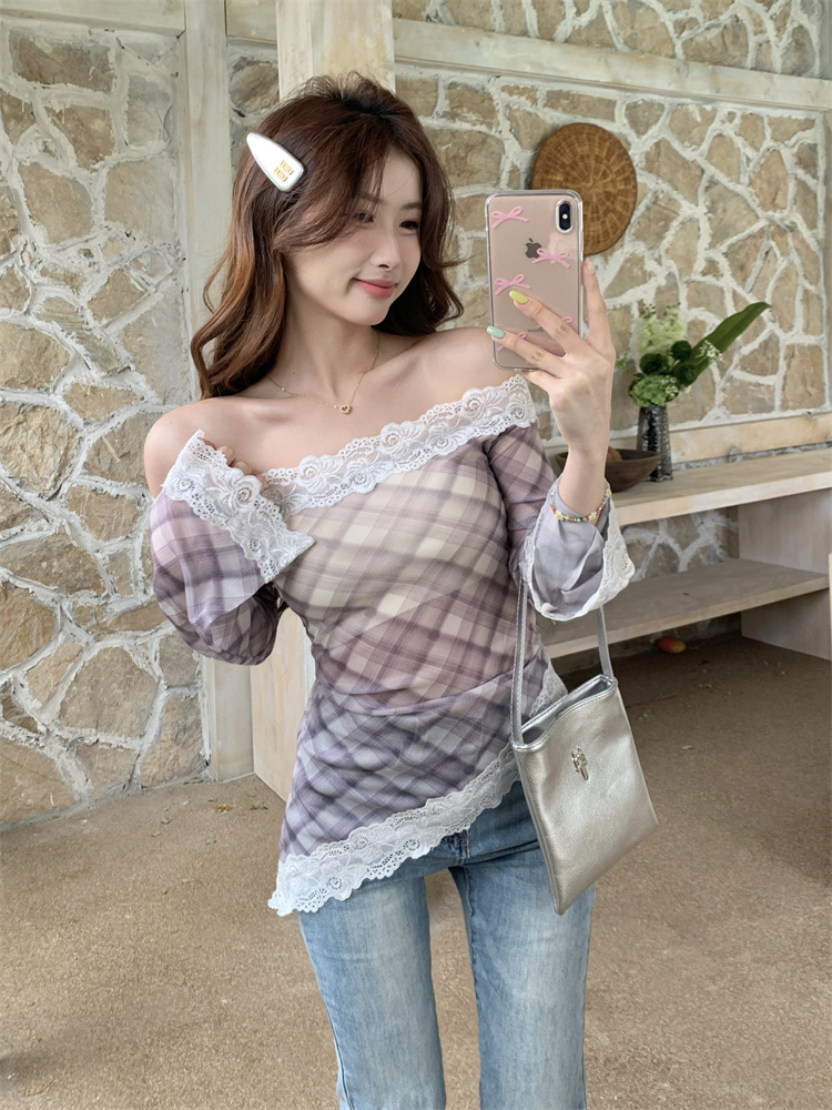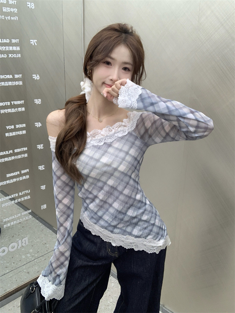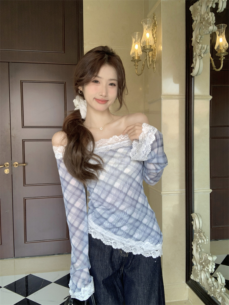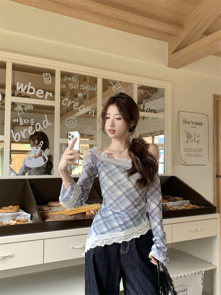 달콤한 스파이스 소녀 레이스 바느질 오프 숄더 긴팔 체크 무늬 티셔츠 여성용 봄과 여름 슬리밍 불규칙한 메쉬 탑