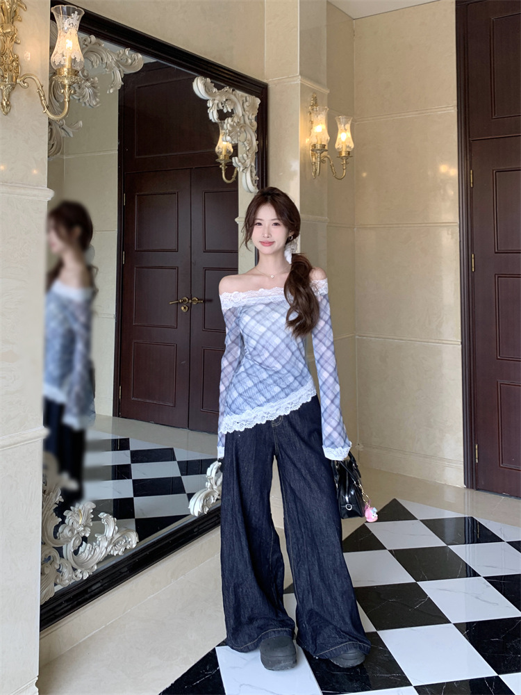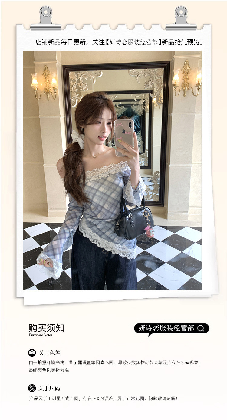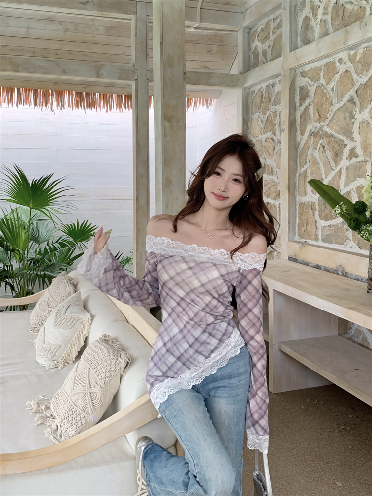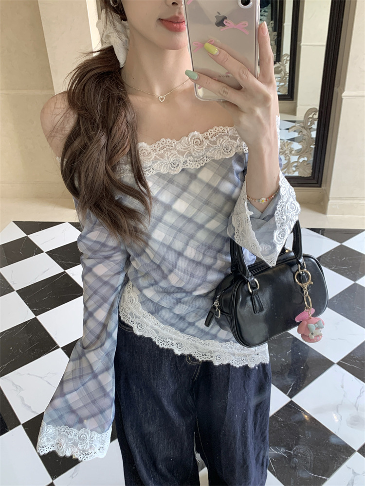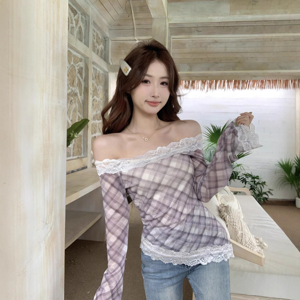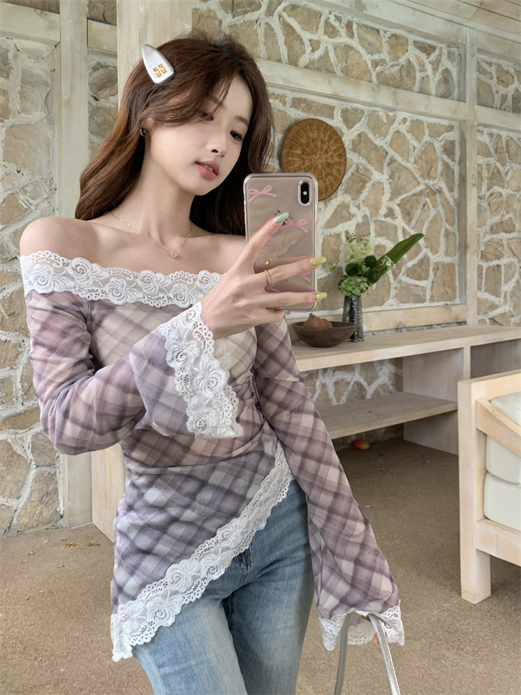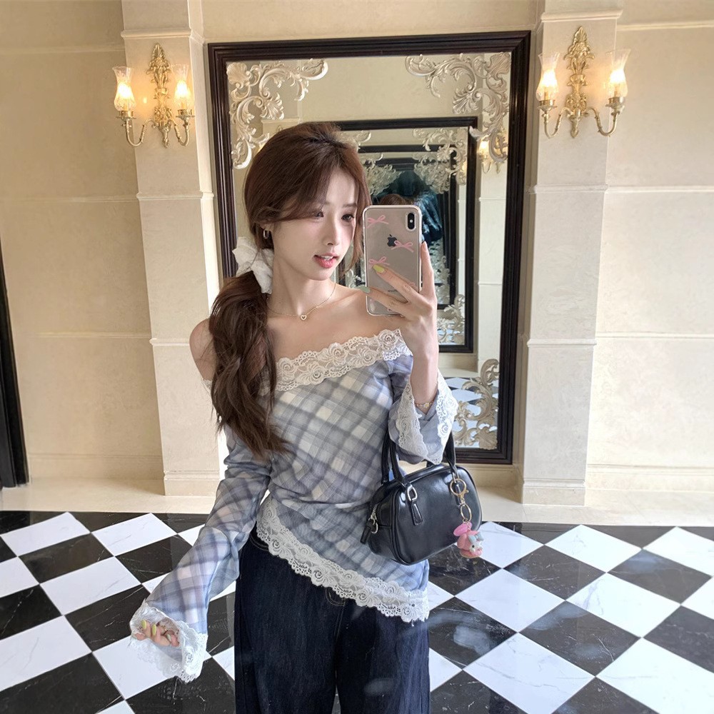 달콤한 스파이스 소녀 레이스 바느질 오프 숄더 긴팔 체크 무늬 티셔츠 여성용 봄과 여름 슬리밍 불규칙한 메쉬 탑스토어 가기