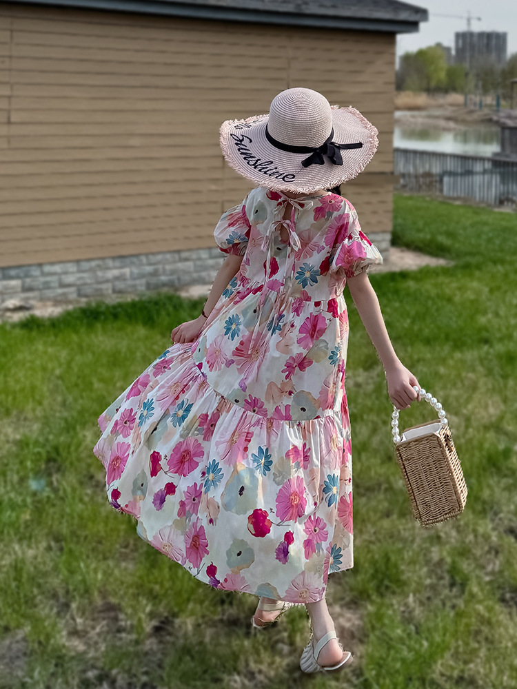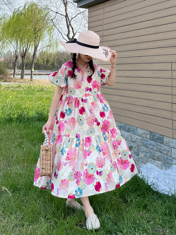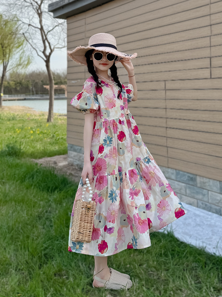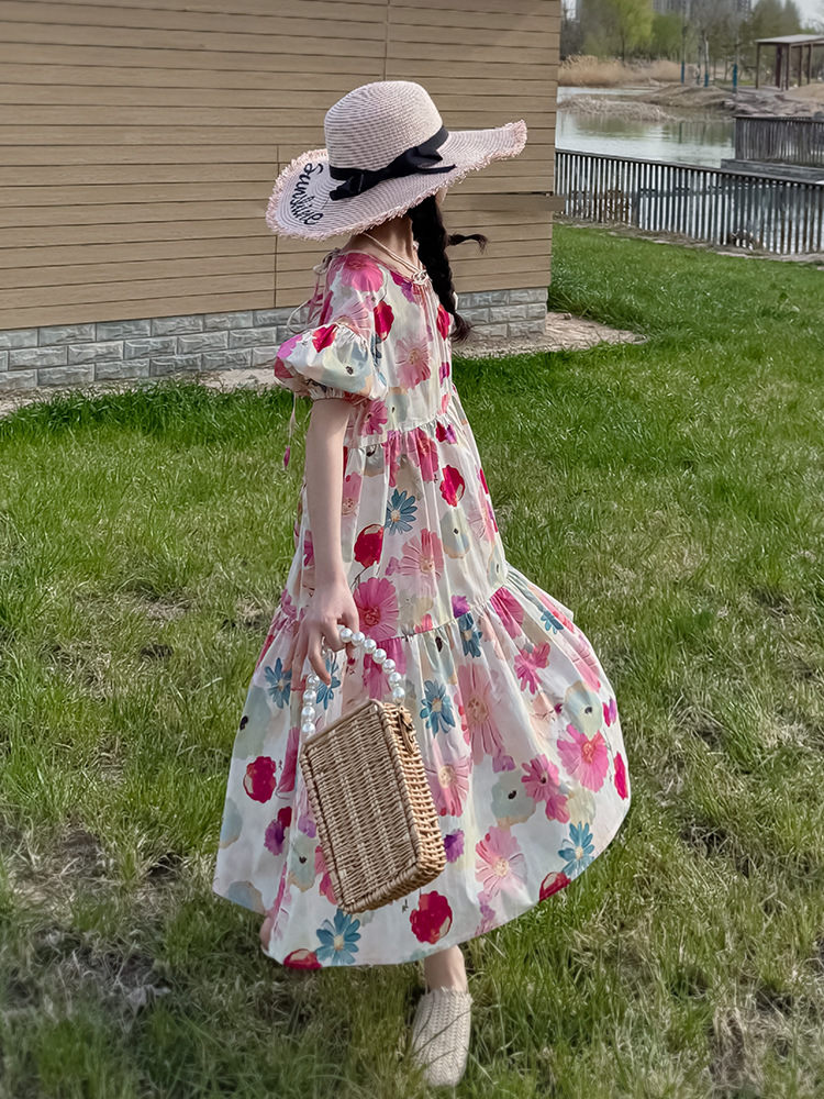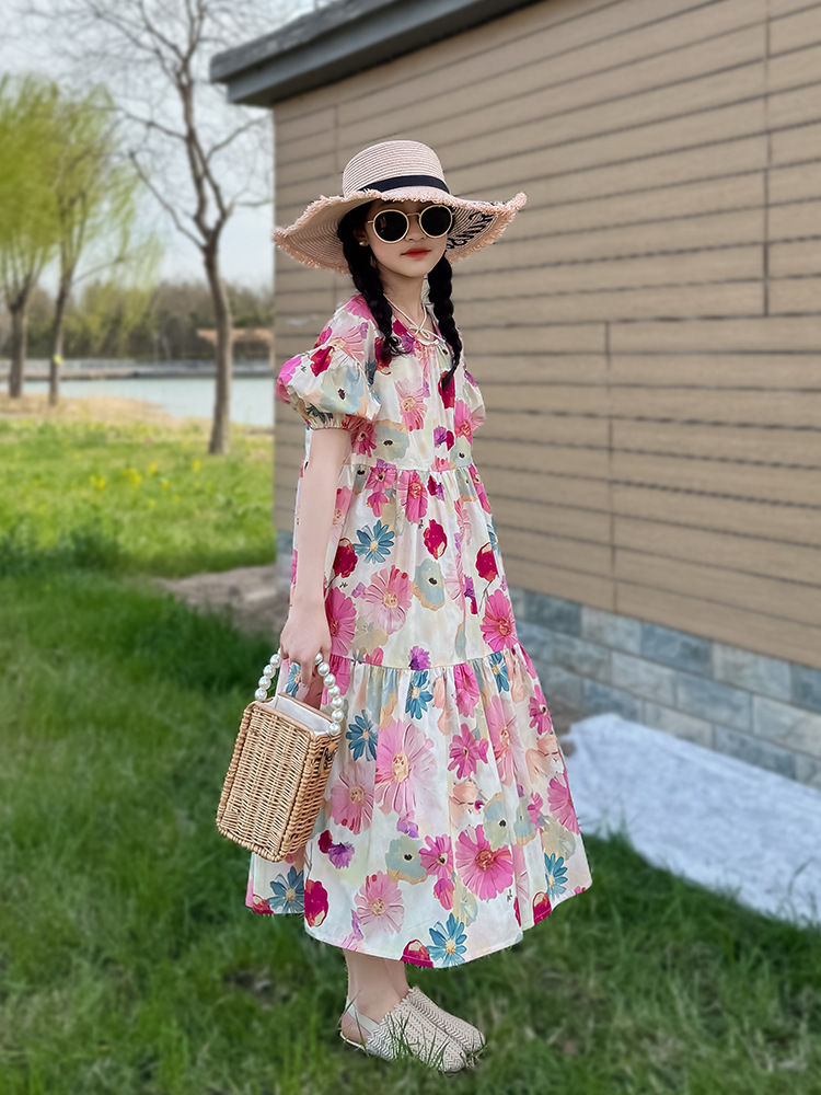 QZ3430 여름 새 부모-어린이 착용 소녀 면 꽃 반팔 원피스 A 라인 스커트 국경 간 공급스토어 가기