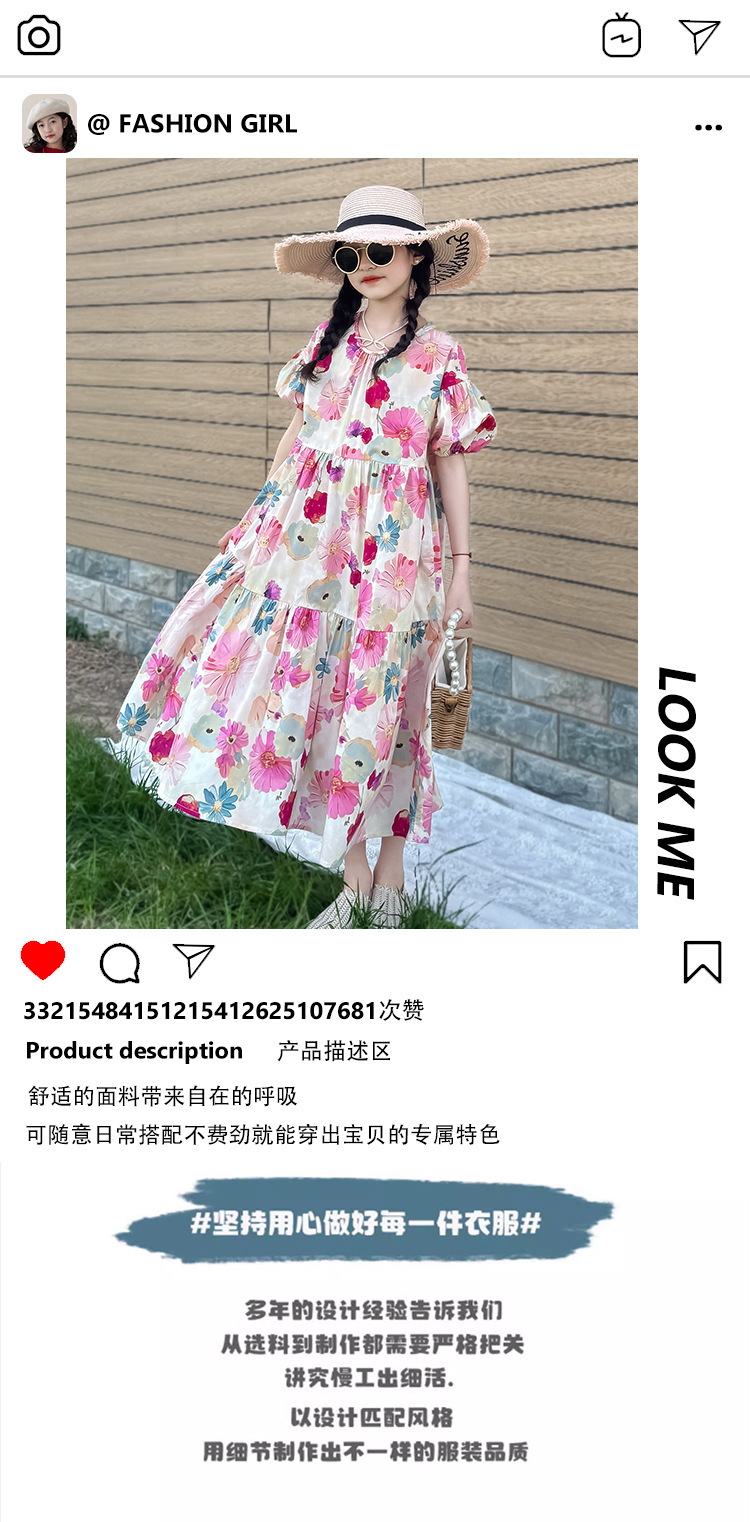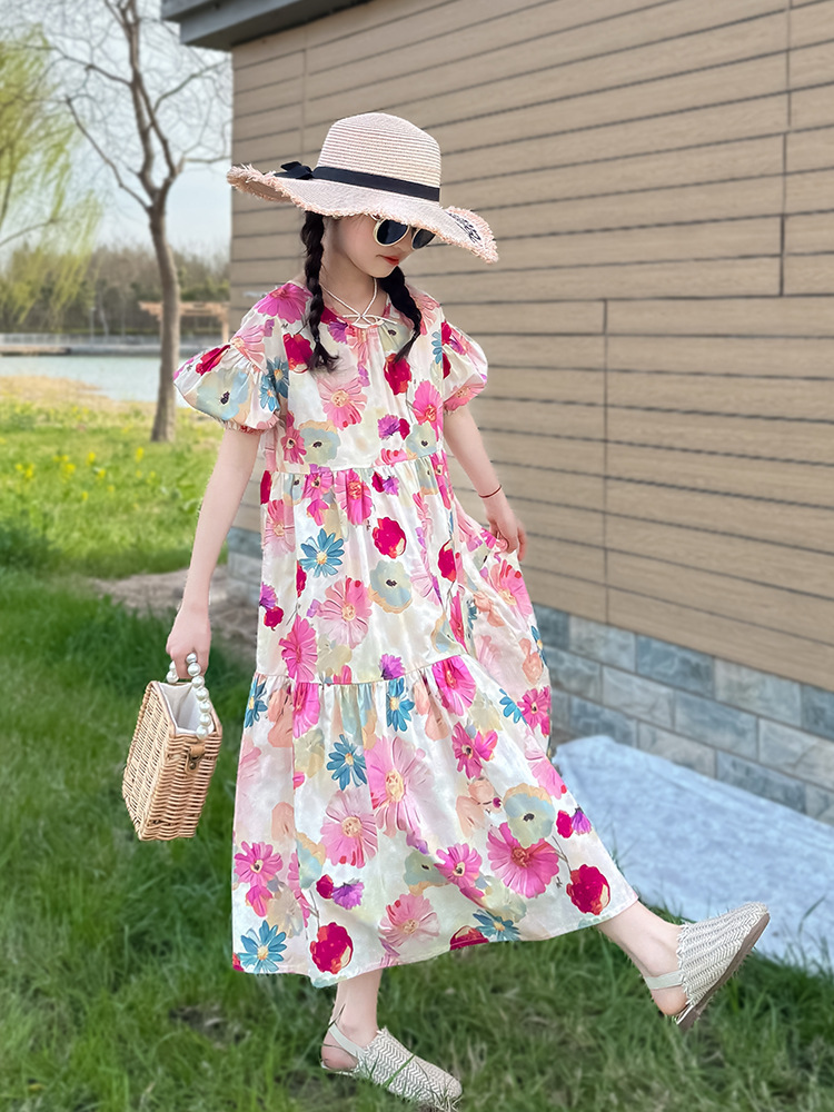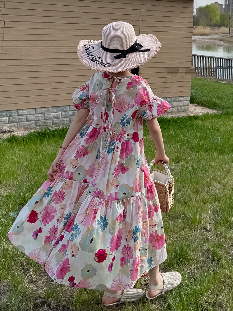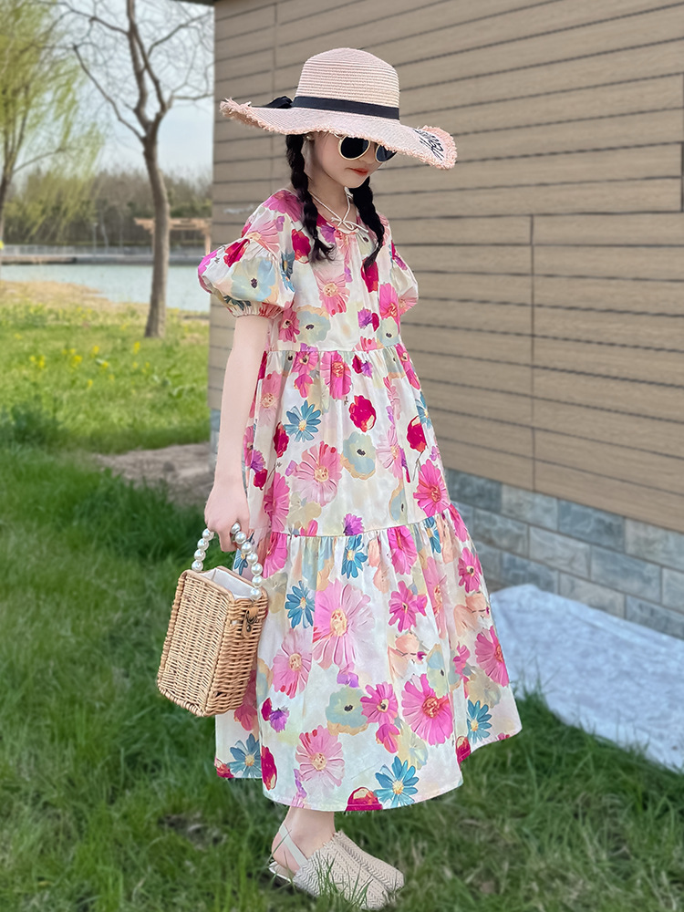 QZ3430 여름 새 부모-어린이 착용 소녀 면 꽃 반팔 원피스 A 라인 스커트 국경 간 공급스토어 가기