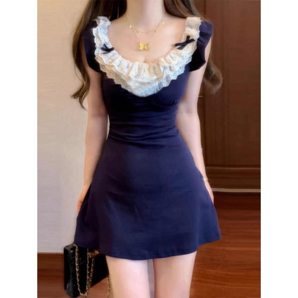 프랑스 여름 순수한 욕망 작은 비행 소매 원피스 여성의 봄 새 소녀의 작은 허리 뜨거운 소녀의 엉덩이 스커트