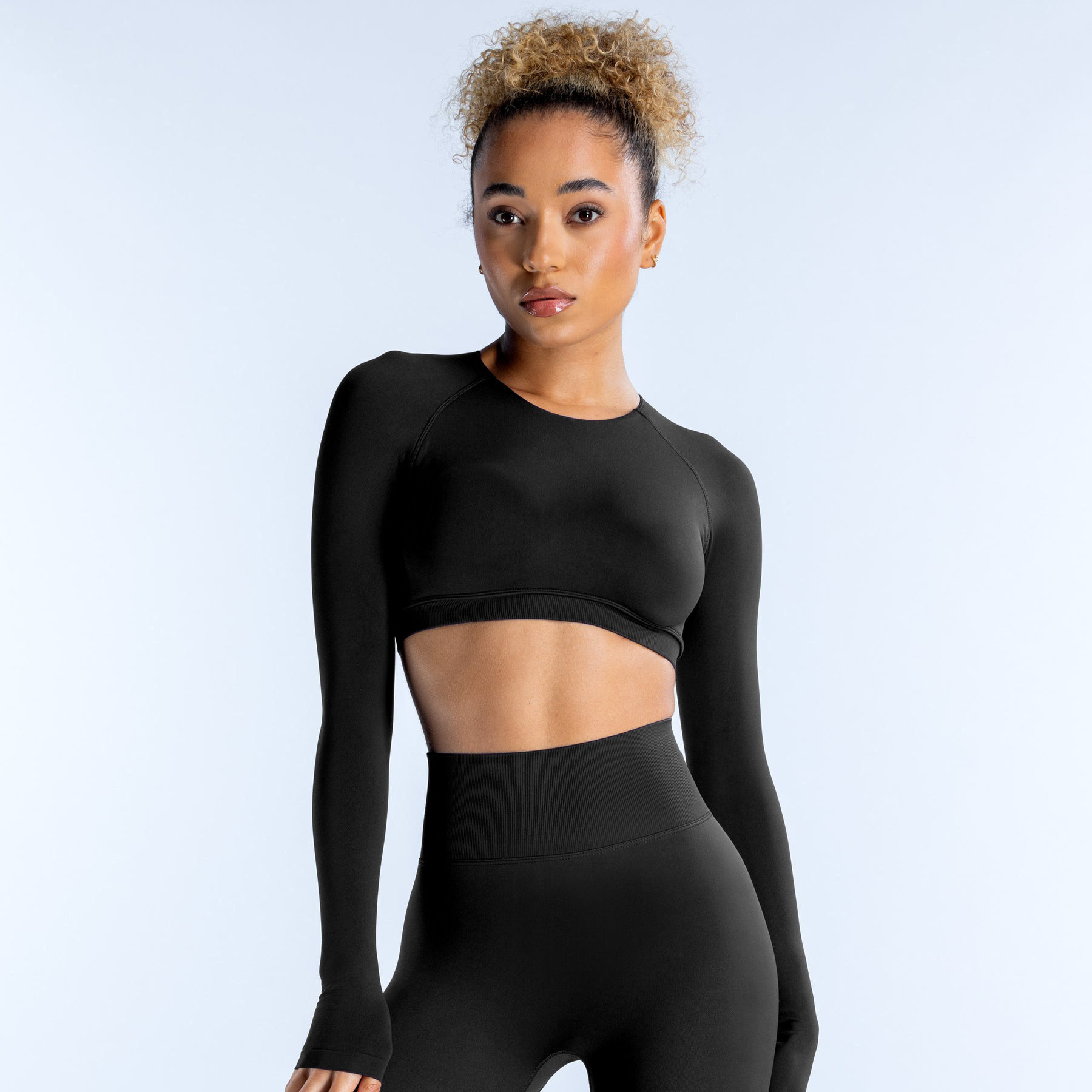 DFYNE AliExpress 폭발성 라운드 넥 쇼트 탑 스포츠 통기성 할로우 백 요가 피트니스 옷 긴 소매 여성
