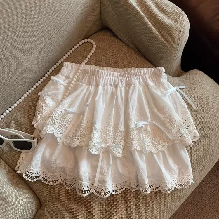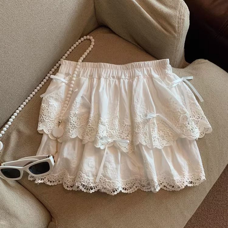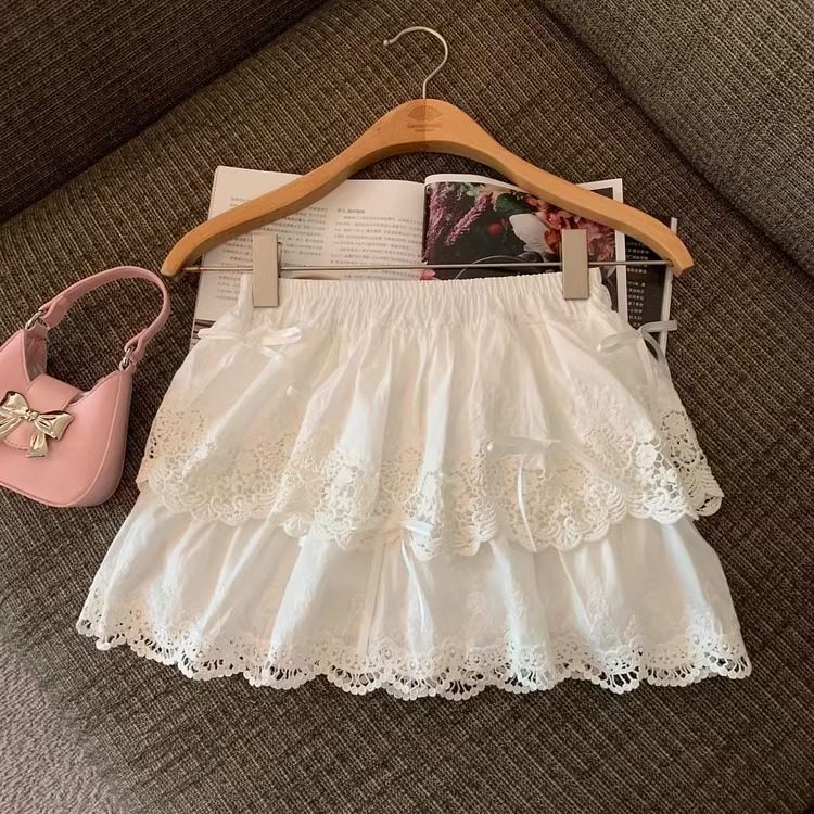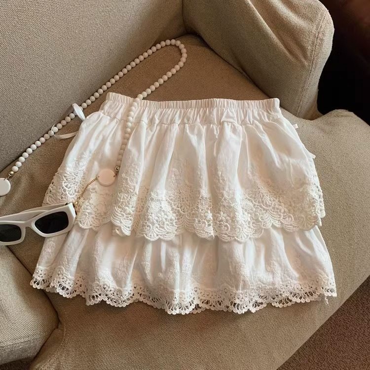 여성을위한 흰색 레이스 스플 라이스 스커트 2025 여름 새로운 한국 달콤한 스타일 활 자수 케이크 스커트스토어 가기